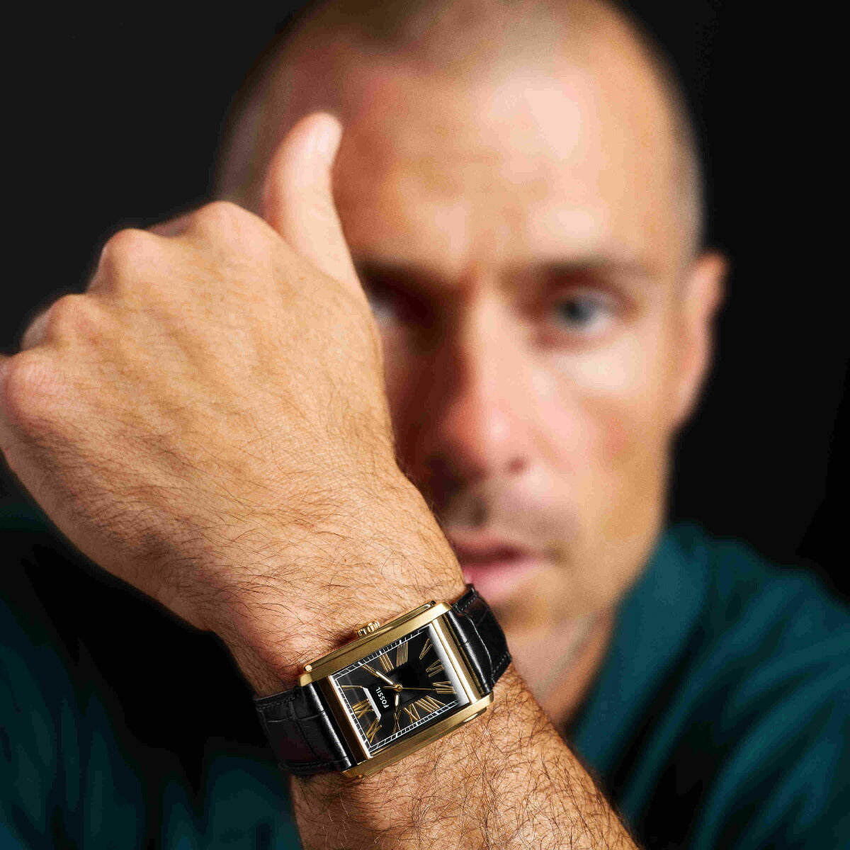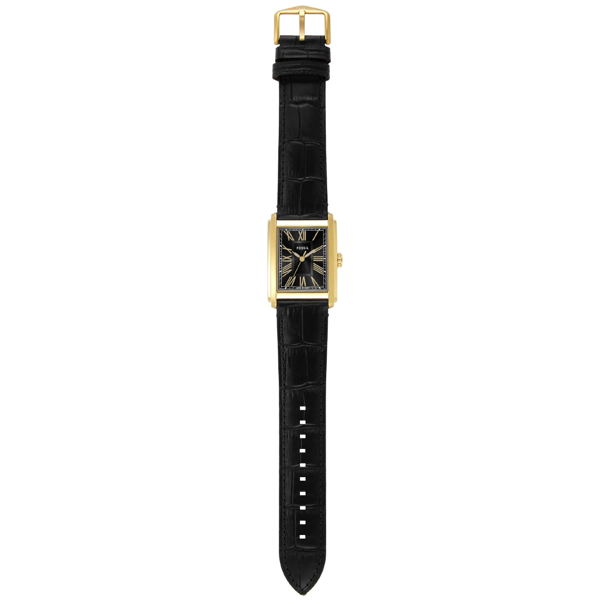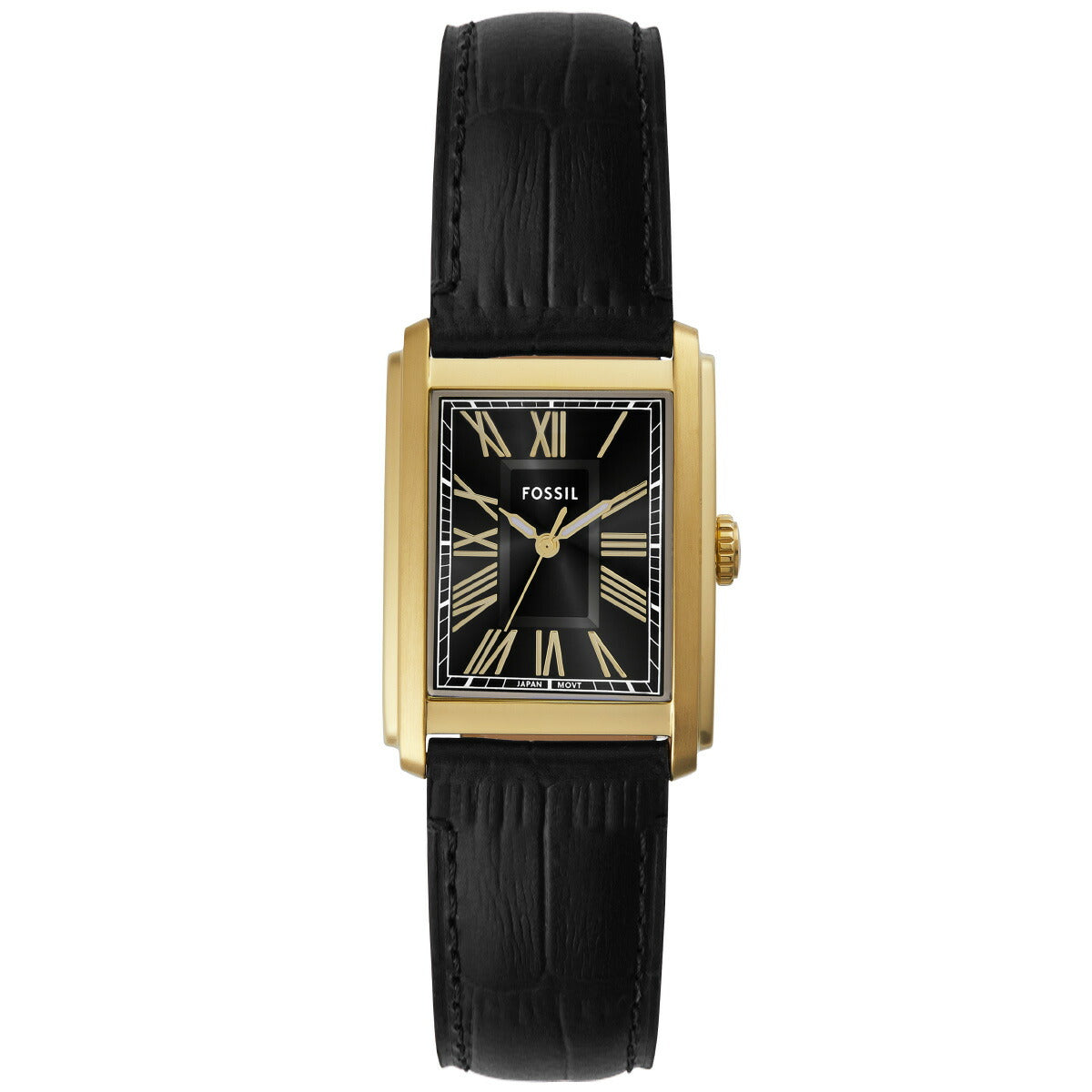 42mm径のケースに三針ムーブメントを搭載したCARRAWAY。ブラックのサンレイダイヤルに、ブラックのクロコレザーストラップを組み合わせました。Fossilのレザー製品は、Leather Working Group(LWG)を通じて責任あるものづくりを支援しています。