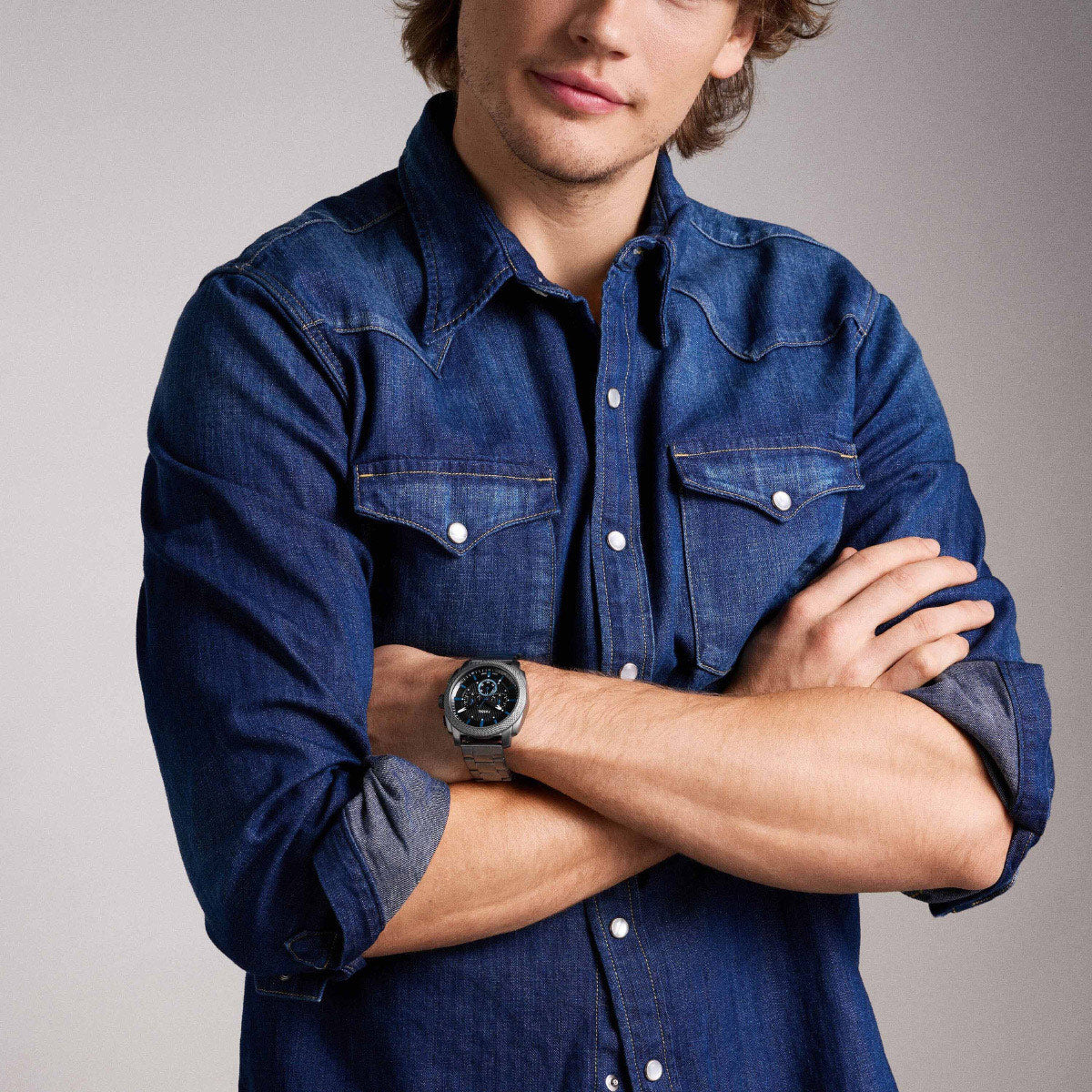 クラシックなアメリカの機械にインスパイアされたMACHINEクロノグラフ。印象的なローレット加工を施したトップリングが目を惹くデザインです。大胆な44mm径のケースに、質感のあるディテールを施した艶消し仕上げのブラックのダイヤルを組み合わせました。ミネラルクリスタルのフェイスが保護を提供する、男性的な魅力が際立つモデルです。精確なクォーツクロノグラフムーブメントを搭載したこのラギッドなタイムピースは、丈夫なガンメタルのステンレススチールブレスレットを備え、耐久性にも優れています。インダストリアル風のデザインが冴える存在感のあるウォッチです。