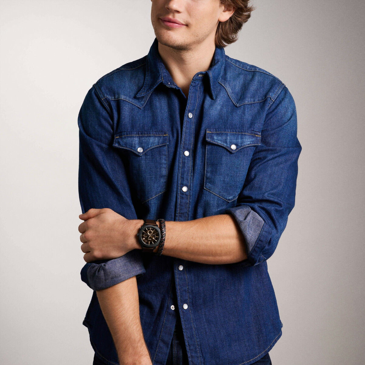 MACHINEクロノグラフは、印象的なローレット加工を施したトップリングが注目を集めます。大胆な44mm径のケースに、質感のあるディテールを施した艶消し仕上げのブラックのダイヤルを組み合わせました。アンバートーンのミネラルクリスタルのフェイスが保護を提供する、男性的な魅力が際立つモデルです。精確なクォーツクロノグラフムーブメントを搭載したこのラギッドなタイムピースは、リッチなブラウンのレザーストラップを備え、耐久性にも優れています。おそろいのブラック&ブラウンのブレイドレザーブレスレットを組み合わせたギフトに最適なセットです。