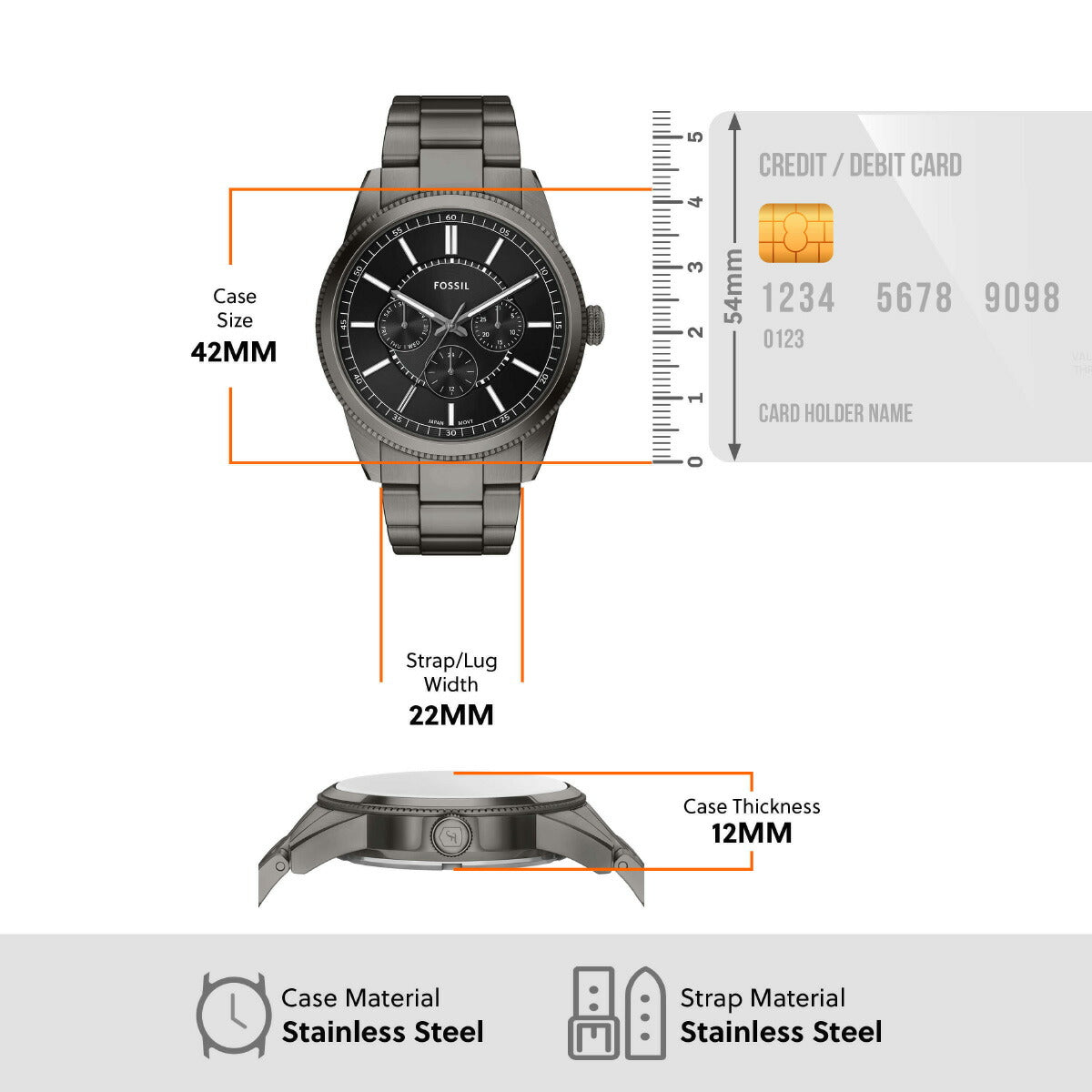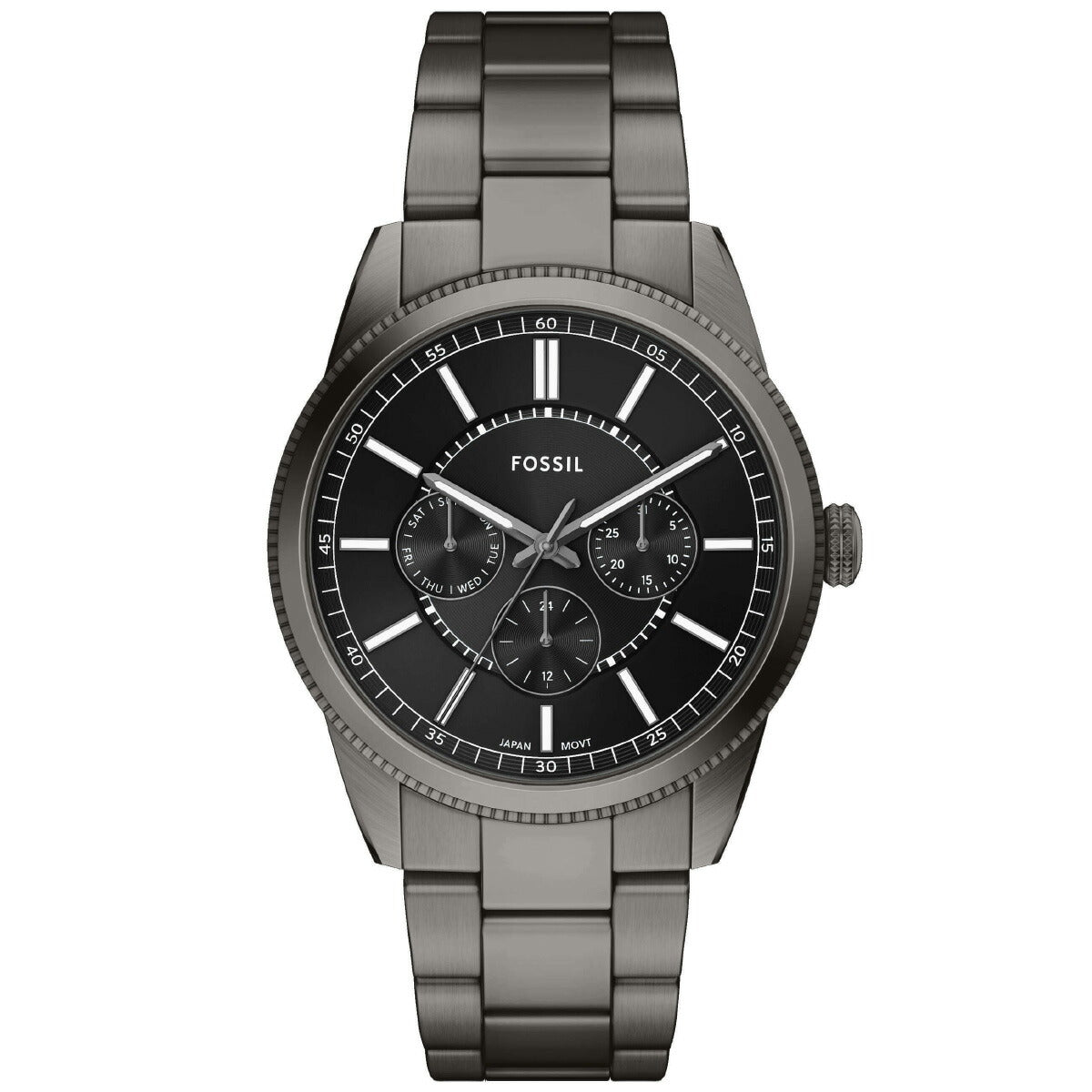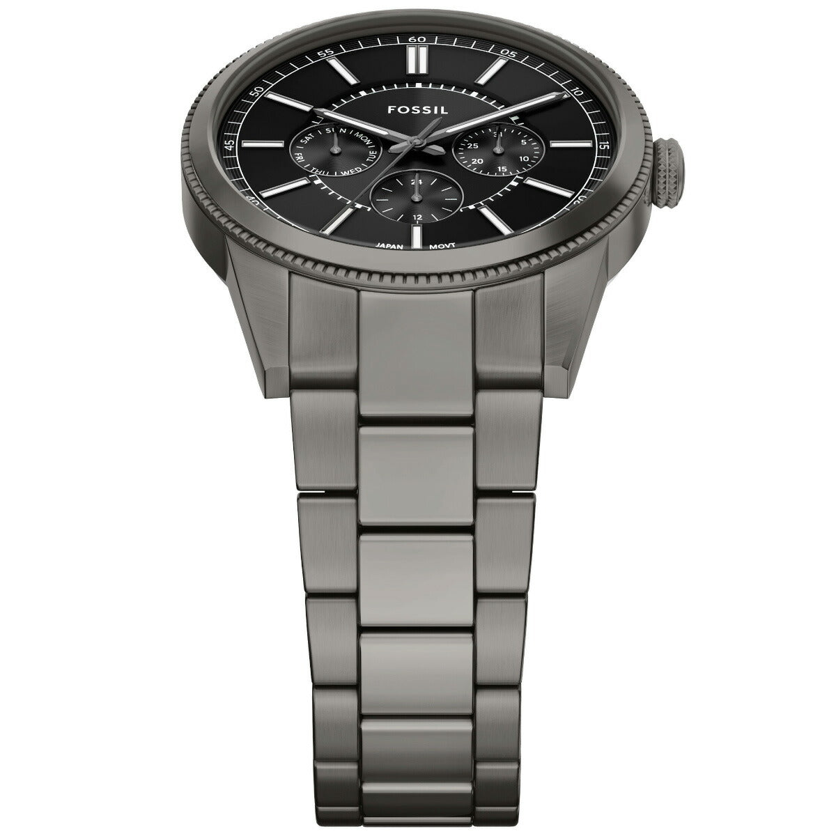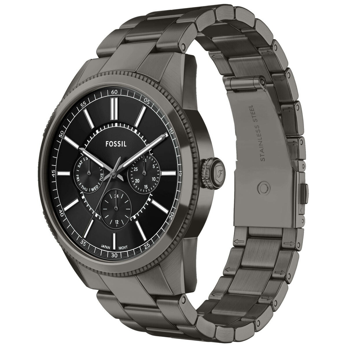 ガンメタルトーンのステンレススチール製ブレスレットとケースが、この多機能ウォッチの洗練されたモノトーンルックを演出。ブラックのダイヤルには深みを増すサンレイ仕上げが施され、曜日、日付、24時間表示の実用的なサブダイヤルがそれを引き立てています。精巧にデザインされたラウンドケースは、ミニマルなブレスレットとシームレスに組み合わされ、クリーンなラインと多彩なスタイリングを実現します。