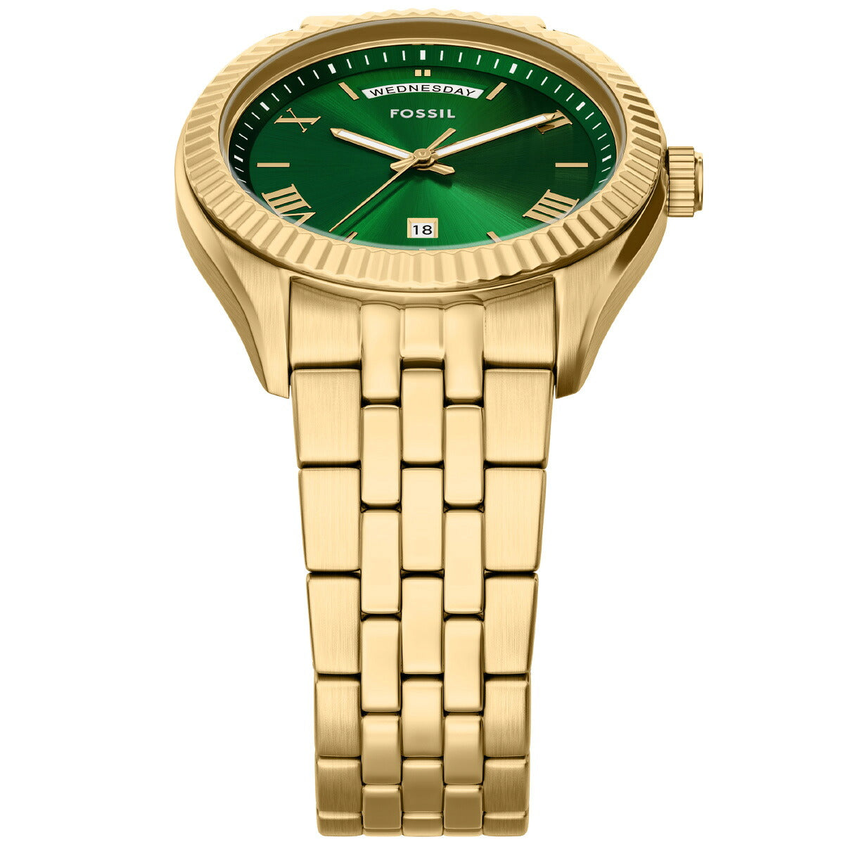 タイムレスな魅力をたたえ、モダンクラシックを体現するCAMPBELLウォッチ。フォルムと機能性の見事なバランスを実現しています。ゴールドトーンのステンレススチール製ケースには、リッチなグリーンのサンレイダイヤルが配され、曜日と日付のウィンドウがスケジュール管理をサポートします。洗練されたディテールで考え抜かれて作られたこのブレスレットウォッチは、洗練された素材とモダンな機能性のバランスが絶妙です。