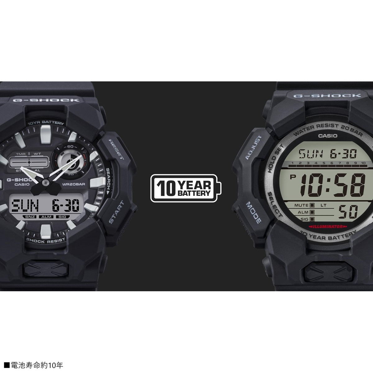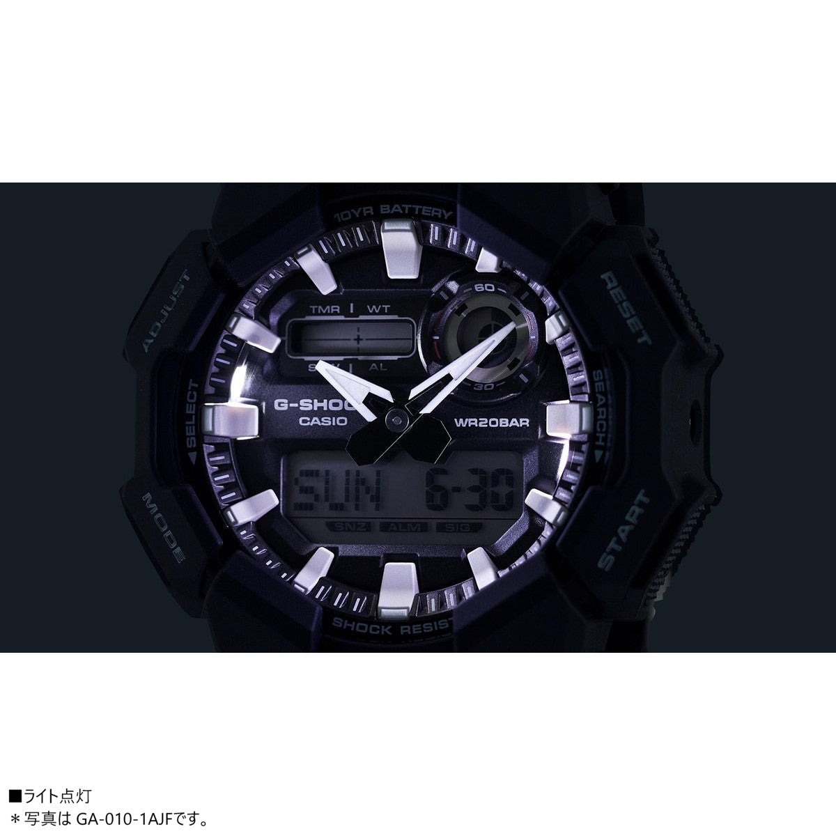 1983年の発売以来、飽くなき強さを求めて進化を続けるタフネスウオッチG-SHOCKから、10年バッテリーの新定番モデルです。ワイドフェイスとビッグケースで、10年バッテリーを搭載したデジタルアナログコンビモデルのGA-010は、ワールドタイム、ストップウオッチといった基本機能をはじめ、大型フロントボタンで操作しやすいスーパーイルミネーターにより暗闇での視認性も確保します。バイオマスプラスチックやロングライフバッテリーにより、環境にも配慮したモデルです。ケース素材に、軽量ながら樹脂の概念を超える高剛性を発揮するカーボンファイバー強化樹脂入りファインレジンを使用。衝撃による破損、変形を防ぐことで、内部に配置したモジュールを保護します。ワークスタイルにも合わせやすいブルーグリーンカラー。センターケース・ベゼル・バンドにバイオマスプラスチックを使用。カジュアルスタイルからワークスタイルまでアクセントになるクールなデザインです。