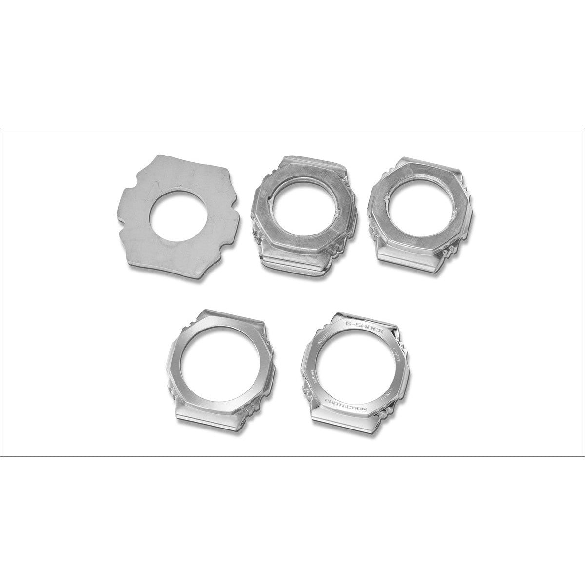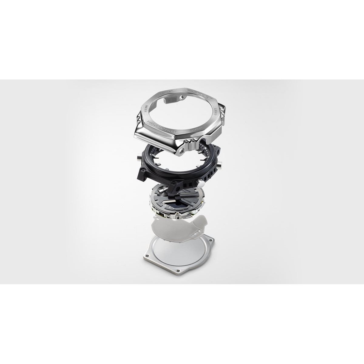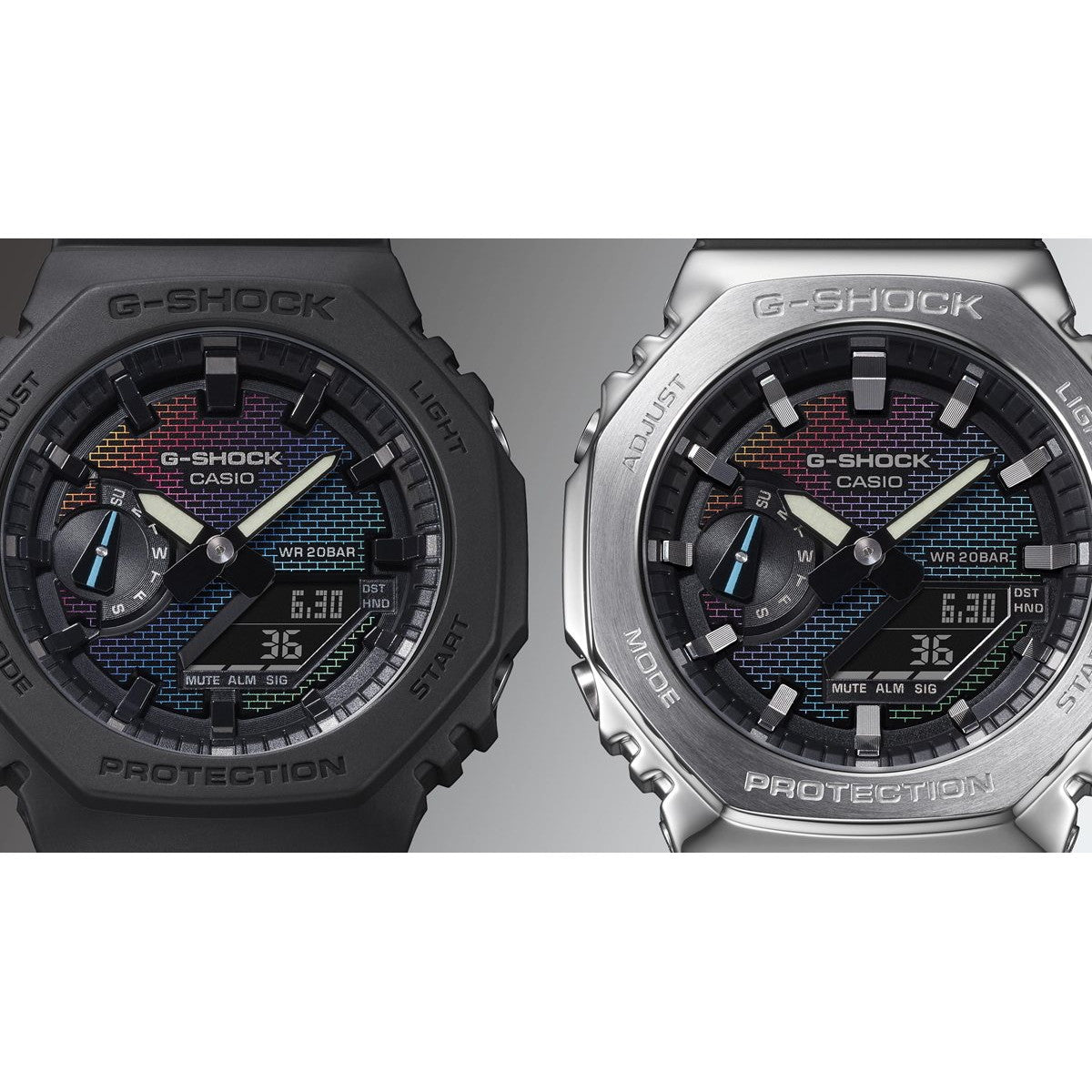1983年の発売以来、飽くなき強さを求めて進化を続けるタフネスウオッチG-SHOCKから、ガラス板、文字板に蒸着を施したモデルです。G-SHOCKのアイコニックなデザインであるレンガパターンを光の反射によりさまざまな色合いを見せるレインボーカラーで表現。壁を乗り越えて、常に限界を超えて挑戦していくタフネススピリットを表現しました。ベースモデルには、オクタゴンベゼルの2100シリーズを採用し、G-SHOCKの初号機にも使用されているレンガパターンを印刷しました。文字板印刷には、シルバー蒸着にレインボーカラーを塗装し、レーザー処理により部分的に剥離させレンガパターンをデザインしました。ベゼルとバンドにバイオマスプラスチックを使用しています。見る角度によっていろいろな表情になり、ファッションアイテムとしても活用できるクールなデザインとなっております。