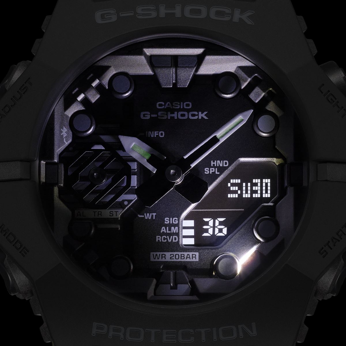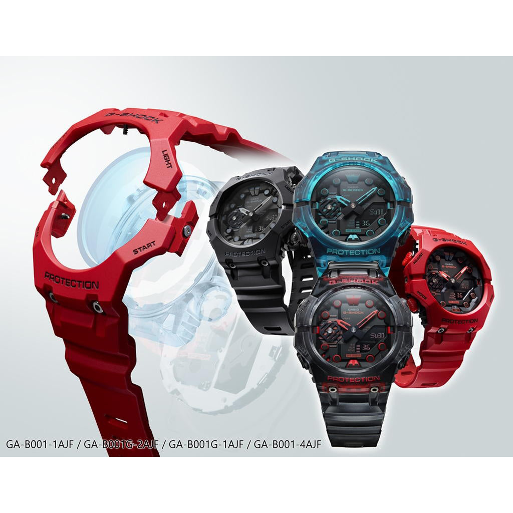 1983年の発売以来、飽くなき強さを求めて進化を続けるタフネスウオッチG-SHOCKから、スマートフォンリンクを搭載した新モデルGA-B001シリーズが登場。GA-B001は、上下別々のベゼルから構成されたデザインを採用した新モデルで、フェイスもこれまでのG-SHOCKにはない時字や9時側ディスク針でディテールにもこだわった仕上がりとなっています。定番のブラックを採用し、スケルトンの樹脂に、グラデーションを施したファッションからアウトドアシーンまで幅広く活用できるカラーリングにまとめています。また、Bluetooth(R)搭載により、専用のアプリを使って、スマートフォンと連携し、アプリ内の情報更新を時計の表示でお知らせします。スマートフォンリンクと新デザインで新たなタフネスを実現したG-SHOCKです。