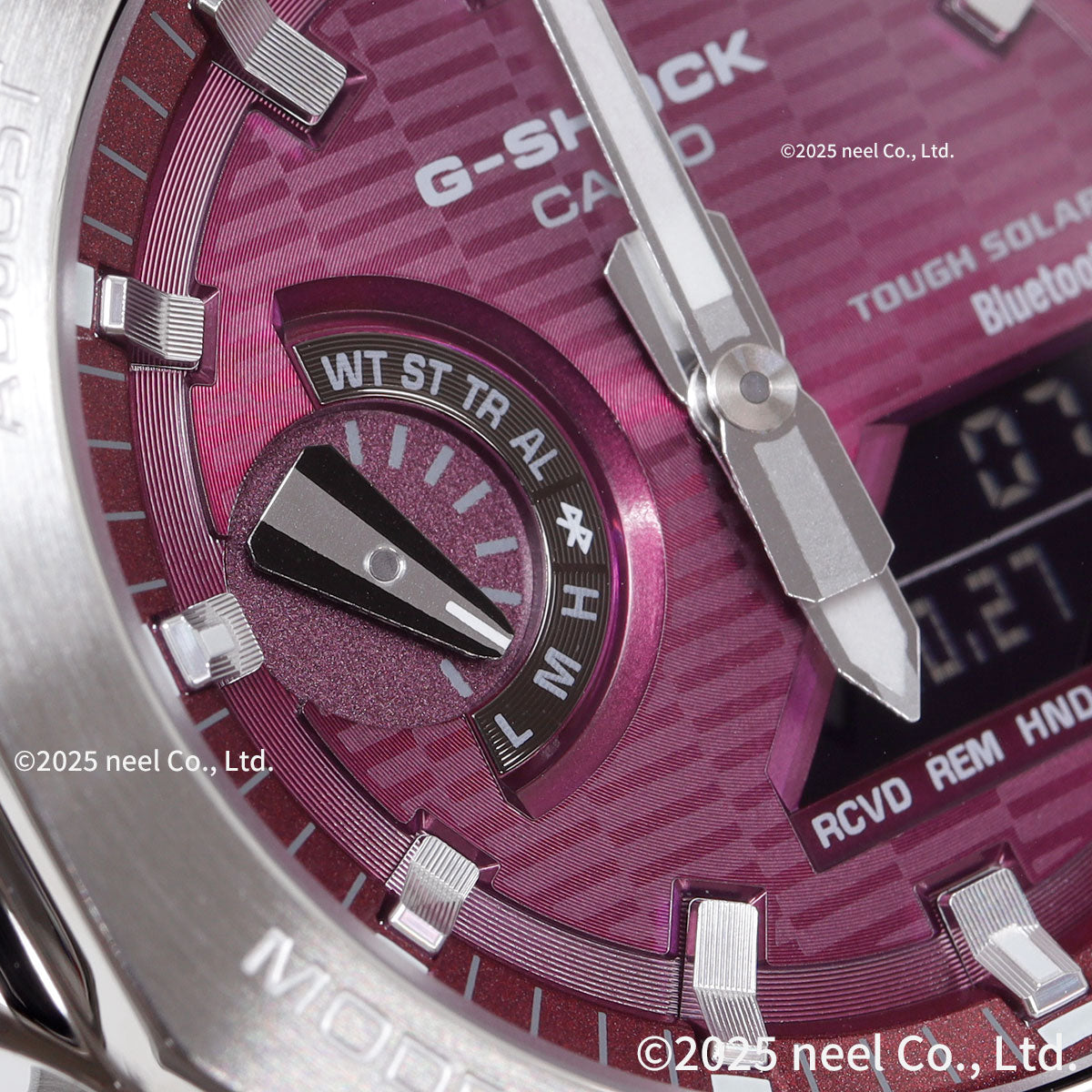 1983年の発売以来、飽くなき強さを求めて進化を続けるタフネスウオッチG-SHOCKから、2100シリーズの特徴であるスリムなサイズ感をキープしながら、スマートフォンリンクとタフソーラーを搭載したメタルベゼルのモデルです。ケース、バンドの主な樹脂パーツにはバイオマスプラスチックを採用し、環境にも配慮しました。GBM-2100A-4BJFは文字板にバーガンディ蒸着でインデックスにはシルバー蒸着を施し、デザイン性を高めています。カジュアルシーンからビジネスシーンまで幅広く活用できる、タフネスとデザイン性を両立したモデルです。