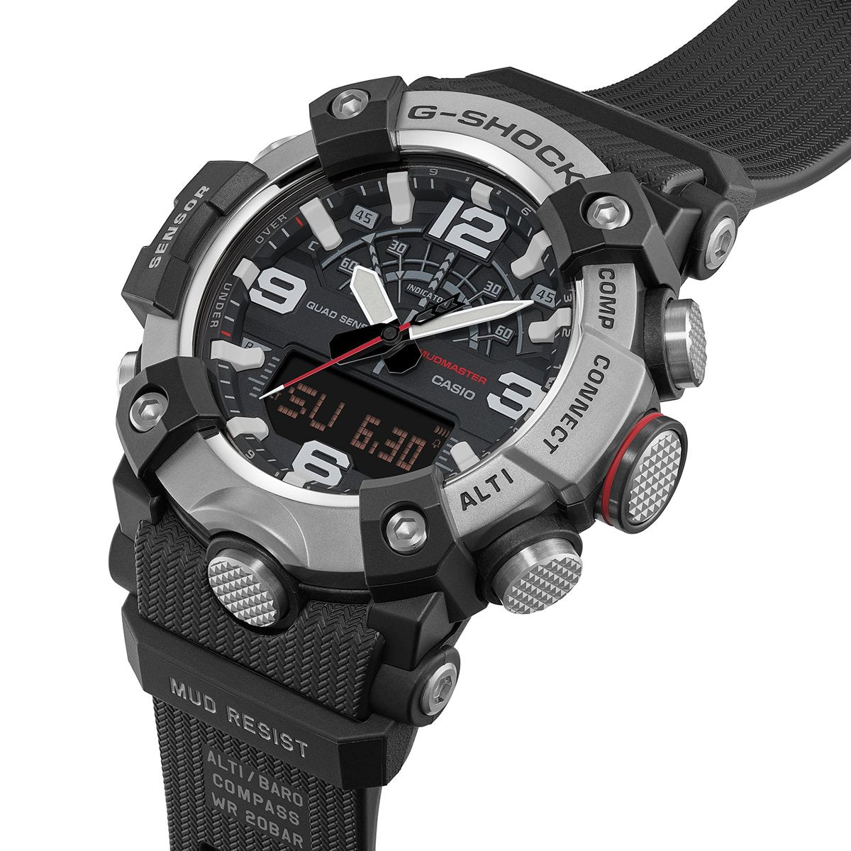 1983年の誕生以来タフネスを追求し続けているG-SHOCKから、ベゼルに堅牢性の高い金属パーツを採用したMASTER OF G MUDMASTERです。MASTER OF G(マスターオブG)は、G-SHOCKの中でも過酷な状況に耐え得るタフな機能をプロフェッショナルに向け強化したラインです。その中でもMUDMASTERは、瓦礫や土砂が山積・散乱するようなハードな環境での使用を想定したタフネスウオッチとして、極限の環境下で活動するレンジャーやレスキュー隊から高い評価と信頼を獲得してきました。GG-B100XM-1AJFは、ステンレススチール製のシルバーベゼルにホーニング加工を施すことで泥や砂塵に対する耐傷性を高め、光の反射を抑えた落ち着きのあるマットな質感に仕上げました。ケースには高剛性素材のカーボンファイバー強化樹脂を使用することで破損・変形を抑制し、高い気密性と耐衝撃性を確保。加えて泥の侵入を防ぐフィルター、ステンレススチール製のパネルバックと、衝撃に強いグラスファイバー強化樹脂のバックカバーを装備し、高い防塵・防泥性能を備えています。機能面では方位、高度/気圧、温度計測に加え歩数計測が可能。また専用アプリによる簡単時計設定に加え、時計で取得した高度とスマートフォンで取得した経路をアプリに自動記録できるミッションログなどの役立つ機能を複数搭載しています。すばやい判断および的確な行動をサポートするタフネスウオッチです。