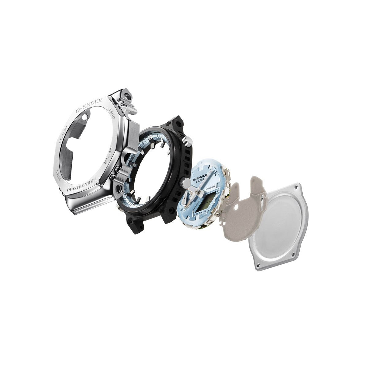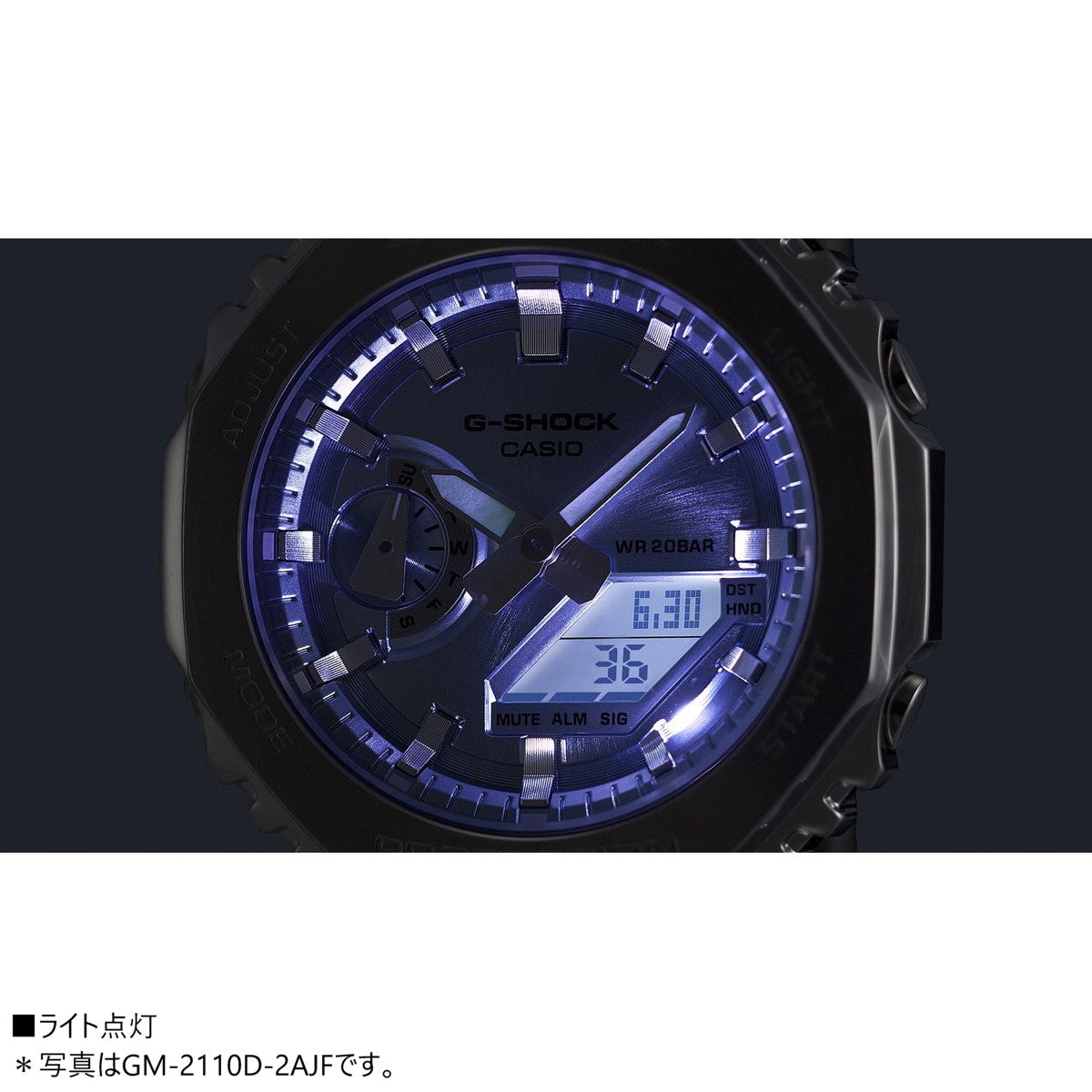 1983年の発売以来、究極の強さを求めて進化を続けるタフネスウオッチG-SHOCK。初代モデル“DW-5000C”のコンセプトを受け継いだデジタル・アナログコンビネーションモデルGA-2100のベゼルとバンドを金属素材にアップデートしたGM-2110Dです。緻密な鍛造工程を経て、切断と研磨だけでなく均一な八角形成形による金属製ベゼルを採用し、タフな構造はそのままに無駄を省いたシンプルなデザインとなっています。ケース素材には、高剛性を発揮するガラス繊維入りファインレジンを使用し、G-SHOCKコンビネーションモデルの中で最薄となる厚さ11.8mm。メタルバンドで、ビジネスシーンにも対応できる仕様になっています。文字板には、メタル素材の文字板を採用し、トレンドのオレンジもラインアップしました。G-SHOCK初代モデルのDNAを受け継ぎながら、デザイン、フォルム、サイズ、さらに耐衝撃性能まで徹底的にこだわったGM-2110Dです。