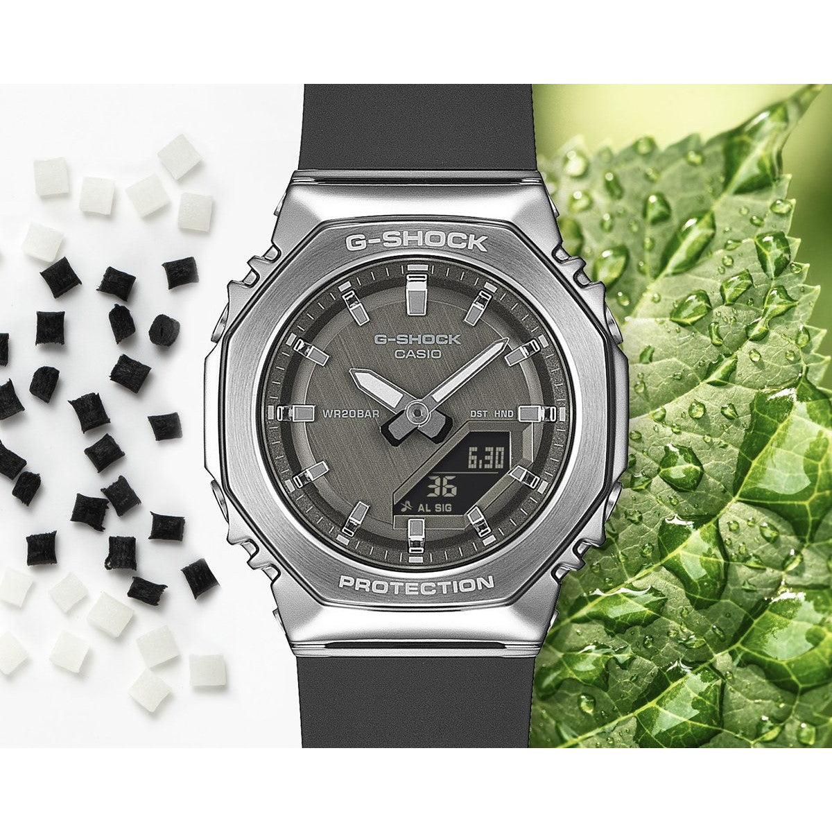 メタルの八角形フォルムが印象的なGM-S2110シリーズにシンプルで使いまわしやすいカラーリングのモデルが仲間入り。定番色でもある「黒」の文字板には、アクセサリー等でもよく見られるクロスチェック柄のヘアライン仕上げを施し、シンプルながらも表情が加わりデザイン性を高めています。コンパクトなサイズで腕の細い方も快適に着用でき、普段使いでも、ファッションシーンでも幅広く活用しやすいモデルです。特徴的な文字板の仕上げが印象的で、コーディネートに華やかなアクセントを加えます。