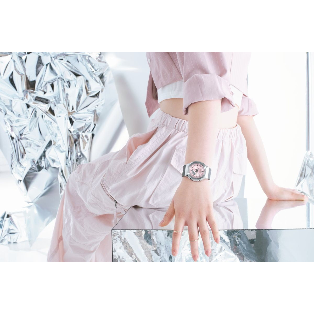 人気の八角形フォルムにトレンドのカラーダイアルを取り入れたGM-S2110です。GM-S2110は、GM-S2100と比べベゼルトップやインデックスの幅が細くなっており、さらに装飾を抑えたダイアルデザインにすることでミニマルで洗練された印象を与えます。ブルー、グリーン、ピンクの3色展開で、黒いバンドと組み合わせることで落ち着いたクールなコーディネートにも合わせやすいカラーをラインアップ。文字板には蒸着処理を施したメタル素材を採用し、高級感があり美しい発色を実現しました。バンドを短くして装着可能な腕周り長さがGM-S2100と比べ10mm以上短くなっており、手首の細い方にもフィットするよう装着性を高めました。バンドの樹脂パーツにバイオマスプラスチックを使用。原料に再生可能な有機資源を使用し、環境負荷低減への貢献が期待されています。洗練されたミニマルデザインが、スタイリッシュからカジュアルまで様々な装いを美しく彩ります。