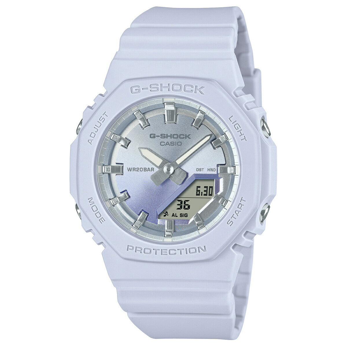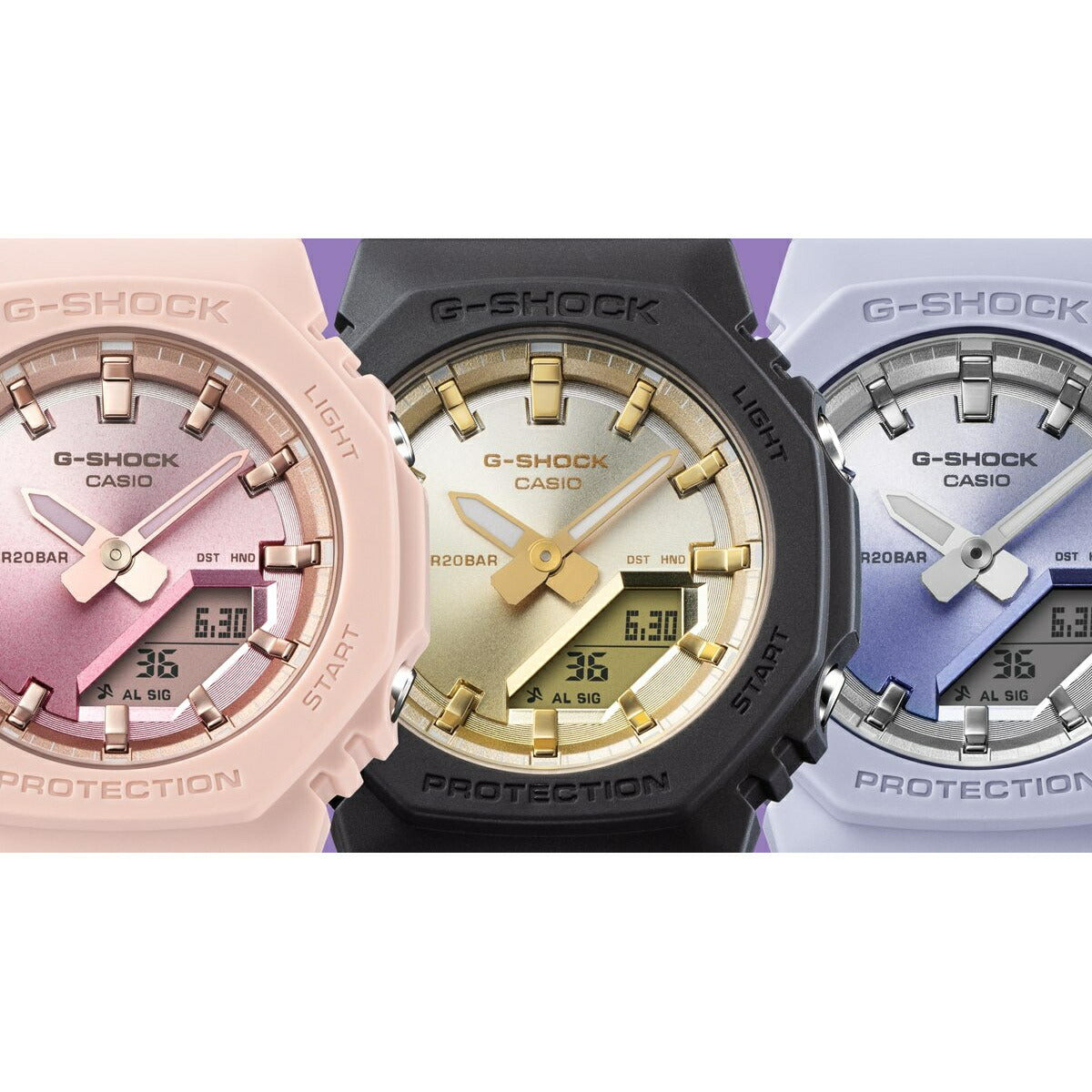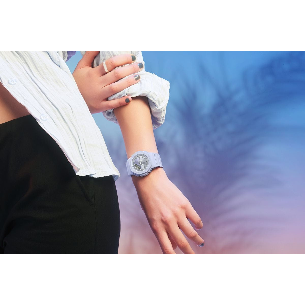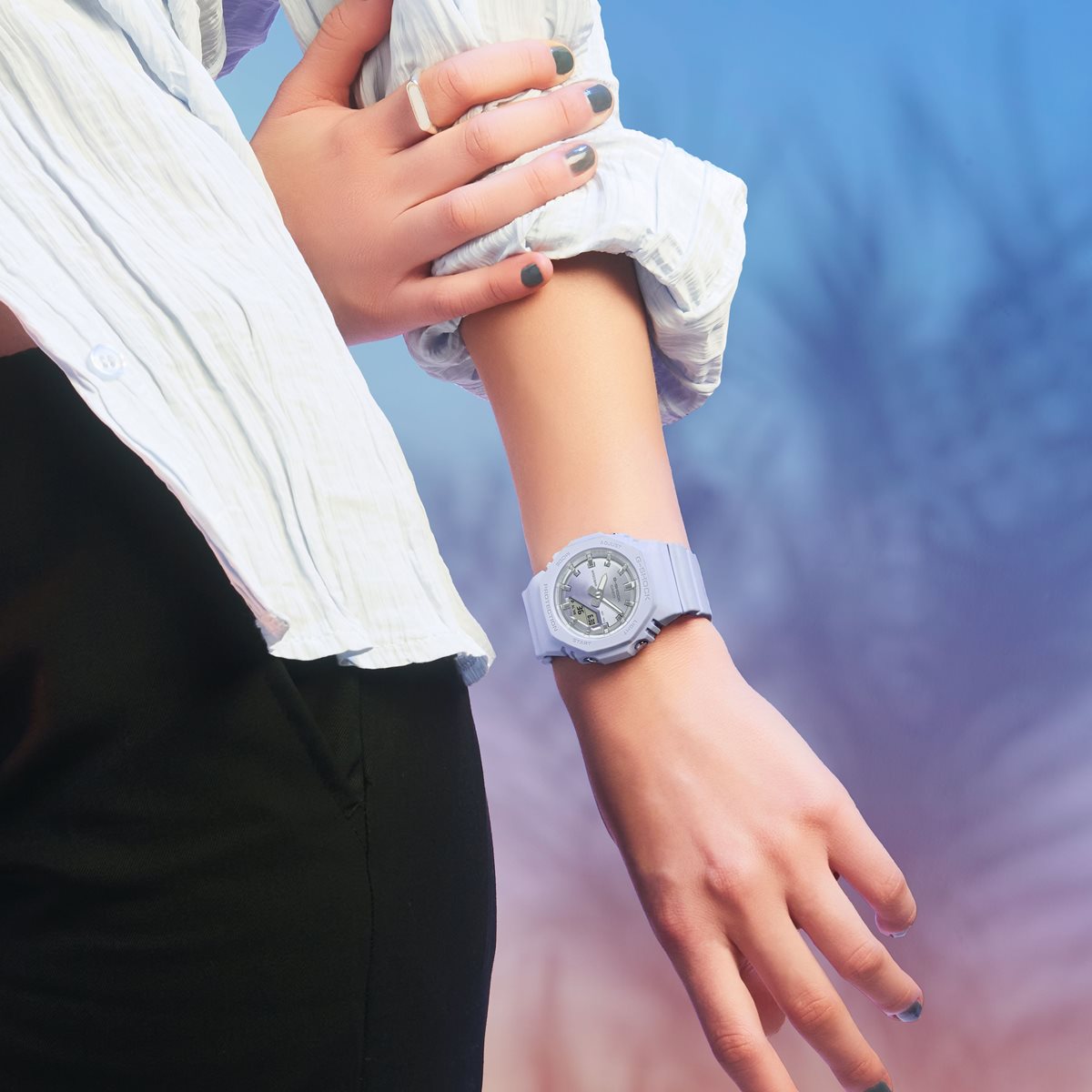 飽くなき強さを求めて進化を続けるタフネスウオッチG-SHOCKから、サンセットビーチの美しい情景をテーマにしたモデルです。夏の太陽が1日の終わりに見せる美しい輝きを、ダイアルにあしらった光沢感のあるグラデーション蒸着で表現しました。ベースモデルは、人気のデジタル・アナログコンビモデルGMA-S2100を更に小型化したGMA-P2100。バンドの長さも短くすることで、手首の細い方にもフィットするよう装着性を高めました。美錠とサイドボタンもステンレス素材を使用し、質感を高めています。シンプルでミニマルな印象になるように仕上げました。ベゼル、バンドの主な樹脂パーツにバイオマスプラスチックを採用。原料に再生可能な有機資源を使うことで、環境負荷低減への貢献が期待されています。リゾートスタイルのアクセントとして、手元に華やかさをプラスします。