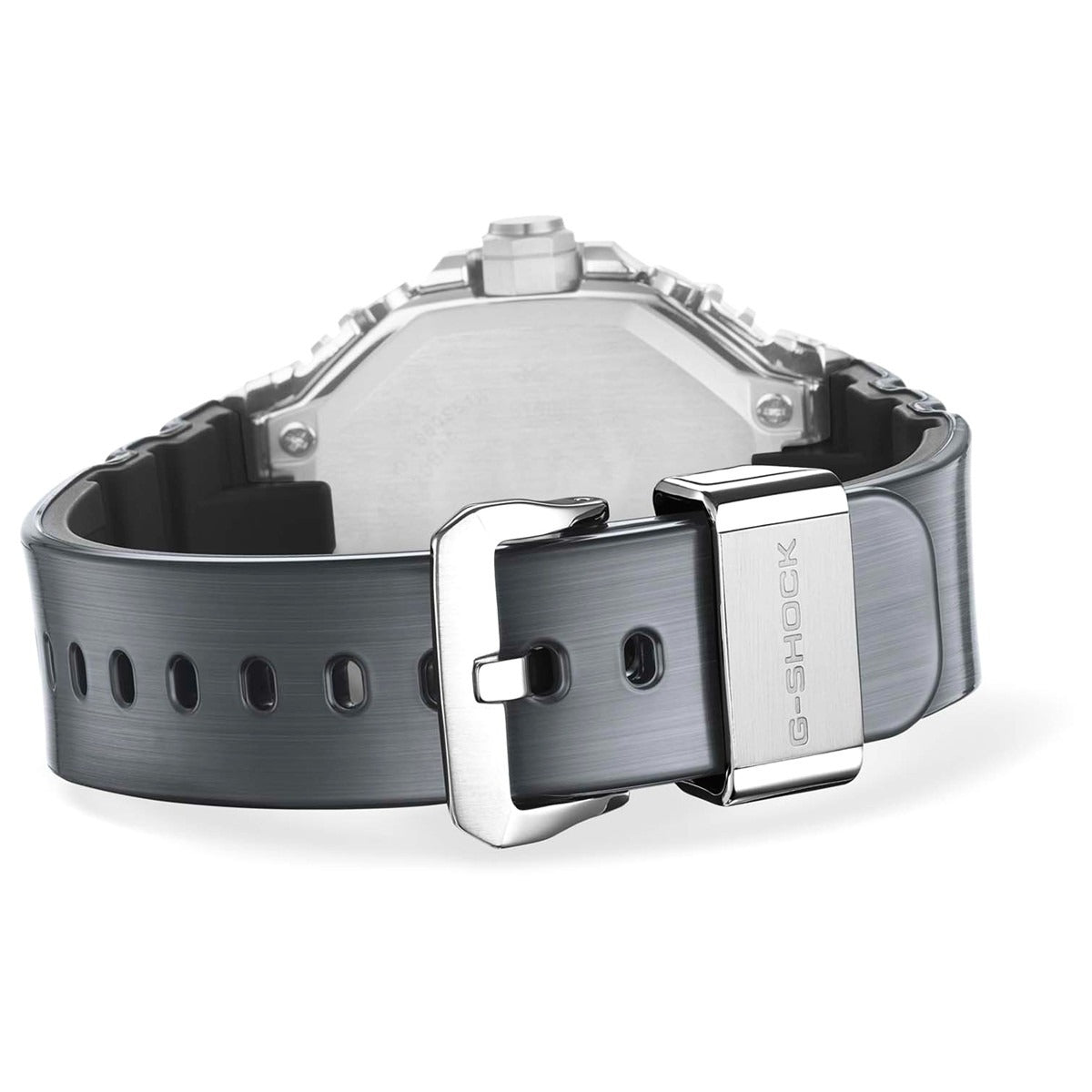G-SHOCK初代モデル“DW-5000C”のコンセプトを受け継いで開発されたアナログ「2100」シリーズのフルメタルクロノグラフです。ケース、ベゼルにステンレススチールを採用しながら、1983年に誕生したDW-5000Cにも採用された八角形のベゼル形状を継承しています。ベゼルとケースの間に、ファインレジン製の緩衝材を実装することで、メタル外装による耐衝撃構造を可能にしています。ベゼルは、手間のかかる鍛造・切削・研磨加工を経て、立体的に成形し、天面を円周状のヘアライン、斜面をミラー研磨で美しく仕上げています。インデックスやインダイアルリングには微細加工技術による繊細な造形と、蒸着加工を施すことで高い質感に仕上げました。バンドには、やわらかく着け心地の良いシリコーン素材をウレタン素材で覆うことで耐摩耗性も高めたタフシリコーンバンドを採用しています。ウレタンの裏面には、ガンメタリックの蒸着を施し、表面はヘアラインで仕上げフルメタルケースに調和させています。高密度実装技術によりスリムで高機能なモジュールを搭載することで、薄型化も実現。着け心地の良さにもこだわりました。Bluetooth(R)通信機能により専用アプリと接続し、時刻情報を取得し正確な時を刻みます。タフソーラー、高輝度なLEDライトなど実用的な機能も兼ね備えています。