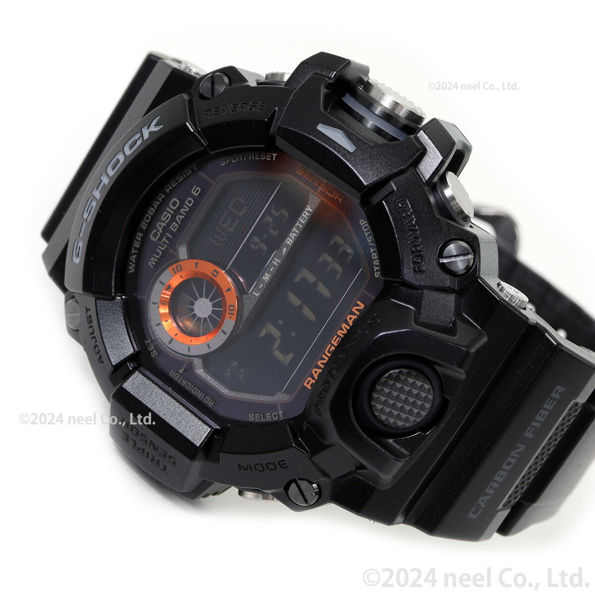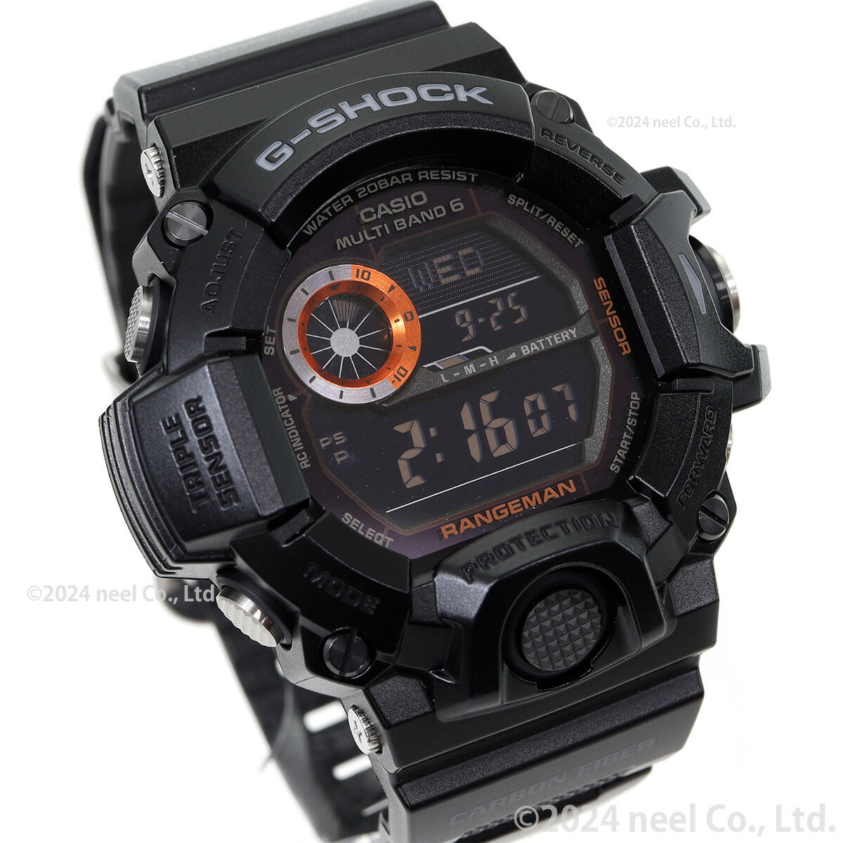 飽くなきタフネスの追求と、極限への挑戦を続ける、「G-SHOCK マスターオブG」シリーズから、地球上で最も苛酷な環境のひとつである高温多雨のジャングルや密林での使用を想定したNewモデル「レンジマン」が登場。極限の環境下で活動するレンジャーやレスキューたちがサバイブ・ミッションの遂行をする上で必要な情報を素早く確実に表示させるため、新しいタフネス構造を採用し、G-SHOCKとしては初となるトリプルセンサーを搭載しました。新マスターオブG「レンジマン」のために新たなタフネス構造である「ボタンガードシリンダー構造」を開発。メタル製の大型ボタンへの衝撃を軽減し、スムーズで正確な操作を可能にする、シリンダー型の形状をした独自のボタンガードを採用しました。また、使用頻度が高い、高度・方位・気圧/温度の情報を表示させるセンサーボタン部分には、メタル製のシリンダーガードを使用することで、横からの衝撃の緩和、異物の進入防止、よりスムーズで正確なボタン操作を可能にしました。苛酷な環境下で活躍するスペシャリストの使用を想定した機能・操作性・仕上げも追求。アラームやタイマーなど、どのモードの状態であっても、センサーボタンを押すと、直前に使用したセンサーモードをダイレクトに表示させられる機能を新たに搭載しました。また、各モードに3段階の報知音を与え、ボタン操作時にどのモードを起動させたのかが感覚的に確認できます。更に作戦の遂行時や緊急時に、ワンプッシュで時刻を簡単にメモリーできるダイレクトタイムスタンプや、同様にワンプッシュで素早く起動できるストップウオッチを備えました。引張耐久力に優れる「カーボンファイバーインサートバンド」や、メタルパーツをボタンやサイドビス、遊環に採用し、耐久性の追求と同時にエッジの効いた力強いタフネスデザインとしました。極限に挑むため、よりタフに、より機能進化を果たした、マスターオブGレンジマンの登場です。
