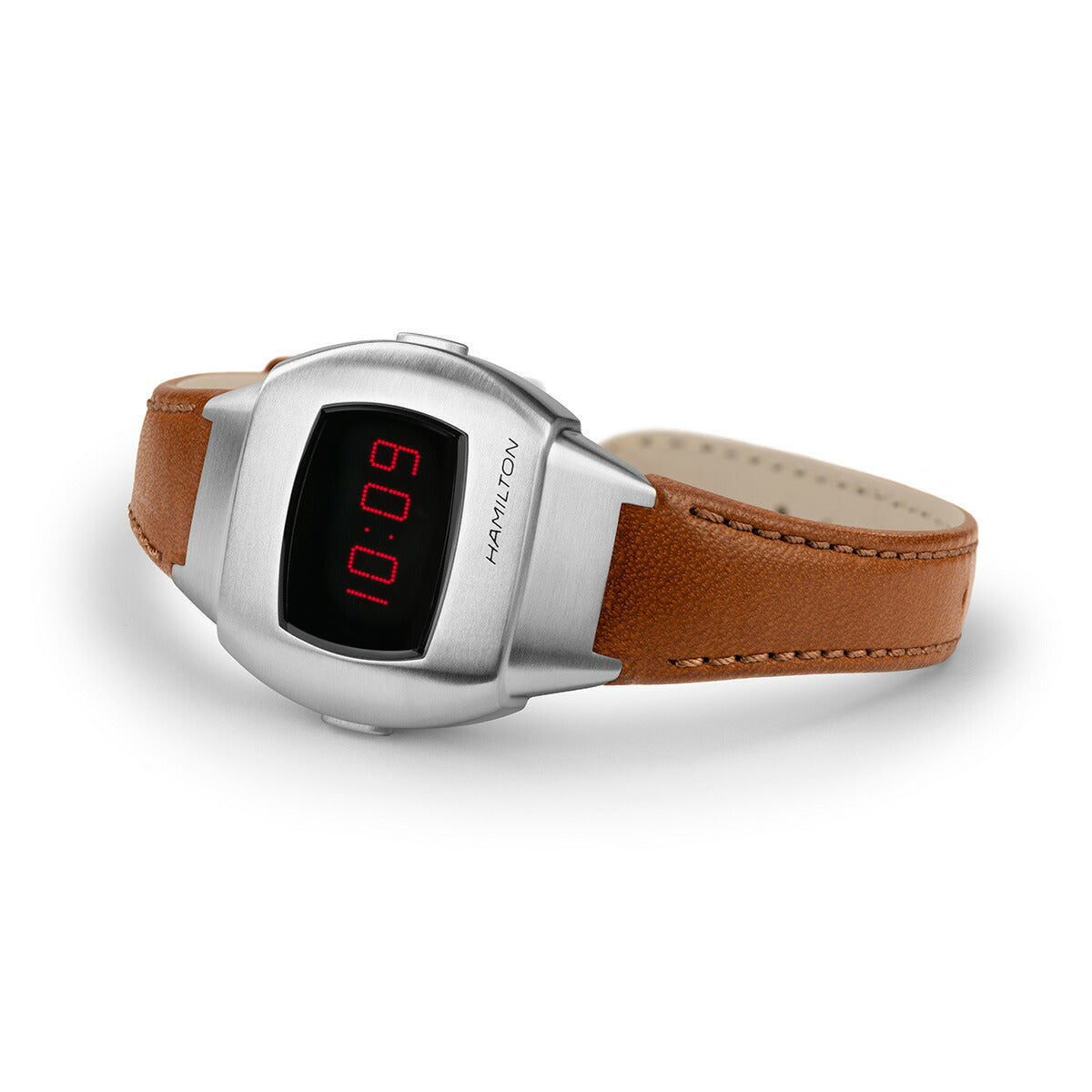 クールさはそのままに、現代に合わせてアレンジした「PSR」。世界を一変させた初のデジタルウォッチと変わらず、紛れもないスタイルで戻ってきました。1974年に初めて登場したクッション型「ハミルトン パルサー」モデルのビンテージシェイプからインスピレーションを得て、宇宙まで行くことができる現代を象徴するモデルであり続けています。新たなクォーツモジュールを搭載した「PSR 74」には、同じハイブリッドディスプレイテクノロジーが採用され、反射型LCD(液晶ディスプレイ)と発光するOLED(有機発光ダイオード)が組み合わされています。セコンドボタンが新たに追加され、レッドの数字表示と共に日付表示機能でさらに便利になりました。コントラストの効いたステンレススチール製ケースに、ラグジュアリーなコニャックカラーのレザーベルトを組み合わせ、経年変化によって自然にパティーナが形成され、ヴィンテージ感を添えます。