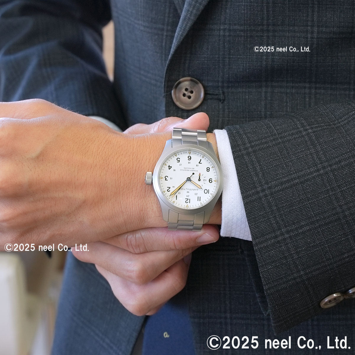 「カーキ フィールド メカ パワーリザーブ」は、「カーキ フィールド」コレクションの伝統的なデザインと欠かせない機能性を尊重しながら、現代的な機能や、最新のウォッチメイキング技術や革新性を取り入れています。ETA社がハミルトンのためだけに開発した、新しいH-23手巻きムーブメントを搭載し、初めて標準持続時間80時間をダイヤル上で直接確認することができるようになりました。ステンレススチール製メタルブレスレットを備えたホワイトのダイヤルには、誇らしげに「power reserve 80 hours」(標準持続時間80時間)と表示され、「F」で満タンを、「E」で空であることを示し、実用性を重視したこの特別な機能を強調しています。