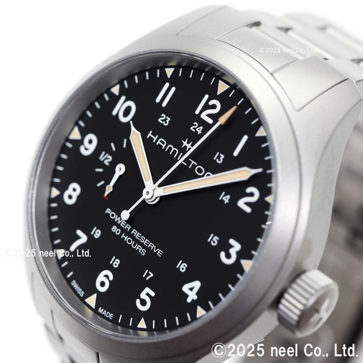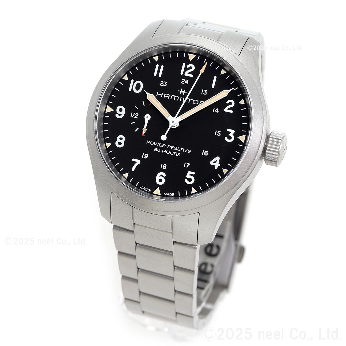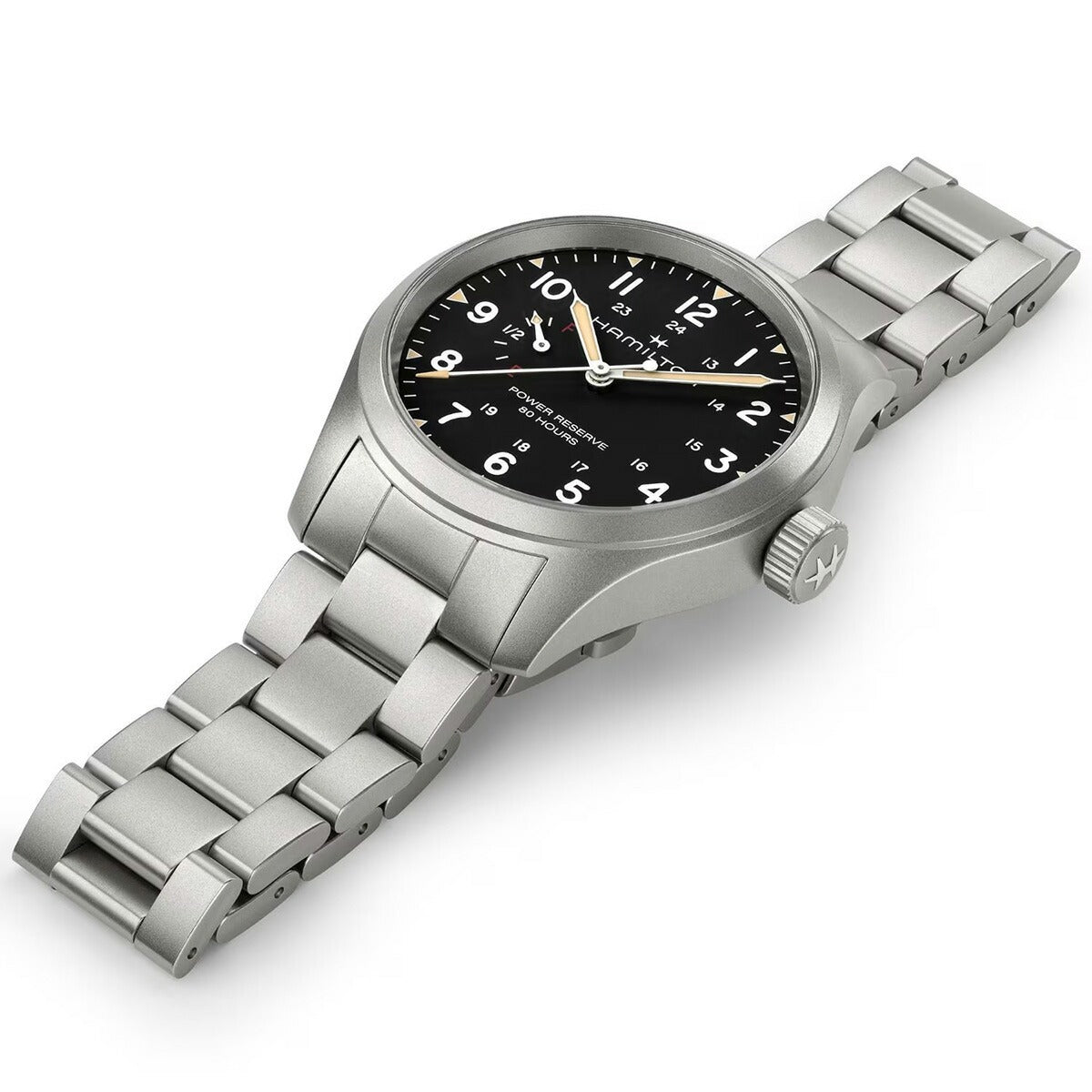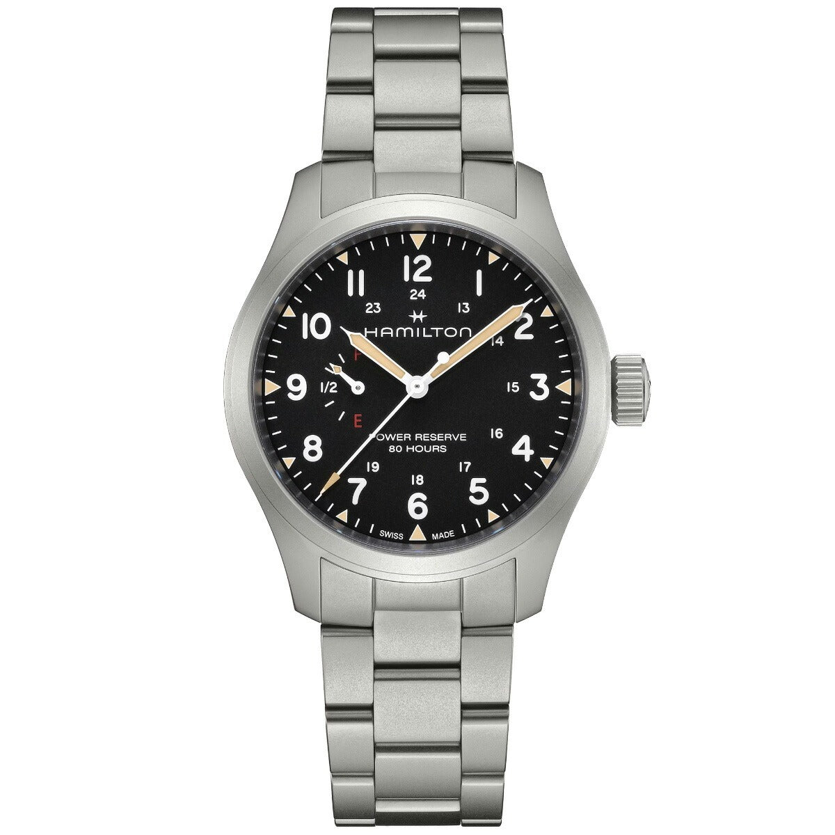 「カーキ フィールド メカ パワーリザーブ」は、「カーキ フィールド」コレクションの伝統的なデザインと欠かせない機能性を尊重しながら、現代的な機能や、最新のウォッチメイキング技術や革新性を取り入れています。ETA社がハミルトンのためだけに開発した、新しいH-23手巻きムーブメントを搭載し、初めて標準持続時間80時間をダイヤル上で直接確認することができるようになりました。ステンレススチール製メタルブレスレットを備えたブラックのダイヤルには、誇らしげに「power reserve 80 hours」(標準持続時間80時間)と表示され、「F」で満タンを、「E」で空であることを示し、実用性を重視したこの特別な機能を強調しています。