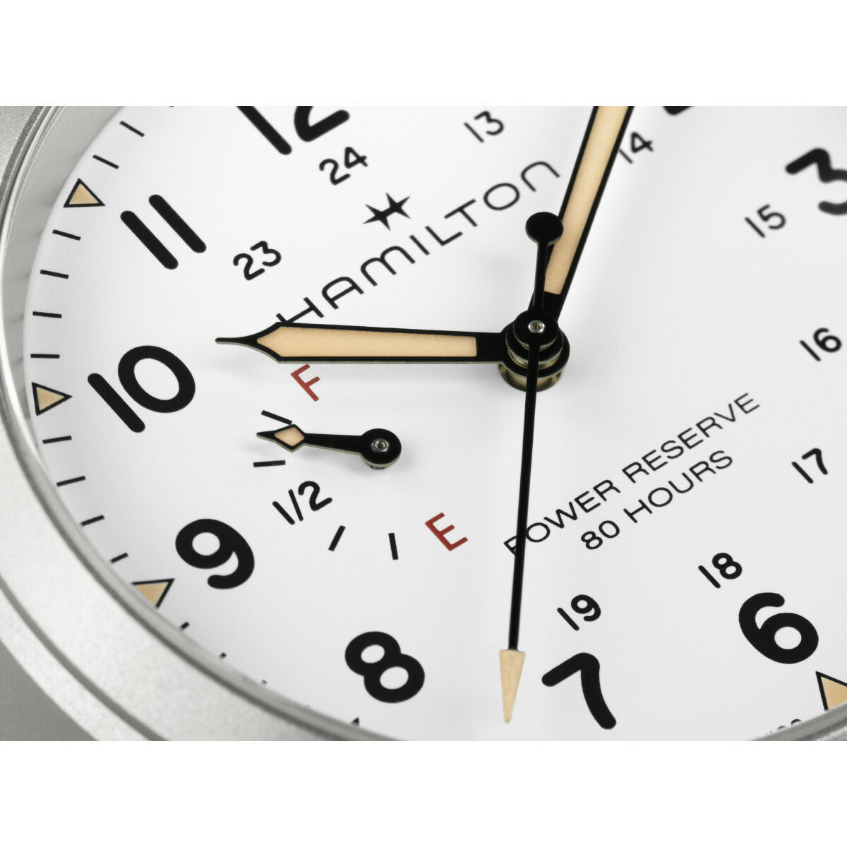 「カーキ フィールド メカ パワーリザーブ」は、「カーキ フィールド」コレクションの伝統的なデザインと欠かせない機能性を尊重しながら、現代的な機能や、最新のウォッチメイキング技術や革新性を取り入れています。ETA社がハミルトンのためだけに開発した、新しいH-23手巻きムーブメントを搭載し、初めて標準持続時間80時間をダイヤル上で直接確認することができるようになりました。ラギッドなカーキグリーンのNATOストラップを備えたホワイトのダイヤルには、誇らしげに「power reserve 80 hours」(標準持続時間80時間)と表示され、「F」で満タンを、「E」で空であることを示し、実用性を重視したこの特別な機能を強調しています。