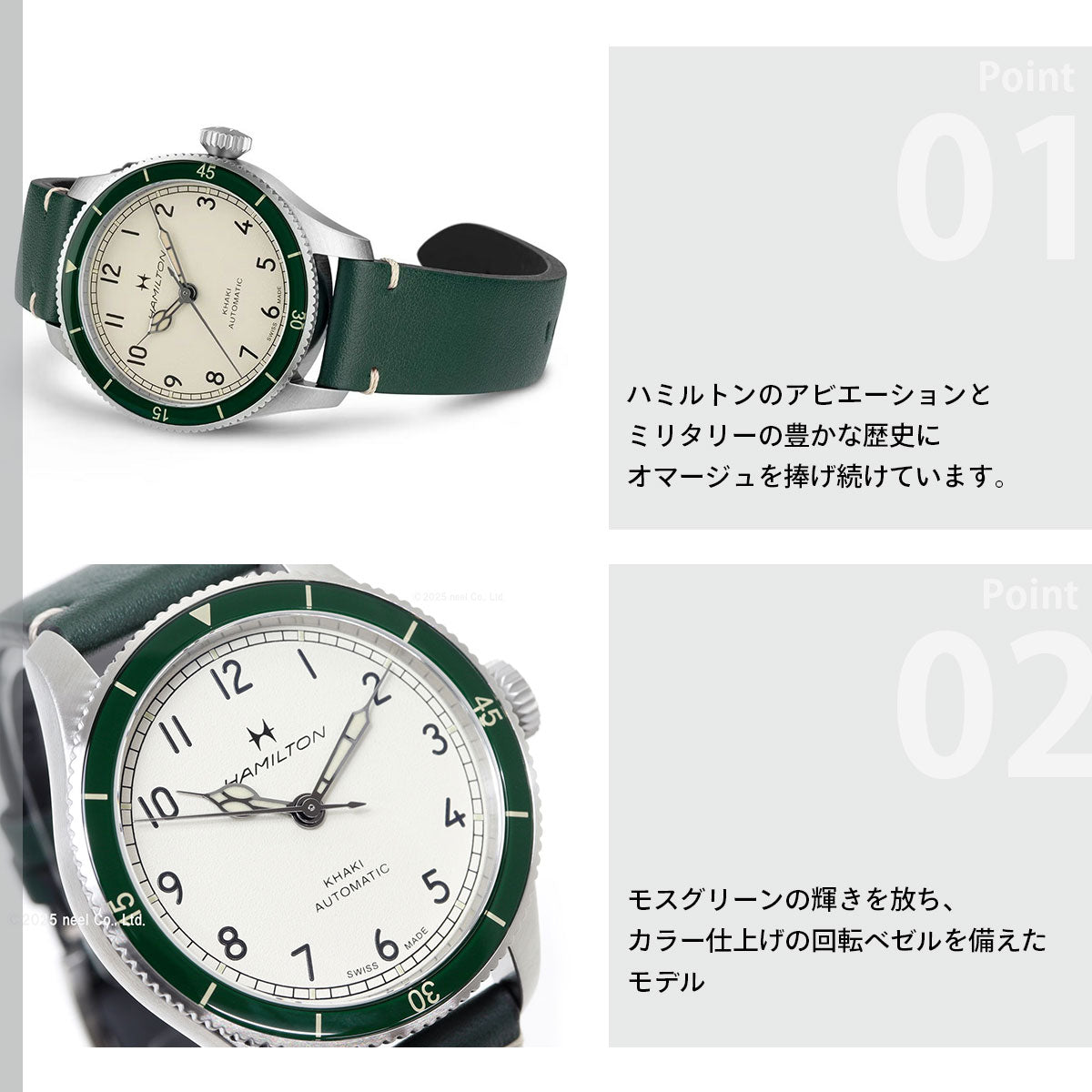 レトロな魅力が際立つ「カーキ パイロット パイオニア オート 38mm」は、ハミルトンのアビエーションとミリタリーの豊かな歴史にオマージュを捧げ続けています。モスグリーンの輝きを放ち、カラー仕上げの回転ベゼルを備えたモデルは、H-10ムーブメントを搭載し、標準持続時間80時間を誇ります。エッグシェルホワイトのダイヤルとグリーンのレザーベルトが特徴の、流行に左右されないタイムピースです。