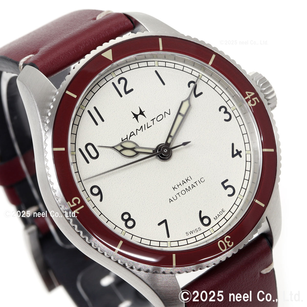 レトロな魅力が際立つ「カーキ パイロット パイオニア オート 38mm」は、ハミルトンのアビエーションとミリタリーの豊かな歴史にオマージュを捧げ続けています。バーガンディの輝きを放ち、カラー仕上げの回転ベゼルを備えたモデルは、H-10ムーブメントを搭載し、標準持続時間80時間を誇ります。エッグシェルホワイトのダイヤルとバーガンディのレザーベルトが特徴の、流行に左右されないタイムピースです。