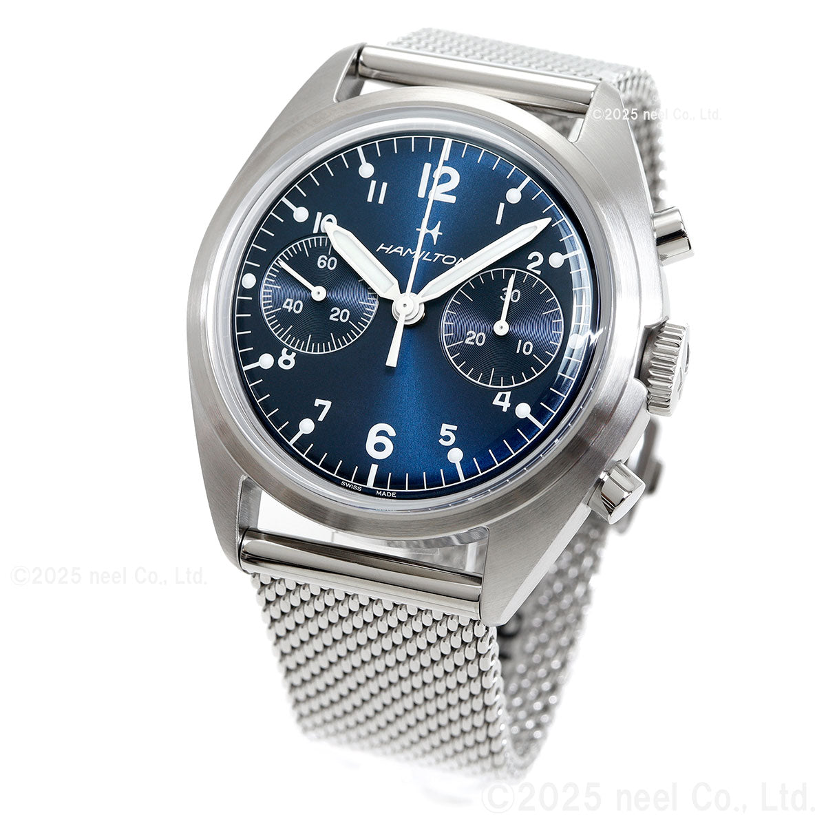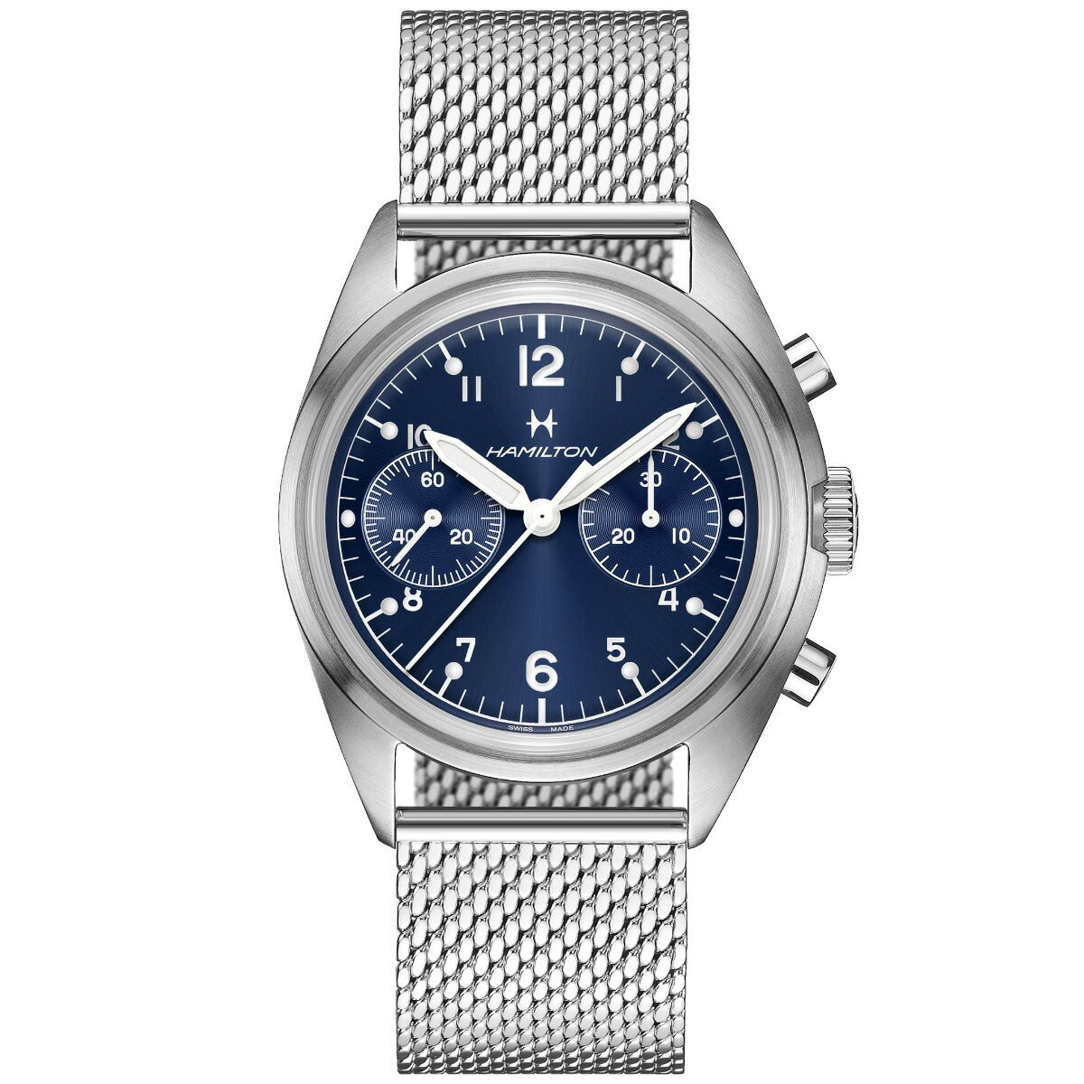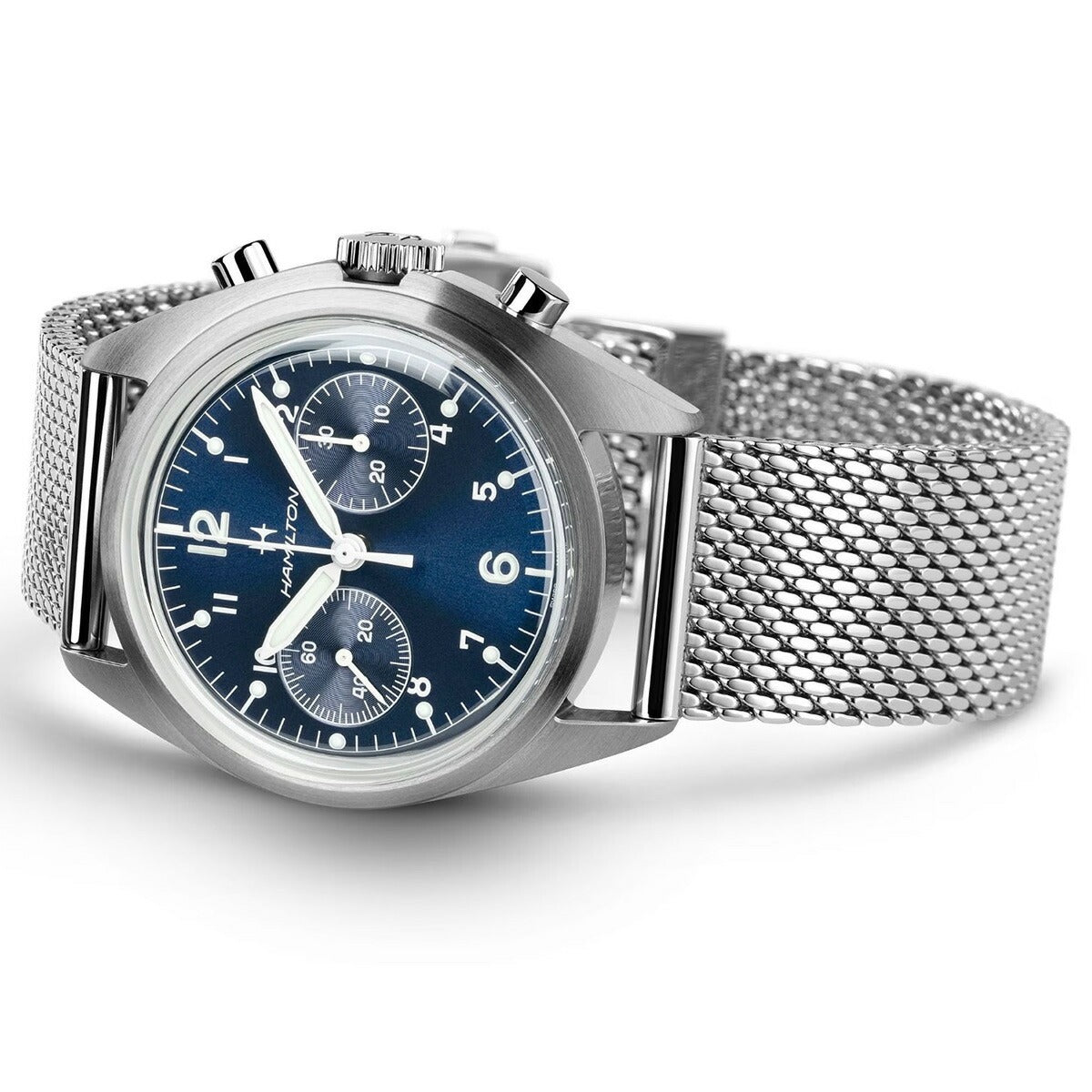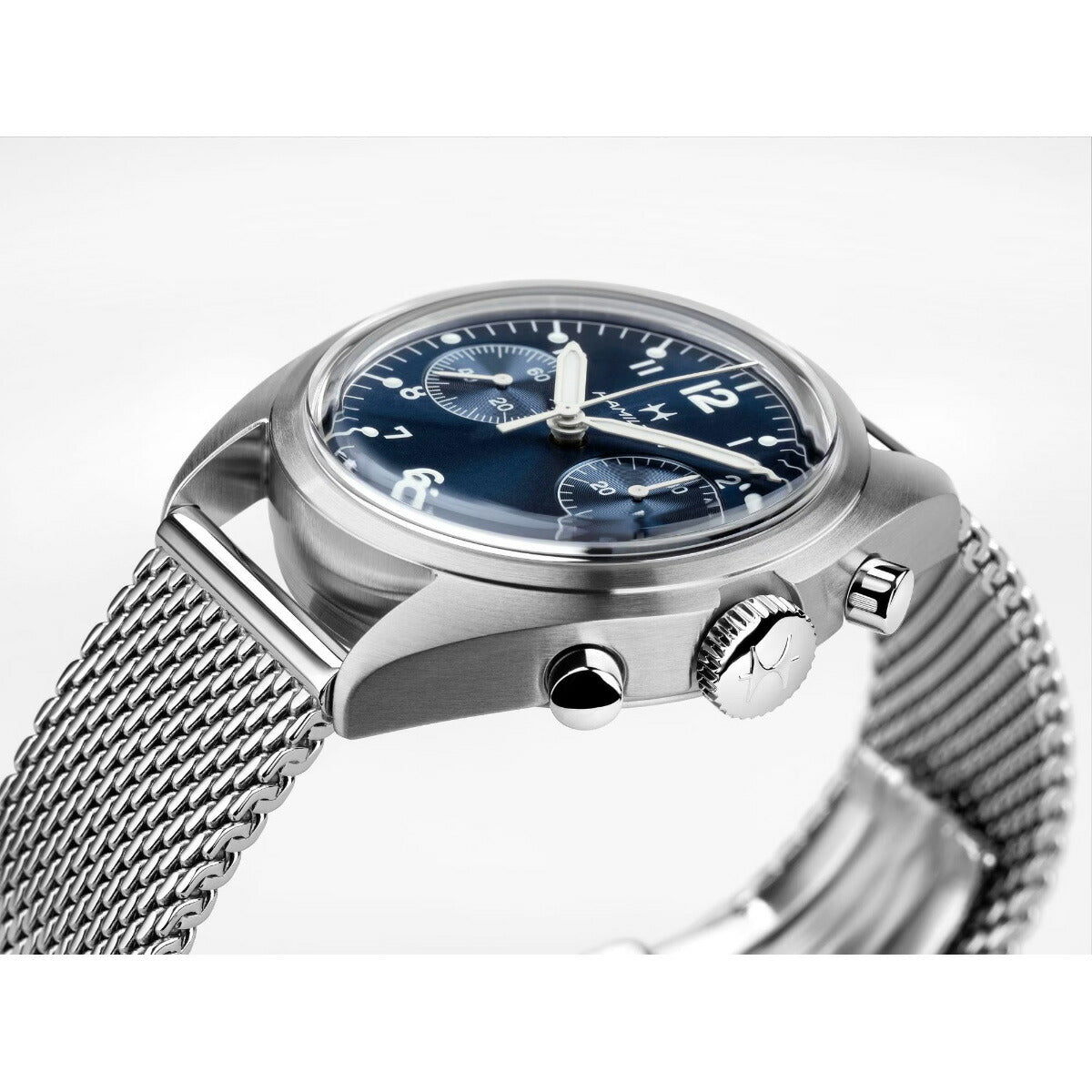ラギッドな信頼できる「カーキ パイロット パイオニア メカ クロノグラフ」は、ハミルトンのヴィンテージのミリタリー・アビエーションウォッチへのオマージュです。独自の手巻きムーブメントH-51-Siを搭載したこのタイムピースは、標準持続時間60時間と、サンレイ仕上げの見事なアビエーションブルーのダイヤルを誇ります。