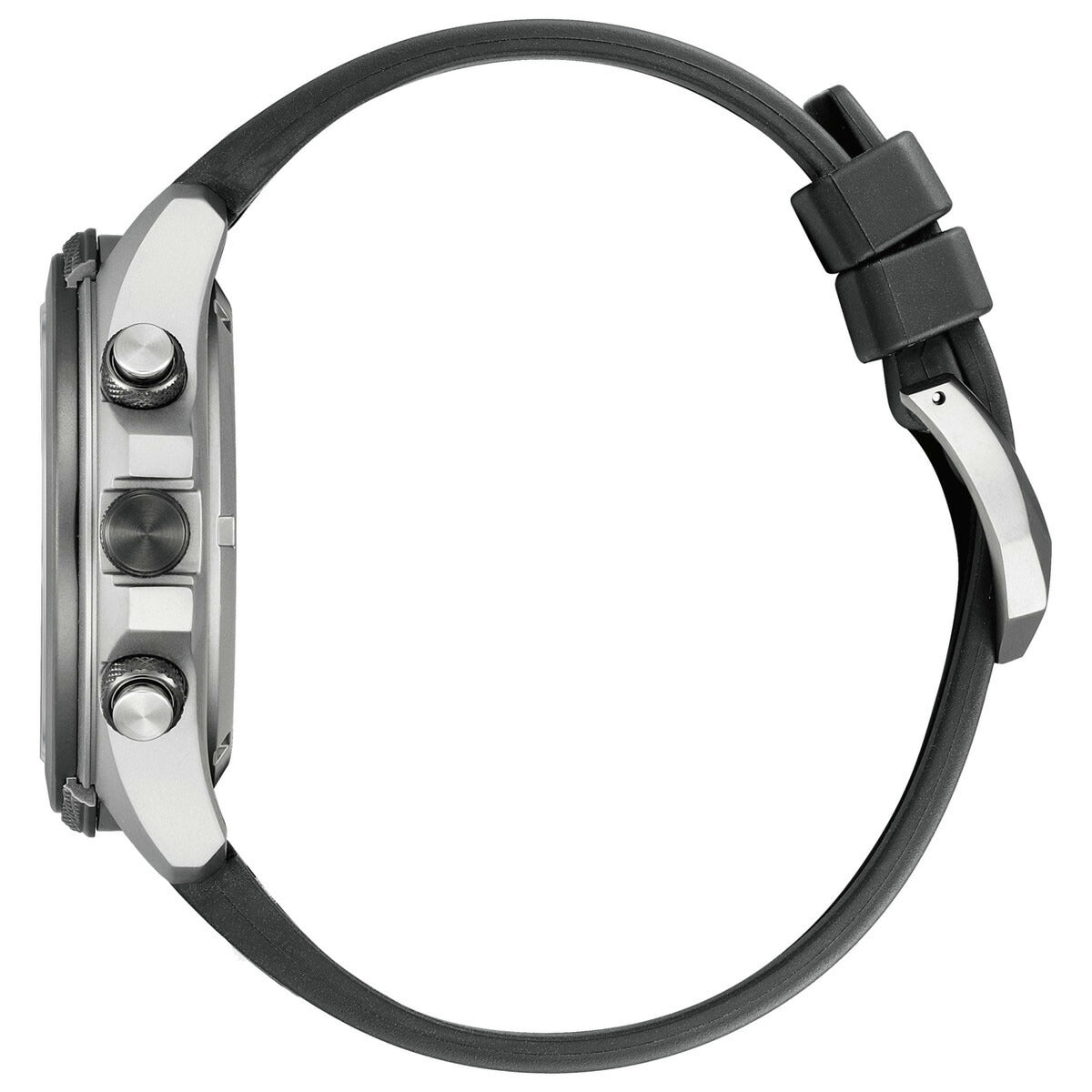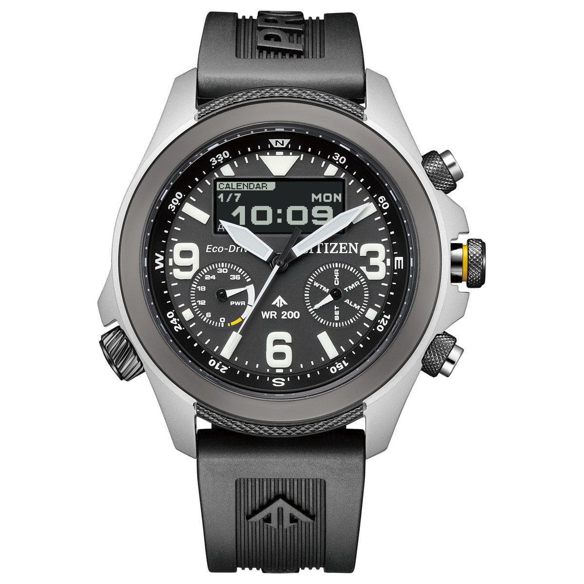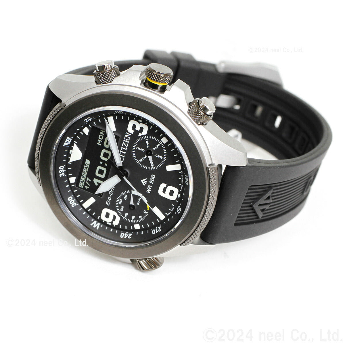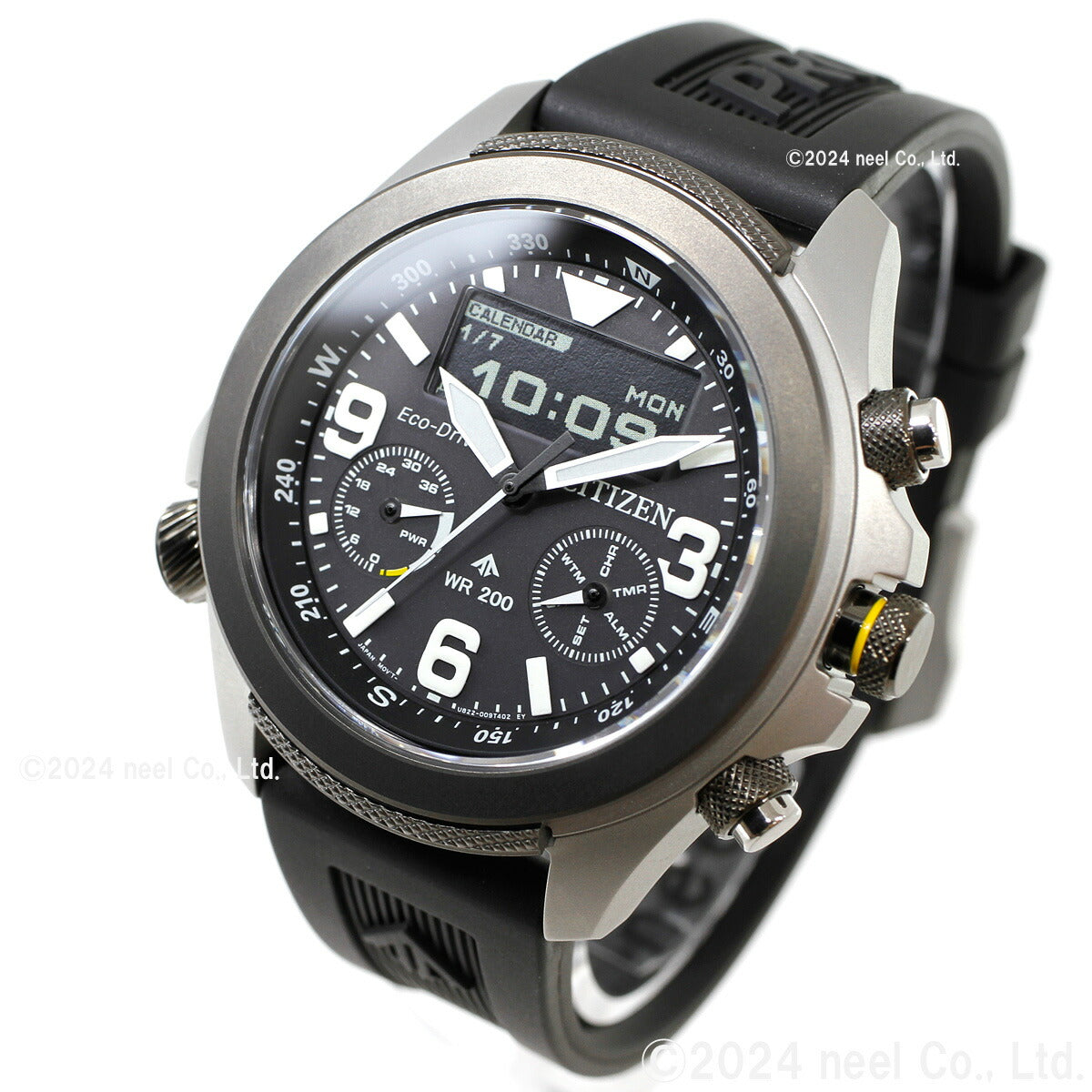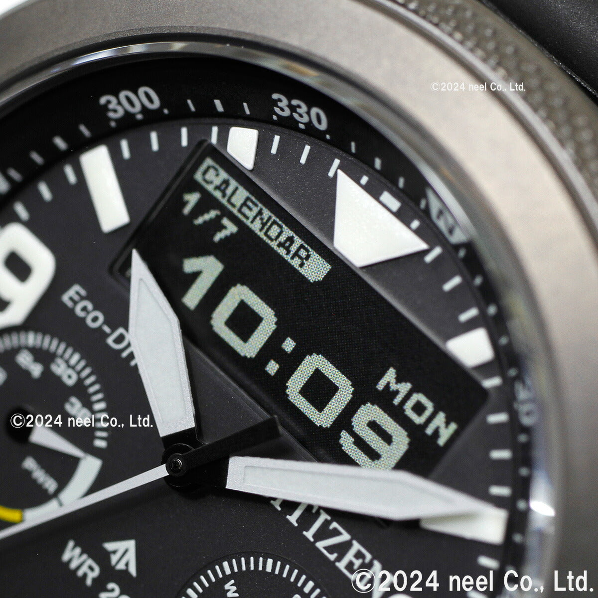 機能性、耐久性、安全性を兼ね備えた本格スポーツウオッチ、シチズン PROMASTER(プロマスター)。高解像度ディスプレイと新開発のムーブメントを搭載。アナログとデジタルの魅力を融合し、進化を遂げたLANDシリーズの新作です。新開発のムーブメント「Cal.U822」を搭載したエコ・ドライブ コンビネーションウオッチ。アナログ時計の視認性と美しさ、デジタル時計の機能性とツール感あふれるデザインを融合しています。ディスプレイには解像度の高いMIP(メモリインピクセル)液晶を採用。時刻や日付などの表示が従来よりも高精細になり、室内はもちろん屋外でも優れた視認性を発揮します。複数時刻や任意の曜日での設定が可能なアラームなど機能面もアップデート。見返しリングは回転式になっており、8時位置のりゅうずを操作することで方位計測が可能です。文字板は光の反射を抑えるマット仕上げ。太い針、アラビア数字とバーインデックスを組み合わせたメリハリのあるデザインで、アナログ表示の視認性も重視しています。耐久性と環境への配慮を両立したバイオマスウレタン(ベネビオール(TM))バンドを合わせたブラックの文字板仕様です。
