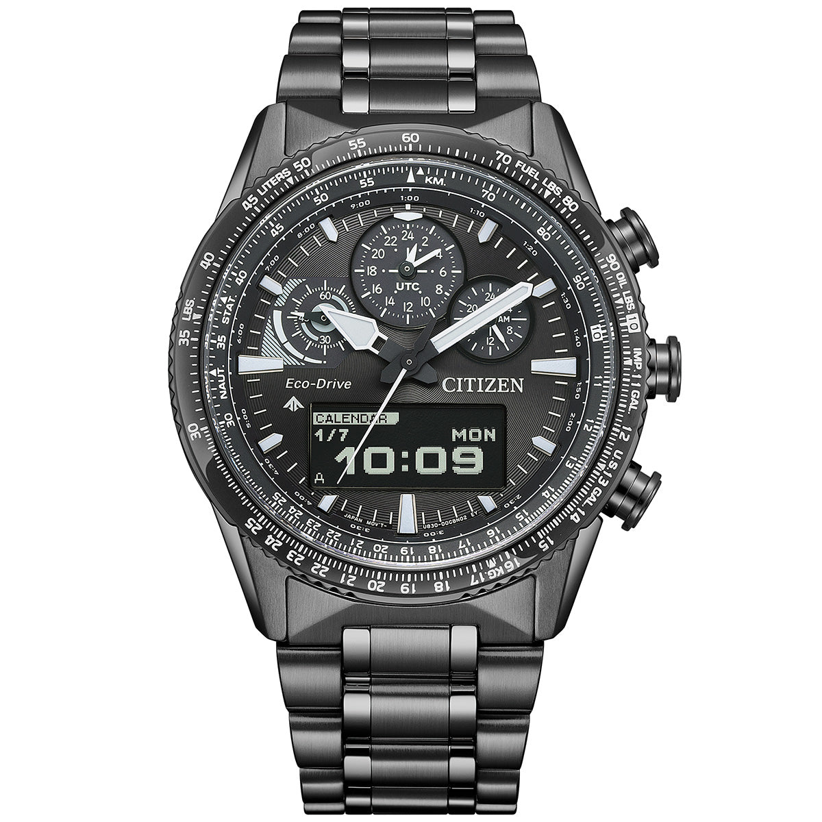 機能性、耐久性、安全性を兼ね備えた本格スポーツウオッチ、シチズン PROMASTER(プロマスター)。SKY専用にカスタマイズした新キャリバー「U830」と視認性に優れた高精細なMIP液晶を搭載した新モデルです。SKYシリーズのベストセラー、Cal.U680モデルと同様、文字板12時の位置にコクピットをイメージした3つのサブダイヤルを配置。航空分野をはじめ国際的なシステムで利用されるUTC(協定世界時)を常時表示するなど、SKYシリーズ用にカスタマイズしています。アナログ×デジタルのハイブリッド。高精細なMIP液晶を6時の位置に配置し、読み違いのない時刻表示、多言語対応の日付表示、ストップウオッチ、曜日別セット可能なアラームなどの豊富な機能をエコ・ドライブの力で実現しています。単位変換や為替の計算などに幅広く使える航空計算尺ベゼルを搭載。充実したムーブメントの機能と合わせ、さまざまなシーンでユーザーを支えます。ケース形状やバンドは、SKYシリーズの特徴である航空機体のイメージを踏襲しています。光沢感を生かし、やや細めに仕上げたインデックスやベゼルが知的な印象を演出。精緻さと力強さを兼ね備えた独自の魅力を持つモデルが、新しいアナログ時計の可能性を切り拓きます。