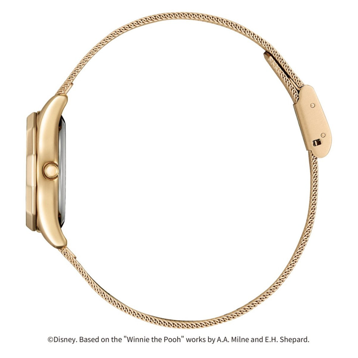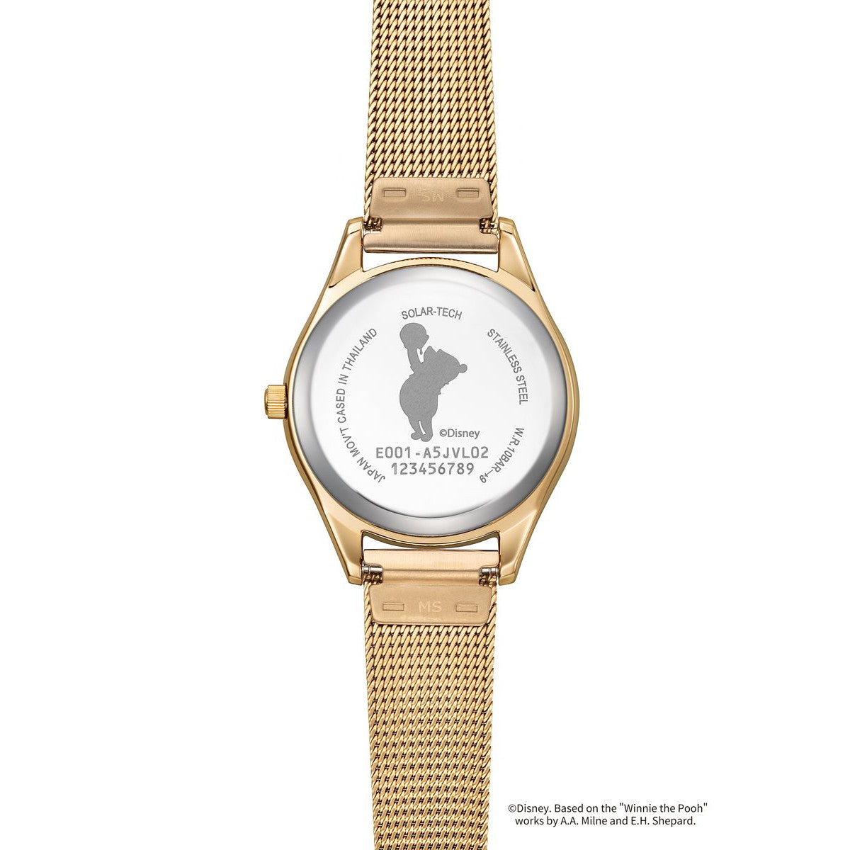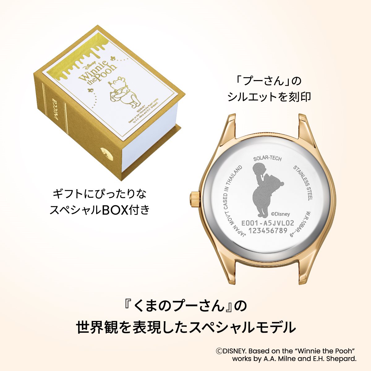 はちみつ好きの「プーさん」にちなみ、ハチの巣のハニカム構造をヒントにした多角形ベゼルを採用。ウォームゴールドのケースは、「プーさん」をイメージしています。インデックスは、絵本のフォントのように柔らかなアラビア数字を採用。背景に「プーさん」たちが住む100エーカーの森をイメージしたパターンを描いています。6時位置に鼻先にハチがとまった「プーさん」をプリント。1時と8時位置にハチを描き、ハチが飛んでいる様子を切分のデザインで表現しました。2時位置に描かれた壺からデイ&デイト表示の窓にはちみつがこぼれているようなデザインで遊び心をプラスしました。裏ぶたに「プーさん」のシルエットを刻印。BOOK型のスペシャルBOX付きです。