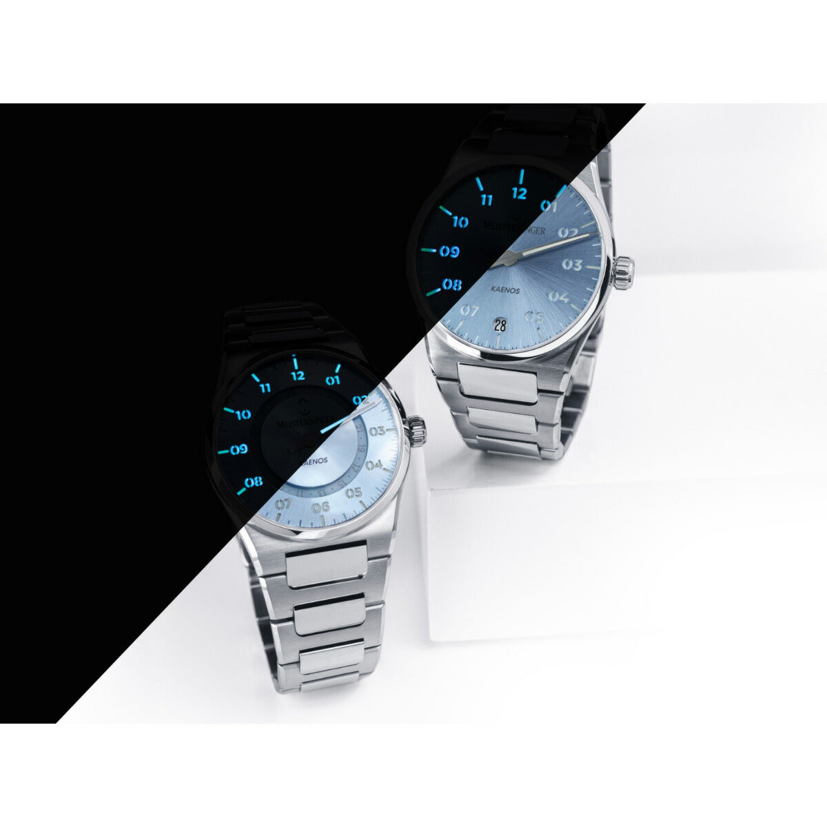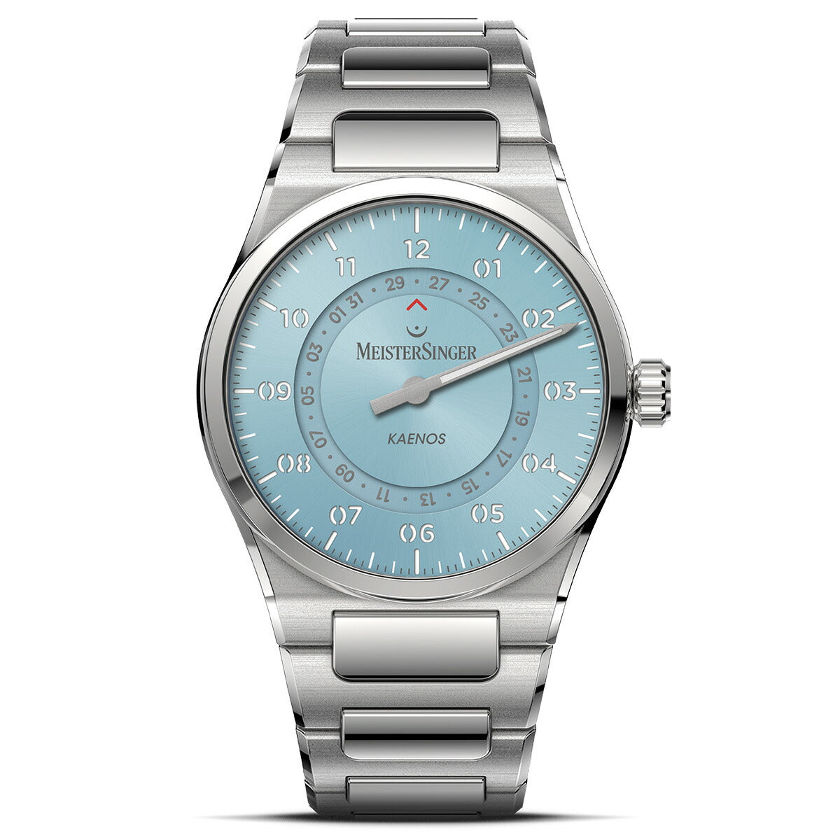 Kaenos(カエノス)は、完全にゼロから開発されました。「Kaenos」という名前は、ギリシャ語の「kainos(カイノス)」に由来し、「新しい」「新鮮な」という意味を持ち、また地球の歴史における再生の時代である「新生代(Cenozoic era)」を指しています。この名前は、MeisterSinger(マイスタージンガー)にとって新たなスタートを意味し、さらなるエキサイティングな進化を象徴するモデルにふさわしいものです。この新しい製品ファミリーは2つのラインに分かれています。一つは、6時位置にラージデイトを備えた「Kaenos」。もう一つは、12時位置の下にオープンデイトディスクを配し、日付を読むことができる「Kaenos Open Date」です。また、Kaenosはその優れたデザインが評価され、2025年のiFデザインアワードを受賞しました。