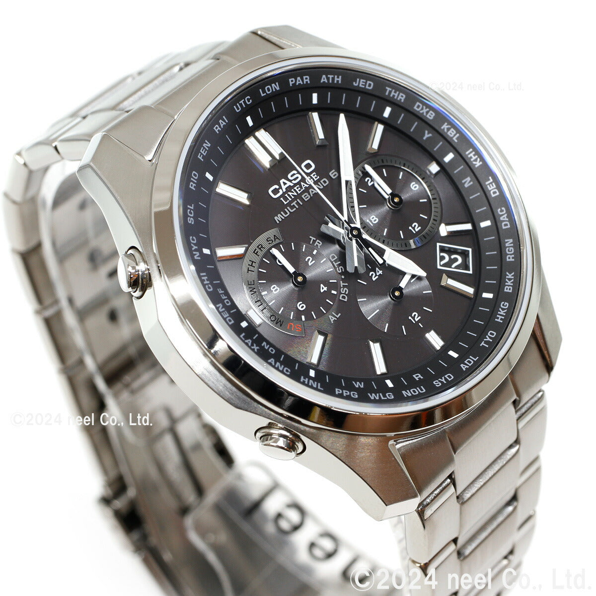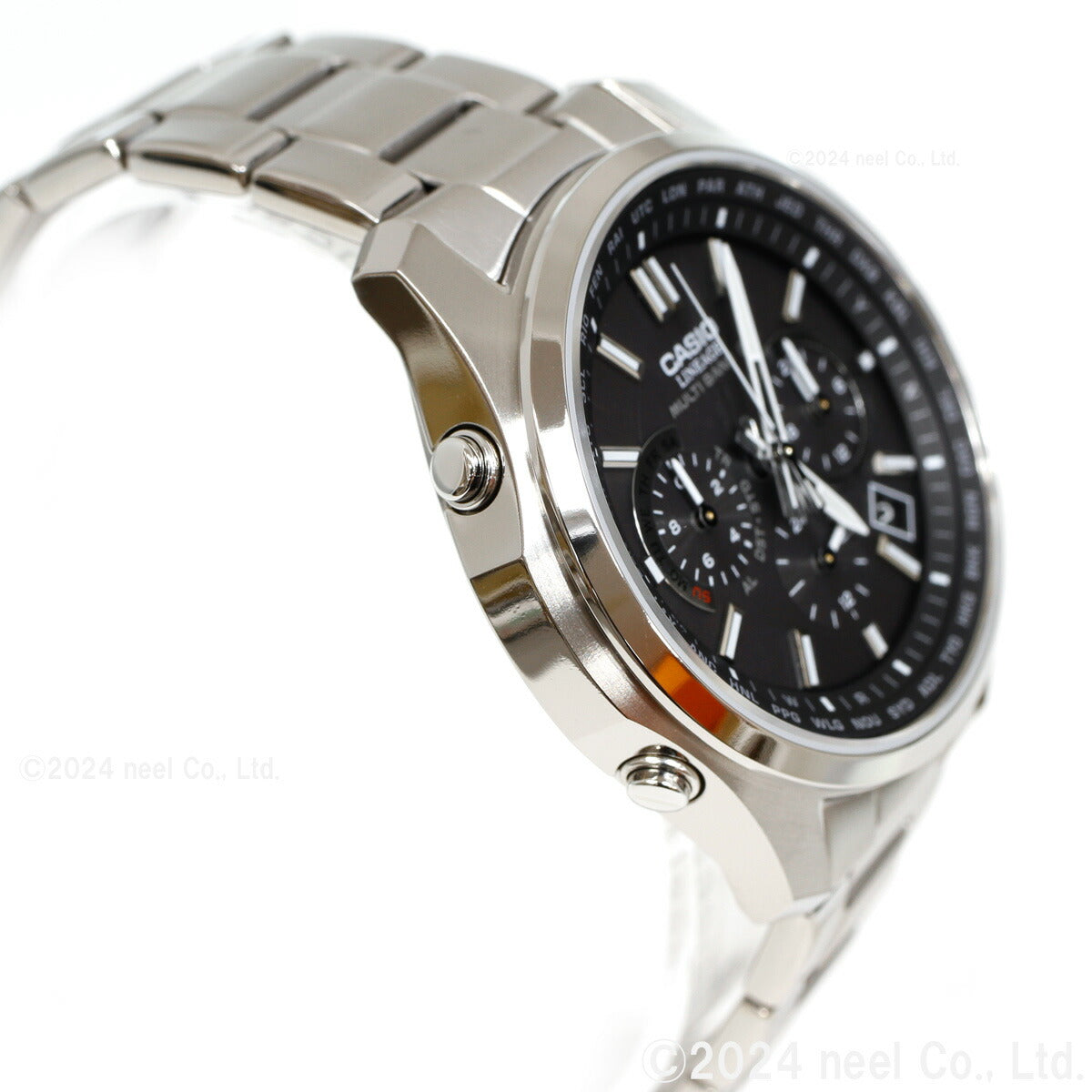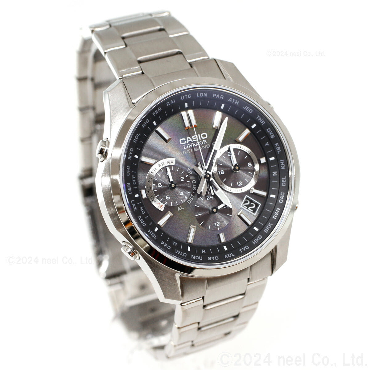 フルメタルケースのソーラー電波時計「LINEAGE」のクロノグラフモデルです。多針アナログのモジュールを搭載し、スポーティなデザインに仕上げました。厚さ10.6mmのスリムケースにストップウオッチ、ワールドタイム、タイマー、アラーム、日付・曜日表示、世界6局の標準電波に対応するマルチバンド6、定期的な電池交換の手間を省くタフソーラーを搭載。自分で簡単にバンド長さの調整ができるプッシュ&リリースタイプで、傷が付きにくいサファイアガラス、軽い着け心地のチタンケースも採用した利便性の高いモデルです。