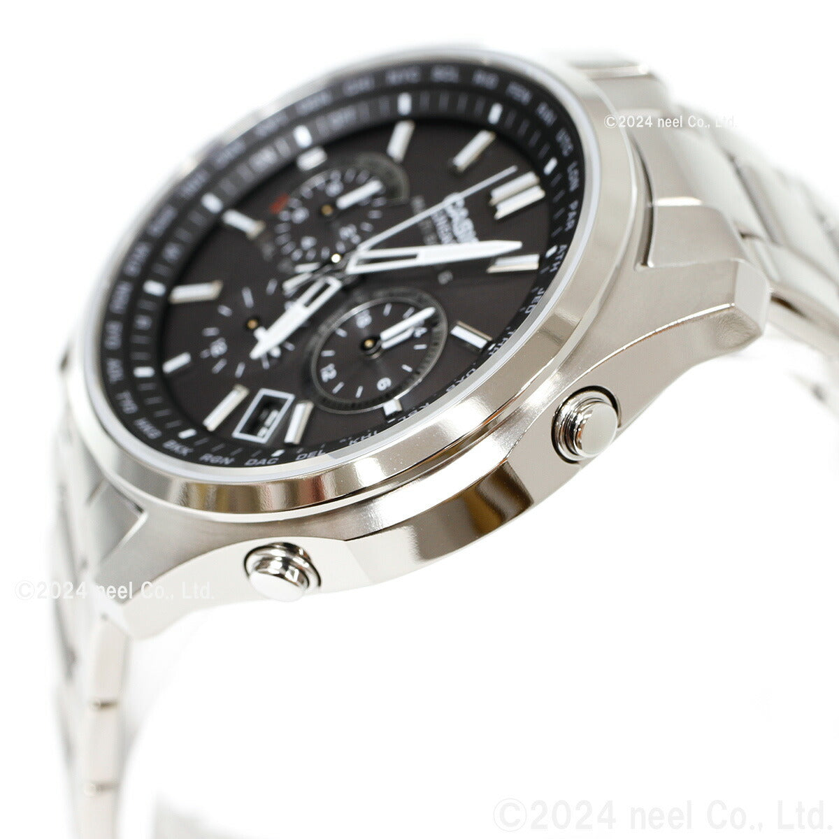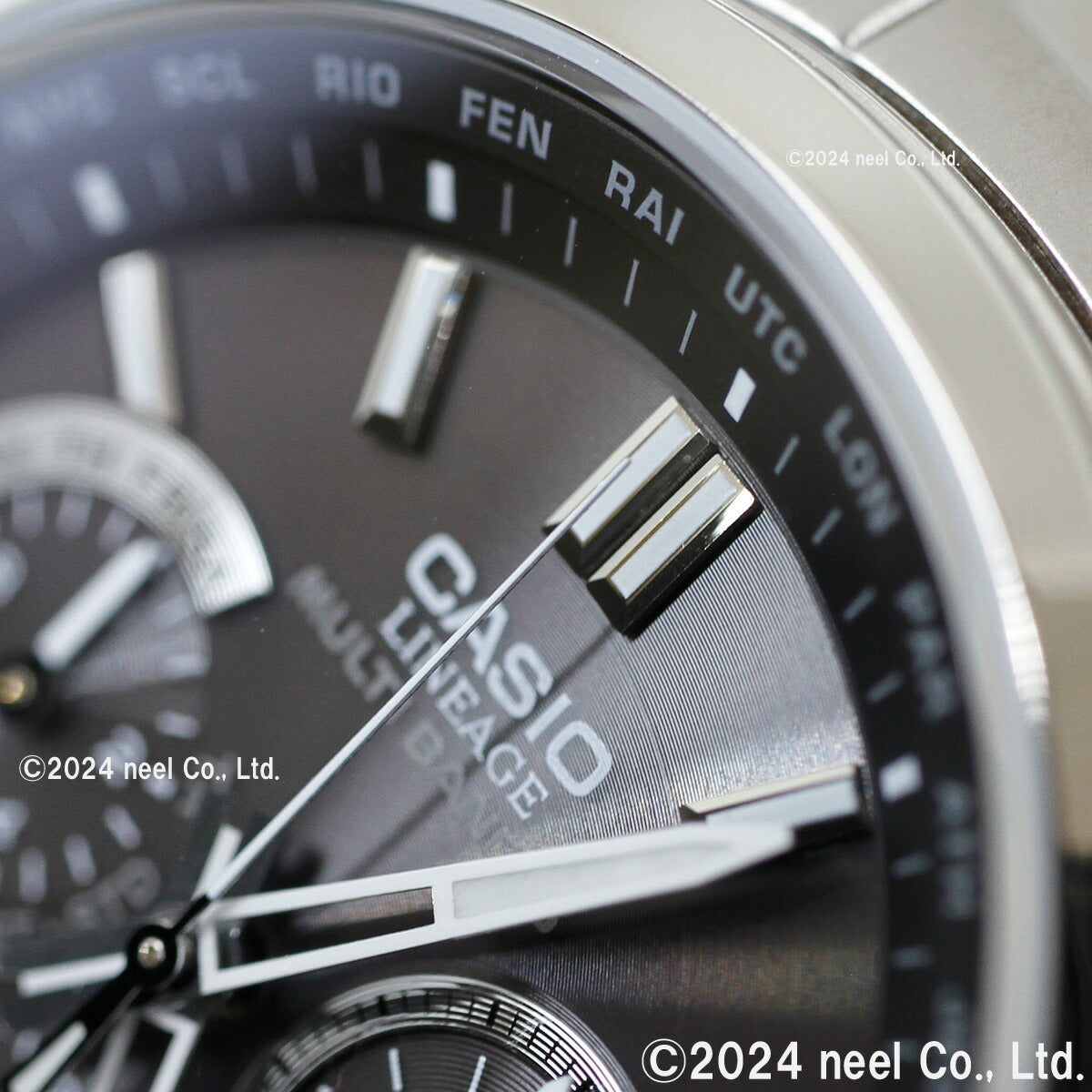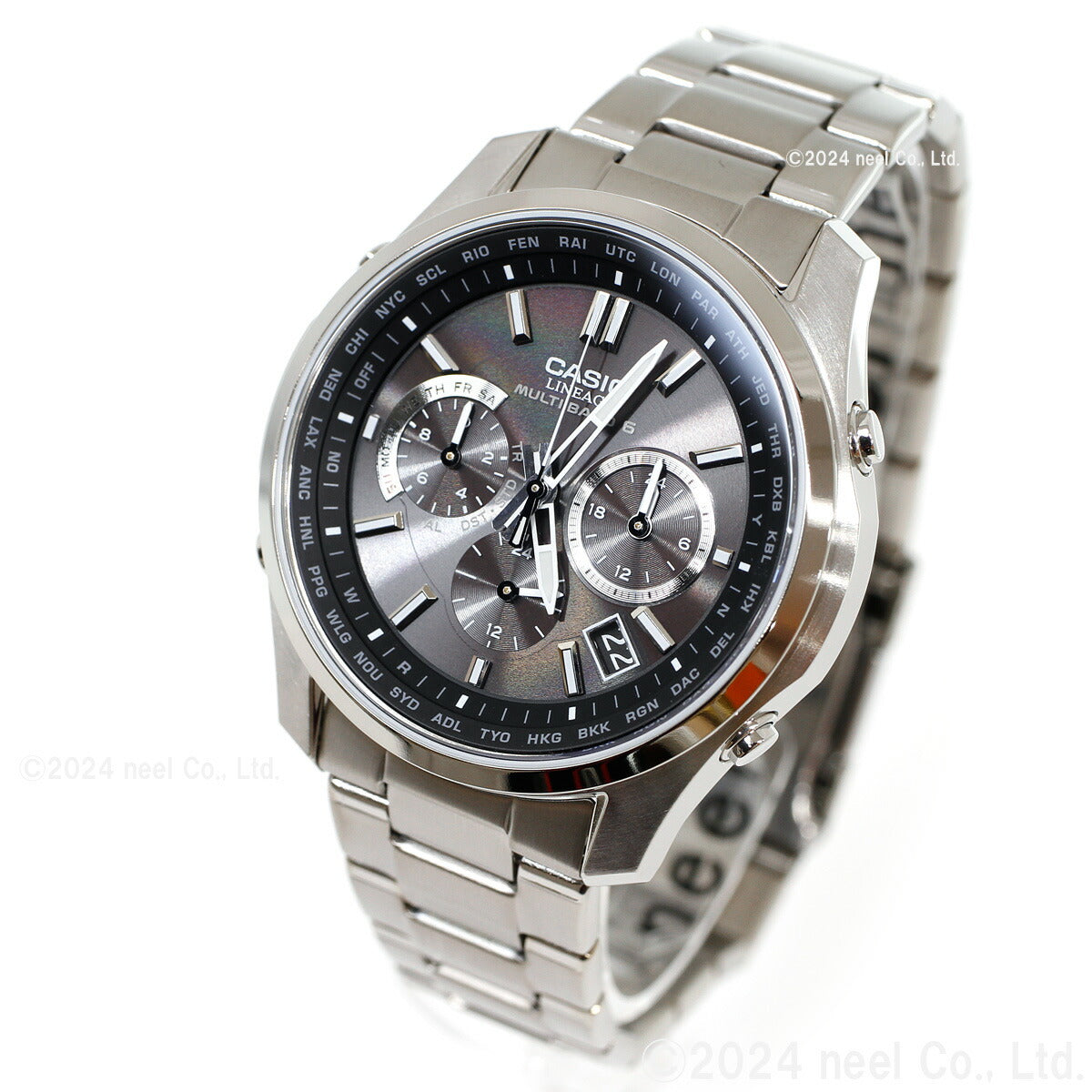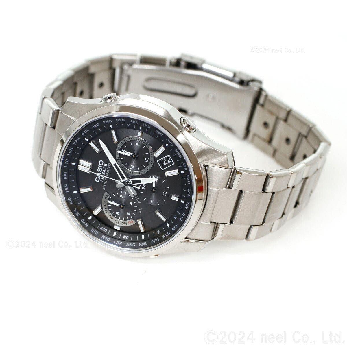 フルメタルケースのソーラー電波時計「LINEAGE」のクロノグラフモデルです。多針アナログのモジュールを搭載し、スポーティなデザインに仕上げました。厚さ10.6mmのスリムケースにストップウオッチ、ワールドタイム、タイマー、アラーム、日付・曜日表示、世界6局の標準電波に対応するマルチバンド6、定期的な電池交換の手間を省くタフソーラーを搭載。自分で簡単にバンド長さの調整ができるプッシュ&リリースタイプで、傷が付きにくいサファイアガラス、軽い着け心地のチタンケースも採用した利便性の高いモデルです。