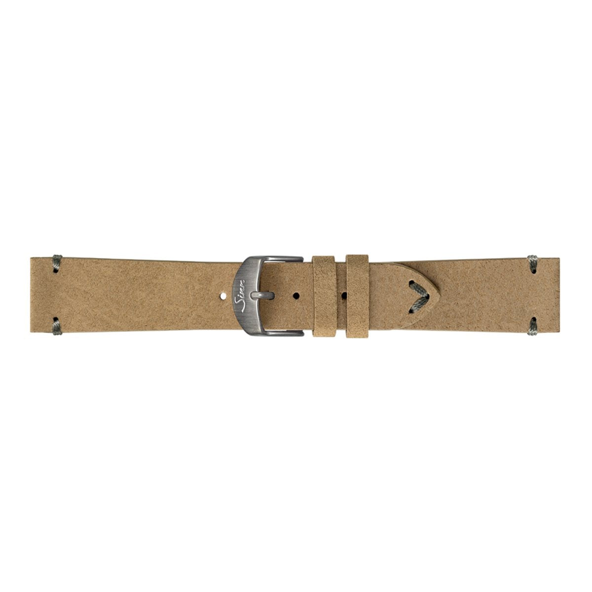 Sinnのヌバック ボアレザーストラップは、高品質なヌバック仕上げのイノシシ革を使用したサンドカラーのレザーベルトです。ベルト幅は20mm、尾錠はステンレススチール製、マット仕上げです。独特の起毛感と、しっとりとした柔らかな肌触りが特徴。使い込むほどに風合いが増し、耐久性にも優れています。