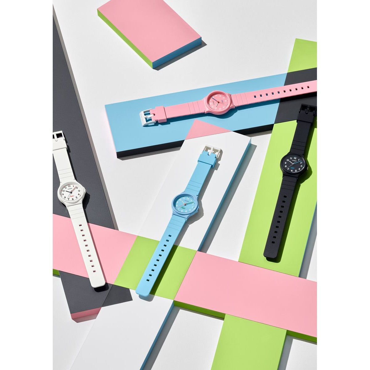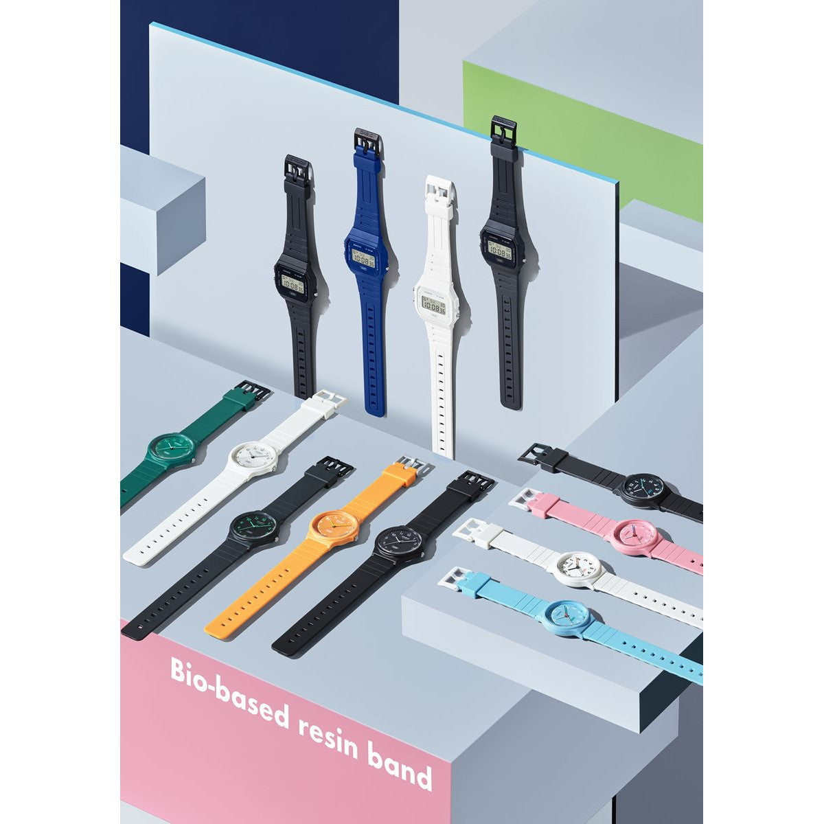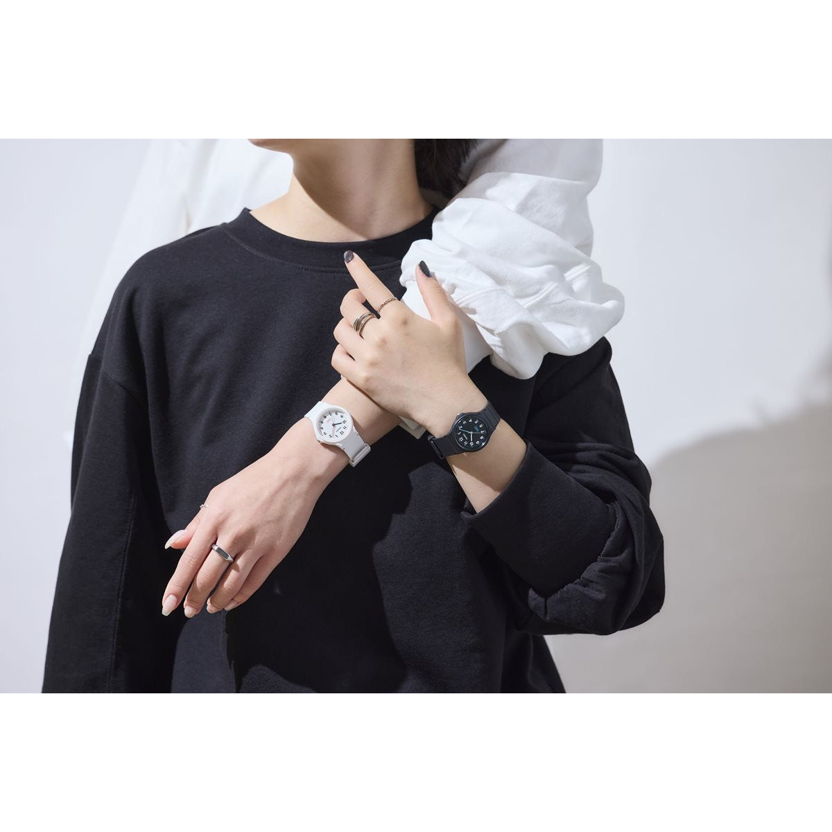 小ぶりなサイズの3針アナログウオッチです。シンプルで見やすいアラビアインデックスを採用。また、時針とインデックス、分針とインデックス外側の目盛りの表記の配色を対にし、時間が読みやすくファーストウオッチにぴったりのモデルです。カラーは定番のブラック。バンドの樹脂素材にはバイオマスプラスチックを使用。原料に再生可能な有機資源を使用し、環境負荷低減への貢献が期待されています。