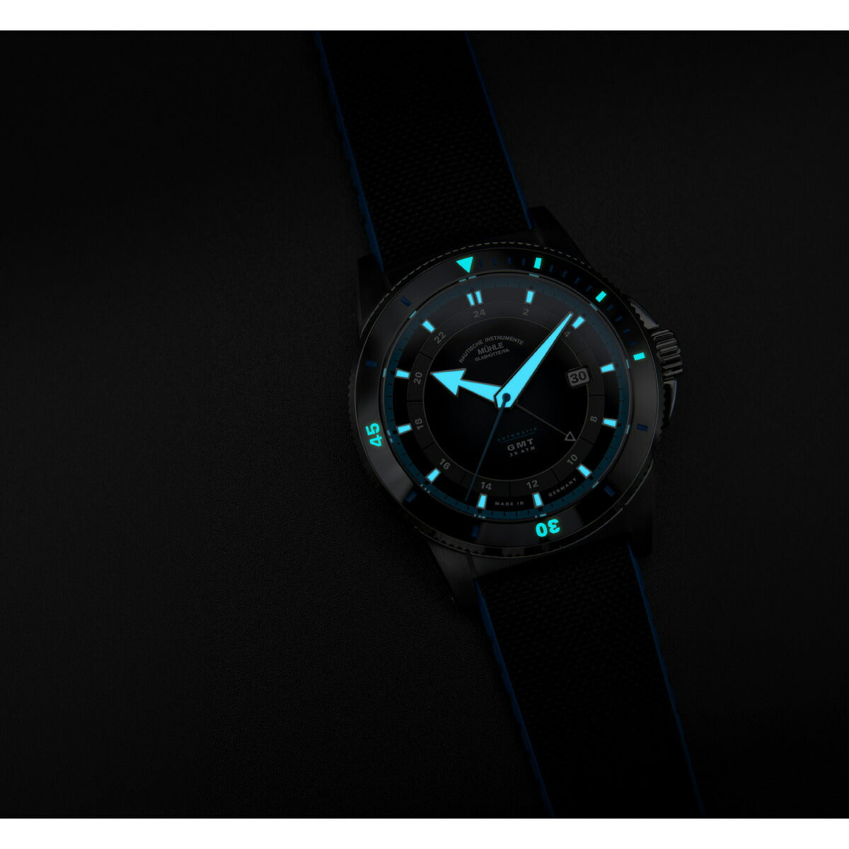 Muhle-Glashutteの新作スポーツウォッチシリーズ「SPORTIVO(スポーティヴォ)」。優れた機能性と洗練されたスポーティなスタイルで、オフィスや仕事後、トレーニング、アウトドアでの冒険など、様々なシーンにおいて日常生活の理想的なパートナーとなるよう設計されていました。SPORTIVO トラベルGMTは、2つのタイムゾーンを表示できる長距離移動用のモデル。24時間スケールを備えたリングに細かい矢印が指し、旅行先でも本国の時間を確認できます。黒い文字盤に淡い青のコントラストが加わり、洗練されたデザインが際立ちます。細かいディテールにまでこだわったダイヤルデザインが、SPORTIVO トラベルGMTの魅力です。