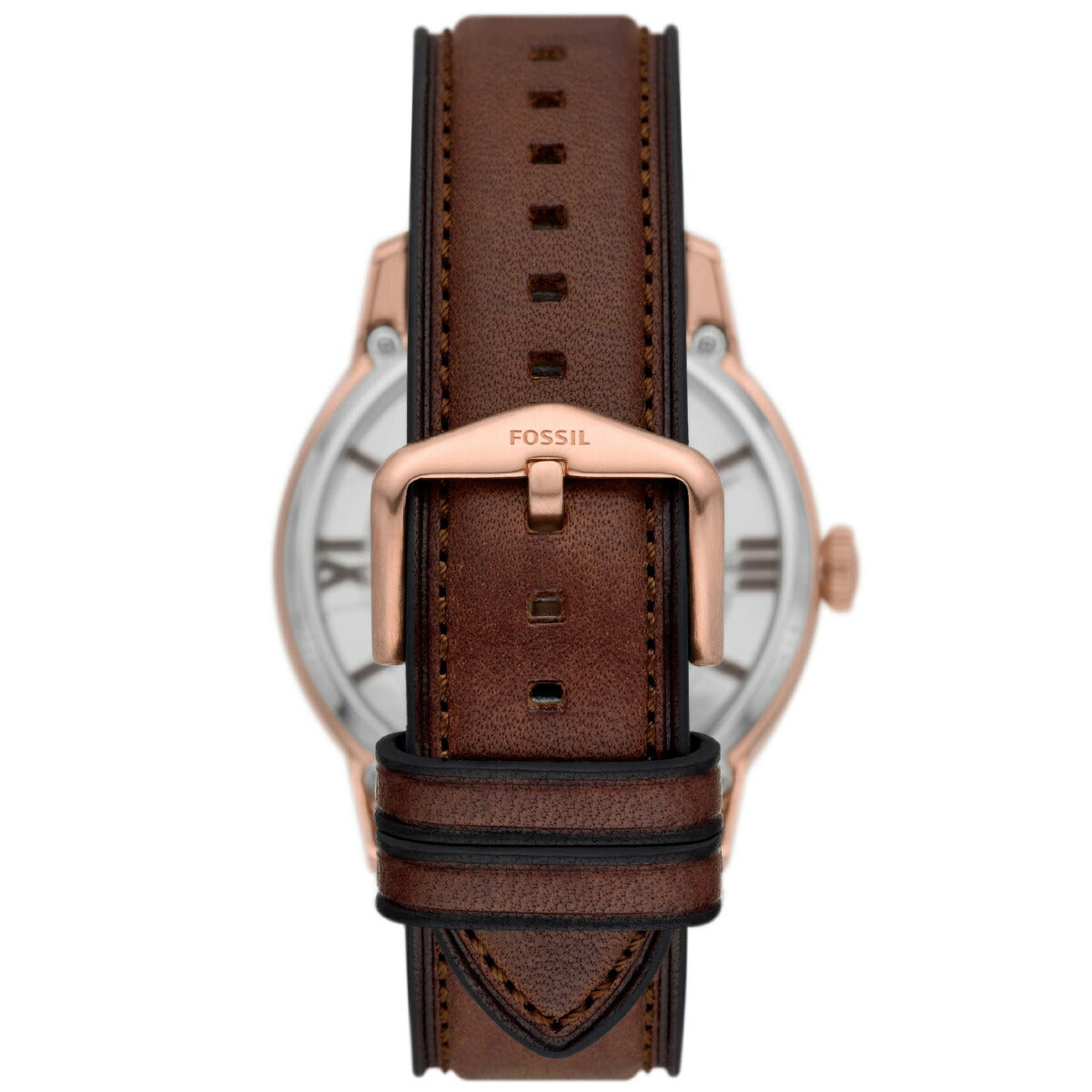 ヴィンテージウォッチのデザインからインスピレーションを得たTOWNSMAN オートマティック。機能美を追求したカジュアルなドレスウォッチです。着用している間も巻き上げてくれる三針自動巻きムーブメントを搭載。革新的なスケルトンダイヤルを配した、スタイリッシュなローズゴールドトーンのケースに、ブラウンのレザーストラップを組み合わせました。Fossilのレザー製品は、Leather Working Group(LWG)を通じて責任あるものづくりを支援しています。