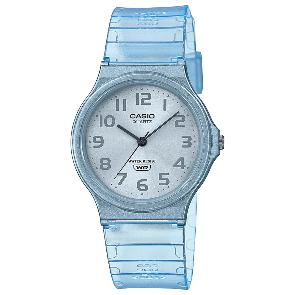 ロングセラーモデルMQ-24のカラフルなスケルトンカラータイプです。メタリック塗装ケースと旭光文字板を採用し、バンドとワントーンで仕上げました。軽く腕にフィットする3針タイプで日常生活用防水機能も備えています。