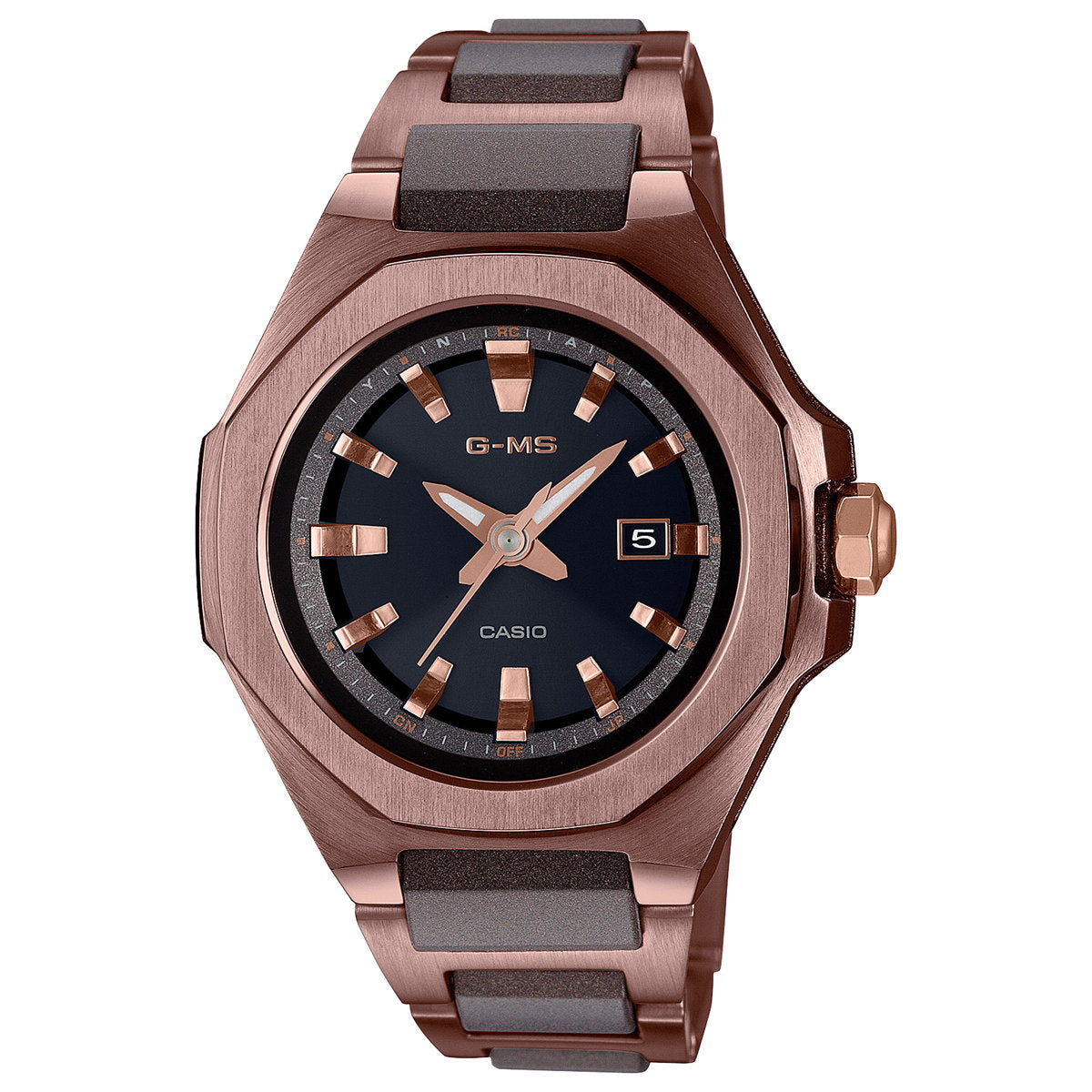 アクティブで洗練された女性のためのBABY-G G-MSから、休日からワークシーンまで幅広く活躍するNewモデルの登場です。今回はデジタル表示と針を使ったアナログ表示を組み合わせたモデル。スポーティな印象でありながら、メタル素材を使用して高級感のあるデザインに仕上げています。また、フェイスは視認性が高く時刻を確認しやすいサイズになっています。機能面では、世界6局の電波を受信し時刻を自動修正するマルチバンド6、ワールドタイム、タフソーラー等、頼れる機能を備えています。また、暗所で腕を傾けると自動的にライトが点灯するフルオートLEDライトを文字板・デジタル部の両方に採用しました。洗練されたデザインと頼れる機能で、女性の毎日をサポートするNewモデルの登場です。