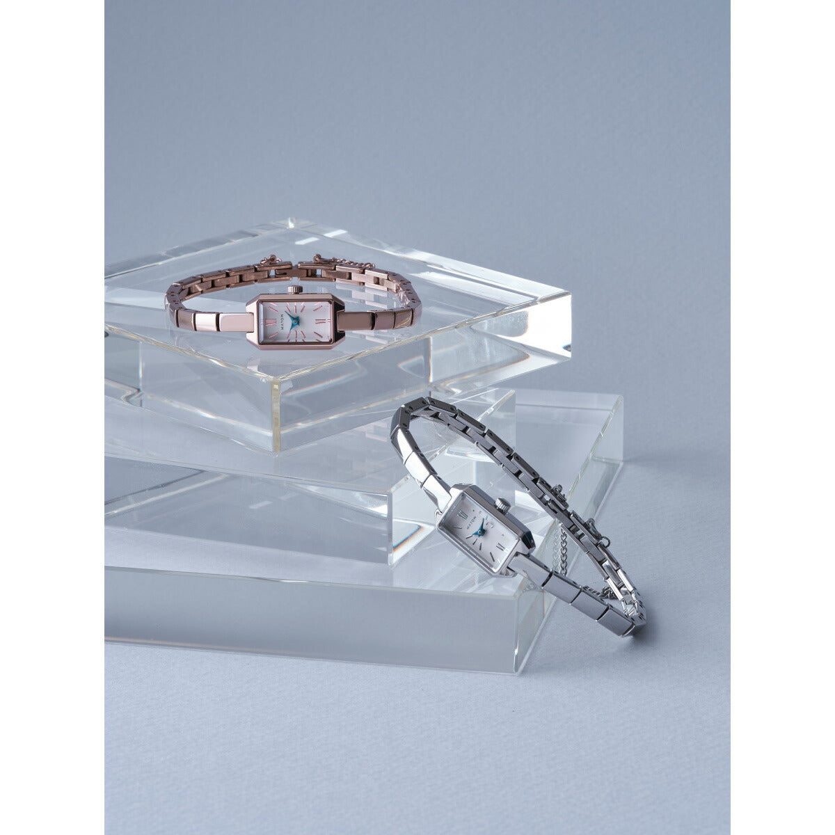 夜が更け、街の喧騒が静まる頃。窓辺に立ち、ふと見上げた夜空に、澄み渡る月が静かに輝いている。そんな情景にインスピレーションを受けたのが、「清月(せいげつ)」。細身のスクエアケースは、夜空に浮かぶ月のように洗練され、無駄のないシルエット。手首にすっと馴染むコンパクトなサイズ感は、華奢でありながら確かな存在感を演出します。文字盤の繊細なインデックスは、月光が水面にそっと映るような柔らかな輝きを放ち、青針のアクセントが夜の静寂を思わせる深みを加えます。4mm幅のメタルバンドを採用し、ガラスカットを施したコンパクトケースによりカジュアルからフォーマルなスタイルにも合わせられるデザイン。職人の手によって細部まで丁寧に仕上げられ、時代を超えて愛される一本となるように仕立てました。