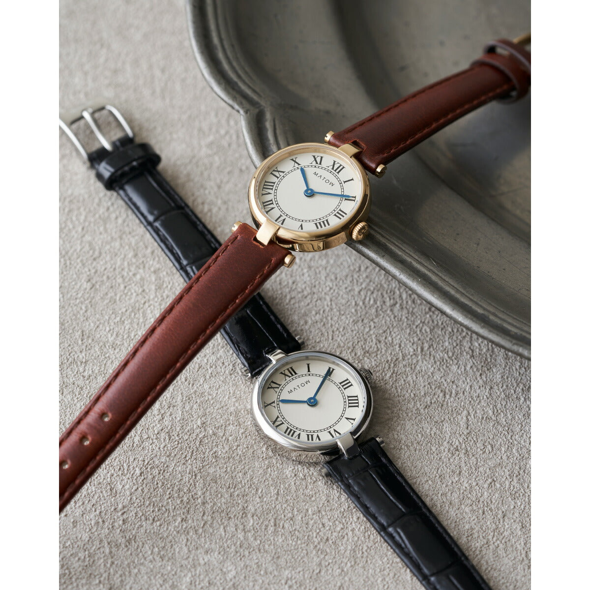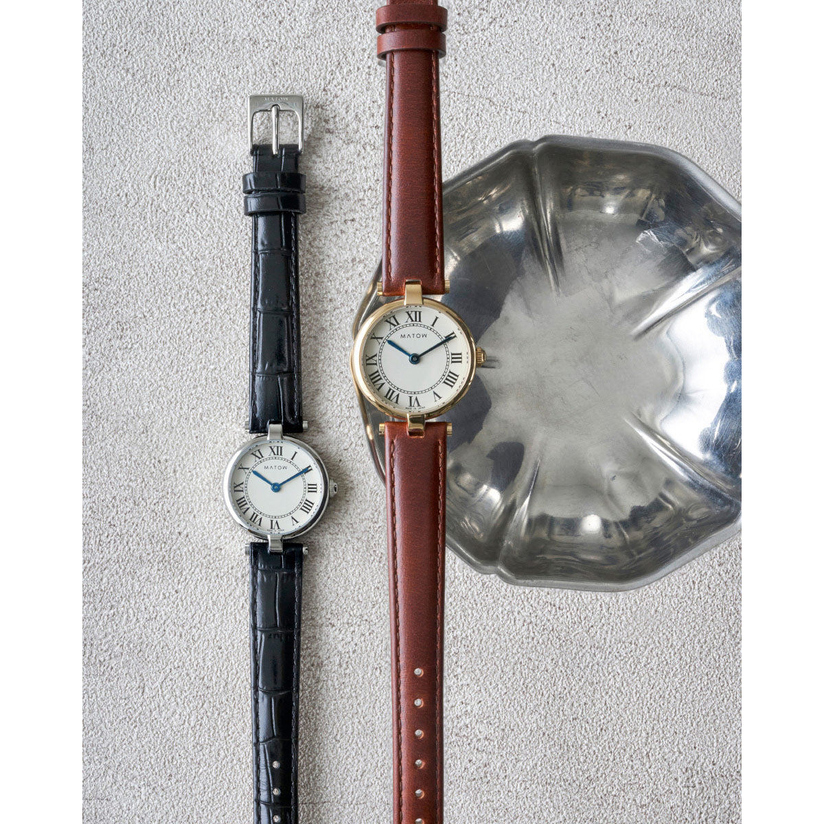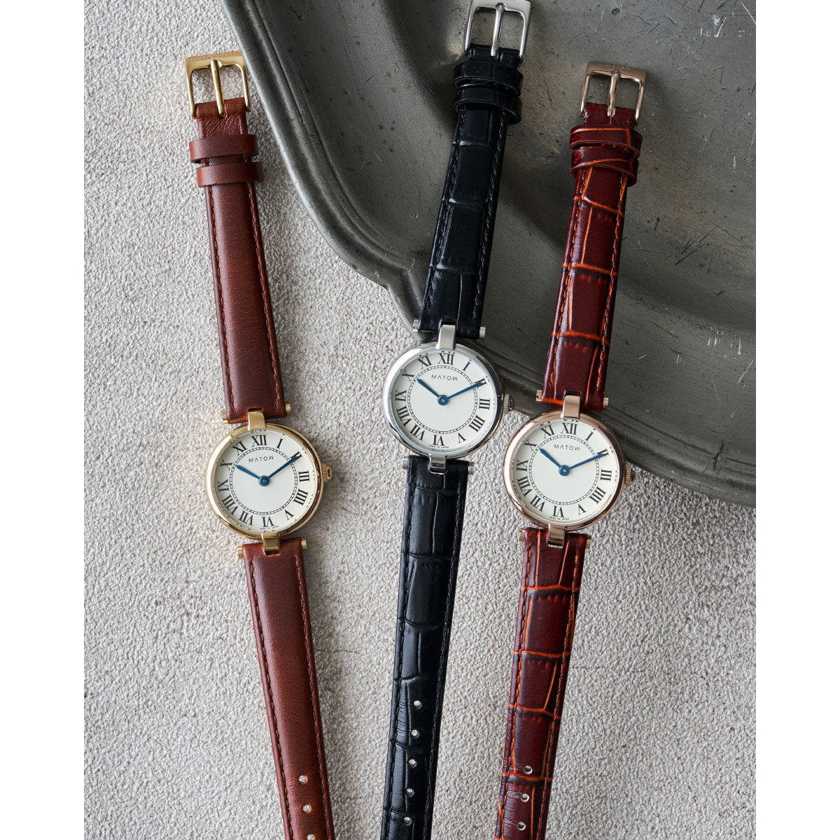 「Aura」は、時を重ねることで生まれる気配や、装いに自然と溶け込む存在感から着想を得たコレクション。端正なラウンドケースに、クラシカルなローマ数字の文字盤、そしてやわらかな表情を持つレザーストラップを組み合わせ、手元に静かな品格をもたらします。過度な装飾を施さず、光の当たり方や所作によって印象が変わるデザインは、身に着ける人それぞれの雰囲気をそっと引き立てるもの。MATOWが5年間大切にしてきた「時間を慈しむ」という価値観を、よりシンプルで本質的なかたちへと昇華したコレクションです。