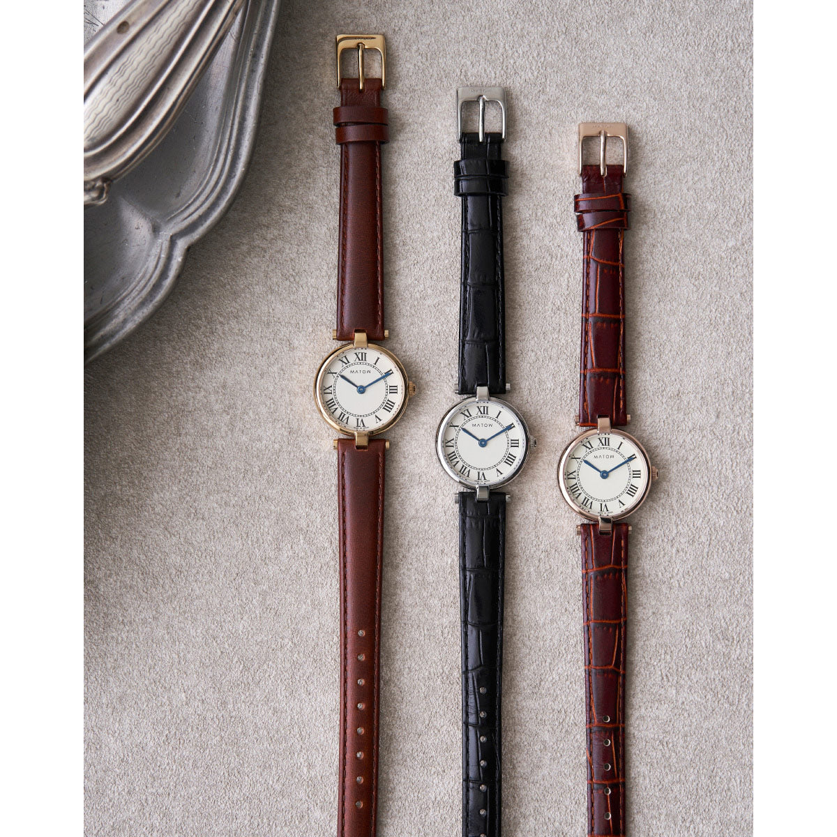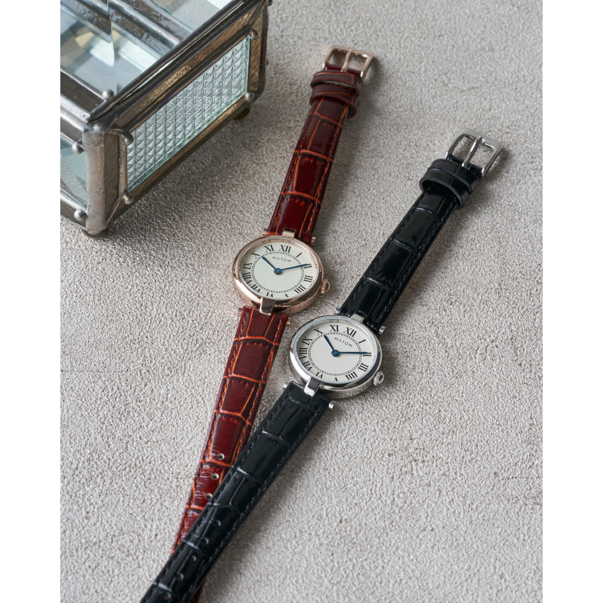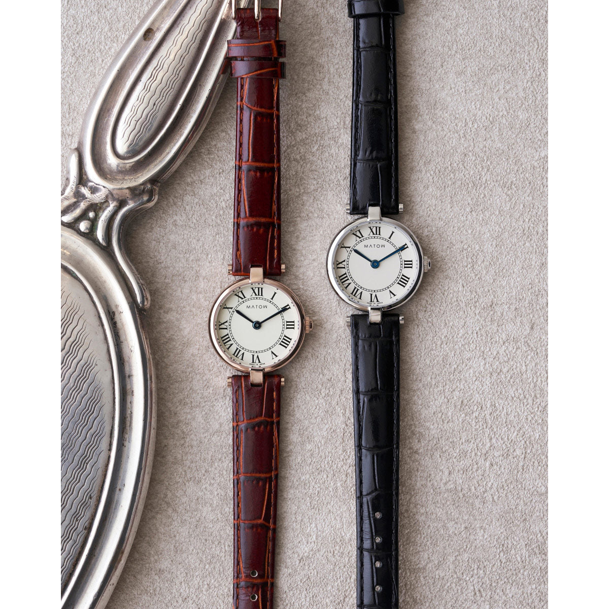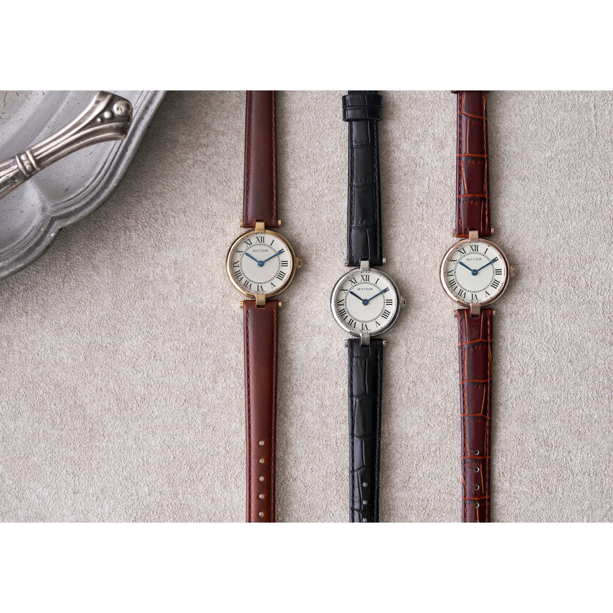 「Aura」は、時を重ねることで生まれる気配や、装いに自然と溶け込む存在感から着想を得たコレクション。端正なラウンドケースに、クラシカルなローマ数字の文字盤、そしてやわらかな表情を持つレザーストラップを組み合わせ、手元に静かな品格をもたらします。過度な装飾を施さず、光の当たり方や所作によって印象が変わるデザインは、身に着ける人それぞれの雰囲気をそっと引き立てるもの。MATOWが5年間大切にしてきた「時間を慈しむ」という価値観を、よりシンプルで本質的なかたちへと昇華したコレクションです。