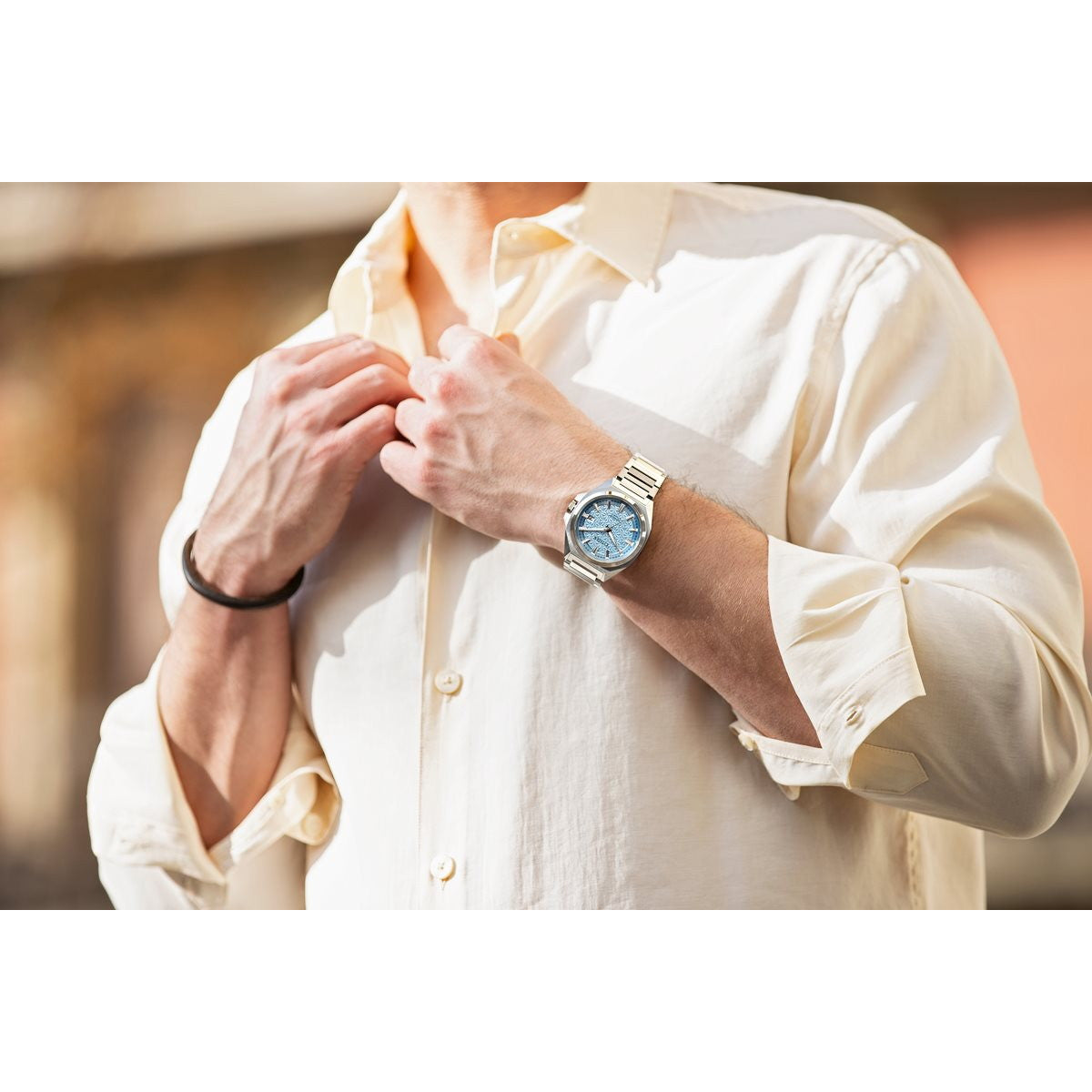 機能と実用性を兼ね備えたモダンデザインの機械式時計ブランド「Series 8(シリーズエイト)」。“陽射しを浴びて煌めく美しい海”をテーマにした、「831 Mechanical」の限定モデルが登場。アイスブルーの文字板が、爽やかで優雅な時間を演出します。透き通るような海の色をイメージしたアイスブルーの文字板に、光の屈折で輝く水面を幾何学模様のパターンで表現しました。限定モデルならではの特別な仕様となっています。裏ぶたは2024年10月にリニューアルして発売した、「831 Mechanical」のレギュラーモデルと同様のシースルーバック仕様。