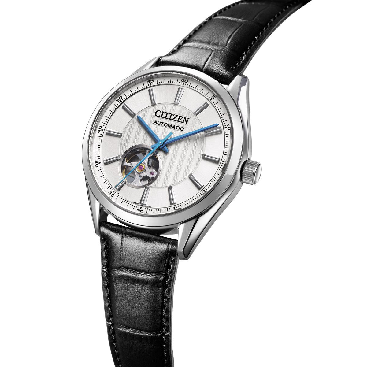 人気の高いメカニカルウオッチが新デザインで登場。クラシカルな印象が際立つ革バンドモデル。文字板7時の位置から、メカニカルウオッチの心臓部であるテンプの繊細な動きを堪能できるオープンハート仕様です。文字板の中央部分に描かれた縦基調のパターンが、クラシカルな表情を強調。時刻を合わせる際、りゅうずを引き出すと秒針が止まる「秒針停止機能」を搭載したキャリバーを採用しています。