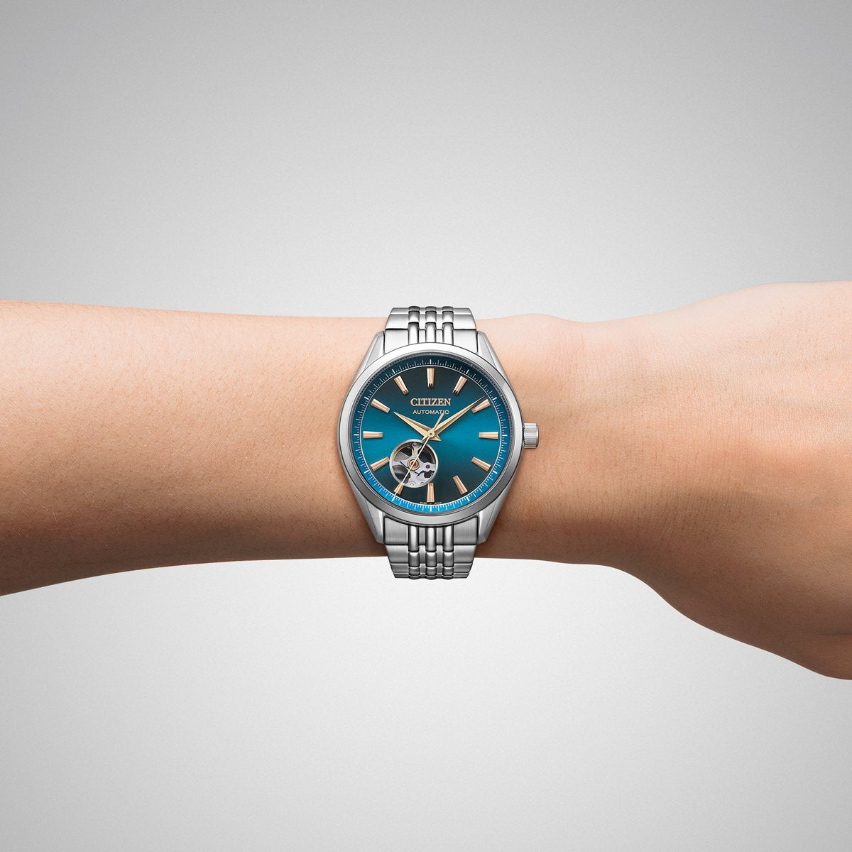 中国で生まれ、日本の伝統色としても知られる瑠璃色の一種、「金碧珠(きんぺきしゅ)」をテーマにした、日本国内限定のメカニカルモデル。金碧とは金色と青緑色の組み合わせを意味し、大海から朝日が昇る様子を表しています。NH9111-54L・PC1010-52Lは、ペアウオッチにもできるオープンハート仕様。青く広がる美しい海から金色の朝日が昇る情景を描いた文字板。深みのある青のグラデーションにピンクゴールドのインデックスを組み合わせた、上品で華やかなデザインです。ミラー&ホーニング仕上げの針を採用し、視認性を確保。裏ぶたは、回転する錘(おもり)やメカの動きを楽しめるシースルーバック仕様です。