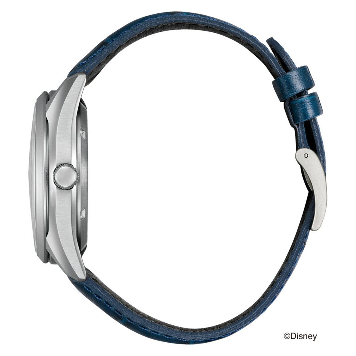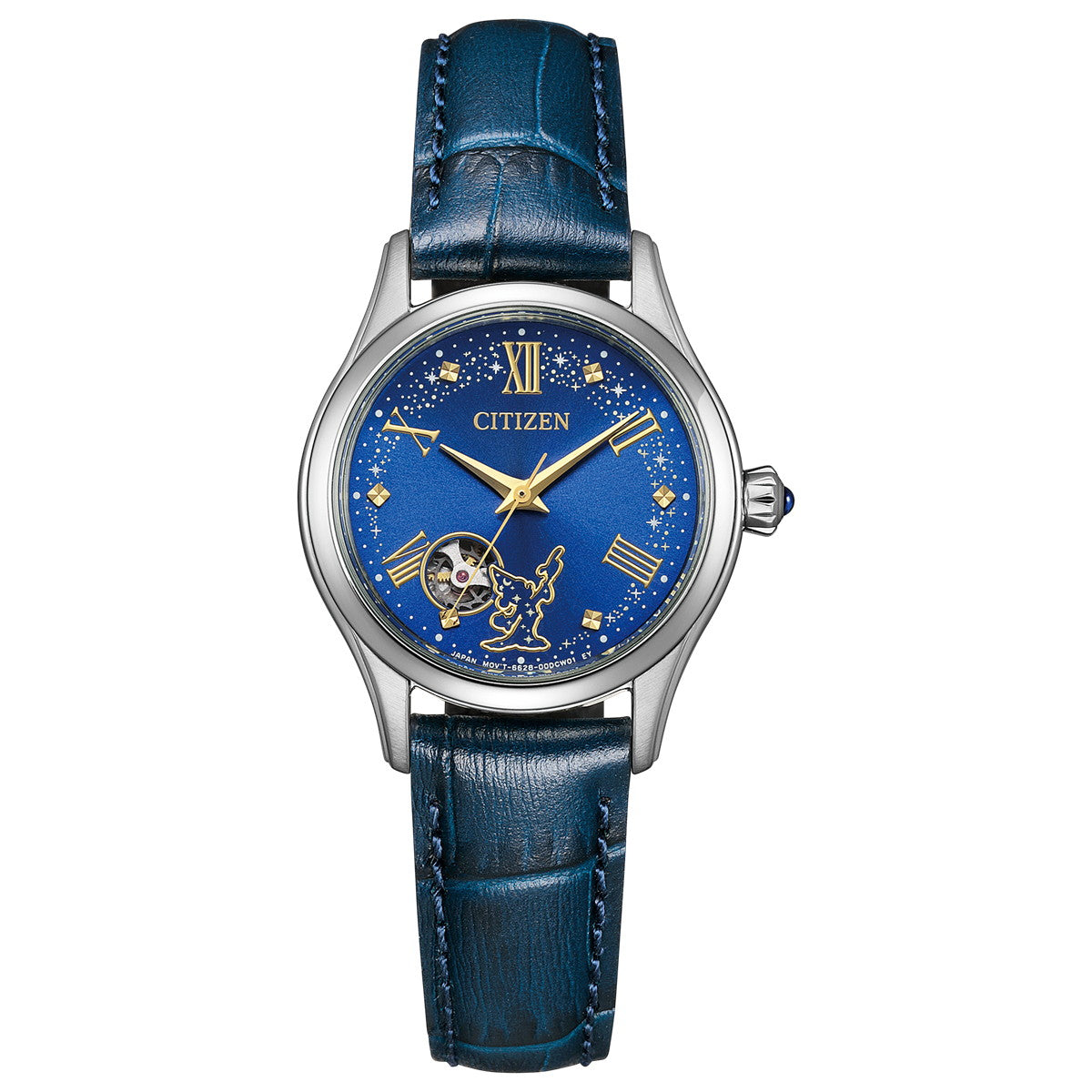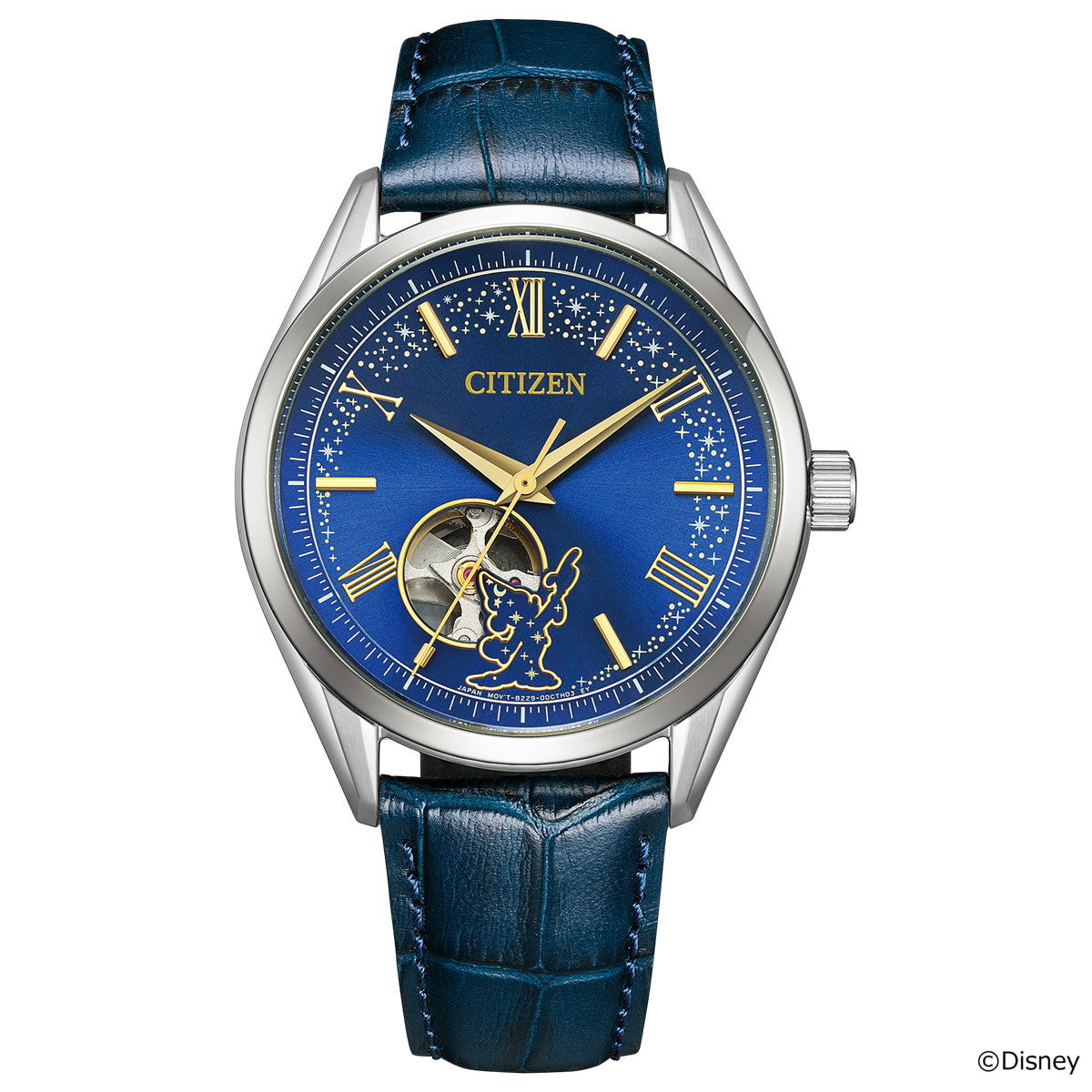 幸せな瞬間を、共に過ごしていきたい。そんな想いを込め、シチズンがブランドを超えてデザインしたディズニーコクションが登場。それぞれのキャラクターたちを表現した特別なデザイン。手に取った瞬間、喜びと美しさに彩られた時間が始まります。モチーフ:『Disney FANTASIA』不朽の名作『FANTASIA(ファンタジア)』の世界観を表現したメカニカルウオッチのペアモデル。美しい夜空をイメージしたネイビーの文字板を使い、「ミッキー」の魔法が輝く様子を表現しています。6時の位置で「ミッキー」のシルエットをオープンハートに重ね、時計との一体感を演出。魔法使いの弟子に扮した「ミッキー」の帽子には、星と月のモチーフもさりげなく描かれています。メンズモデルの裏ぶたはシースルーバック。回転する錘(おもり)やメカの動きを楽しめます。レディスモデルのりゅうずには夜空をイメージしたブルーのワンポイントをプラス。裏ぶたには「ミッキー」のシルエットが入っています。
