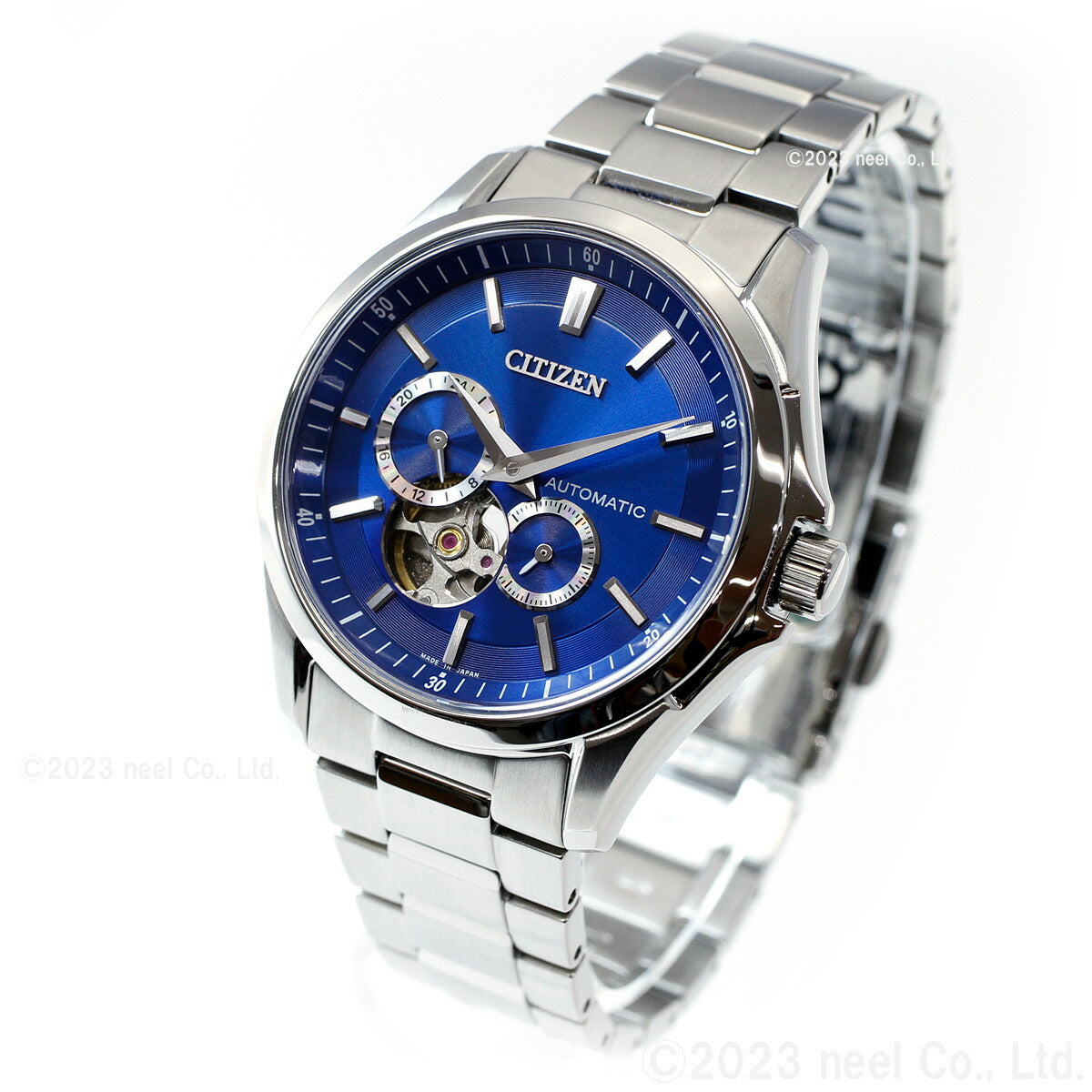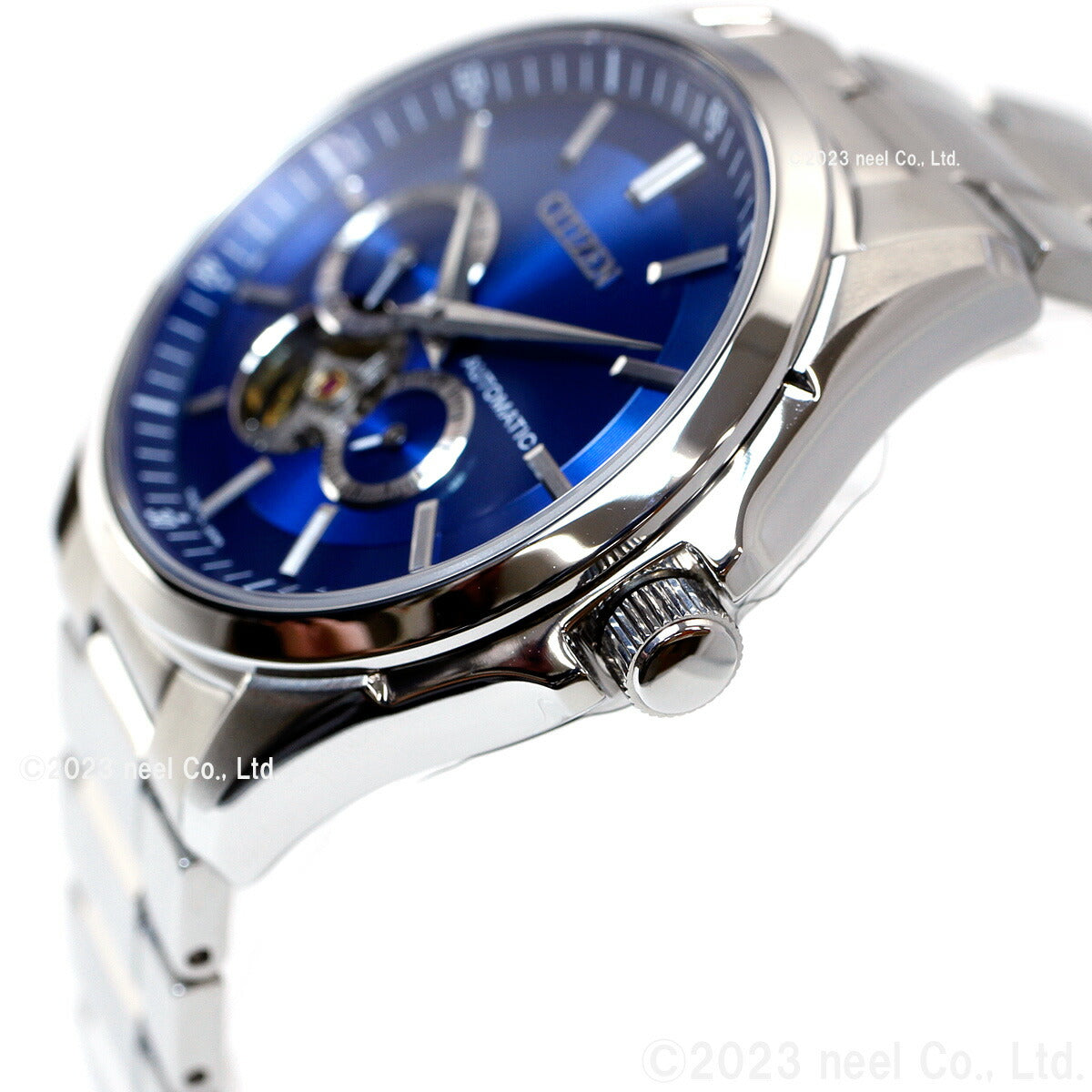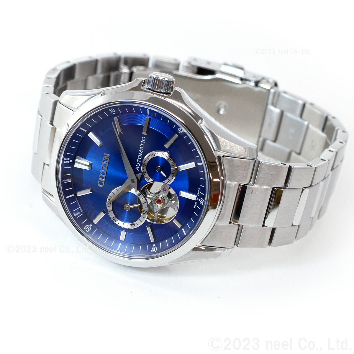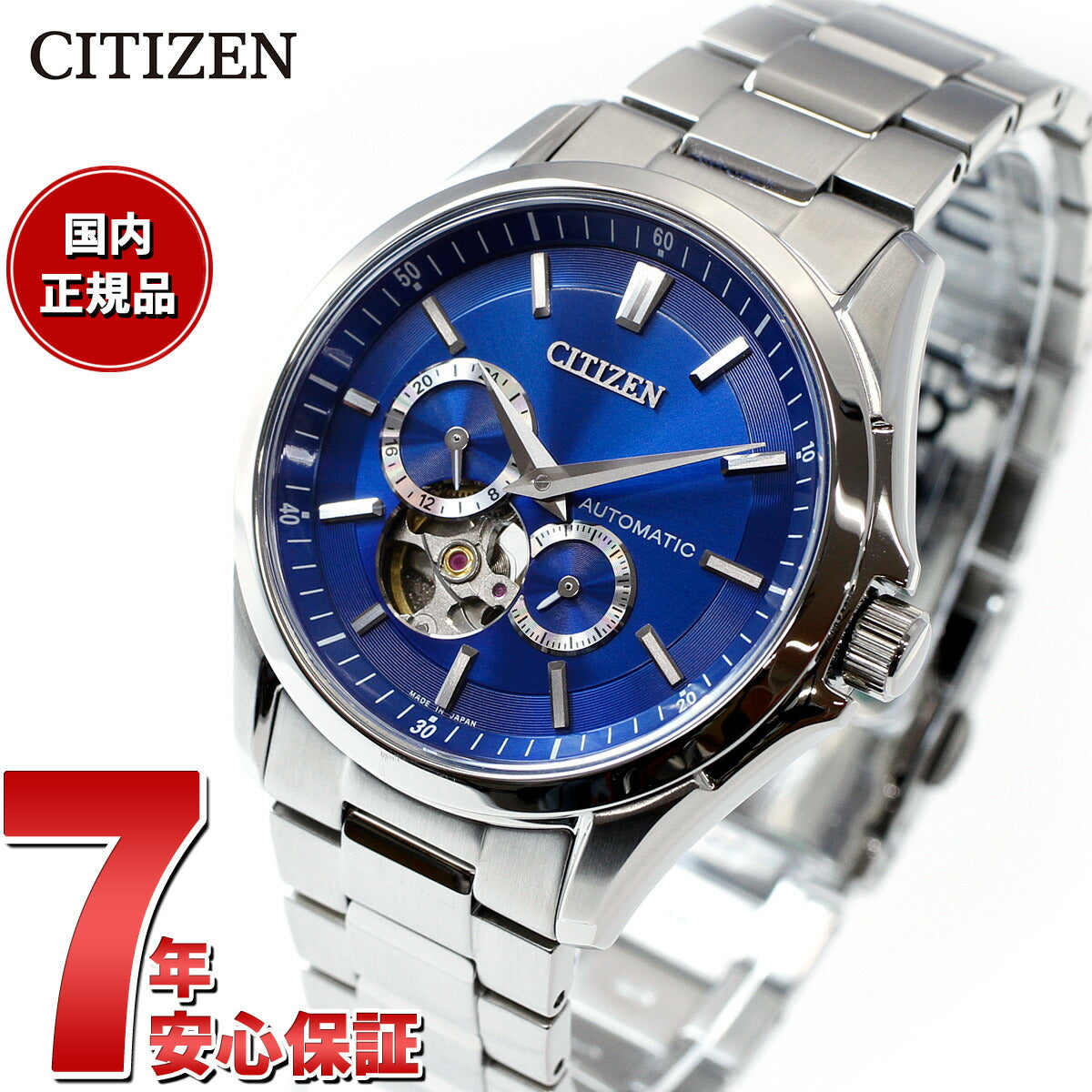 秒停止機能を搭載したキャリバーを搭載。シチズンコレクションのメカニカルウオッチがデザインをリニューアルしました。2つの別体リングを組み合わせた立体感、重厚感のあるデザイン。60秒針仕様のサブダイヤルなど、こだわりの機能を搭載しています。文字板7時の位置から、メカニカルウオッチの心臓部であるテンプの繊細な動きを堪能できるオープンハート仕様です。裏ぶたは、回転する錘(おもり)部分とメカの動きを楽しめるシースルーバック。ご自身で、簡単にバンドのサイズが調整できるシンプルアジャスト仕様です。