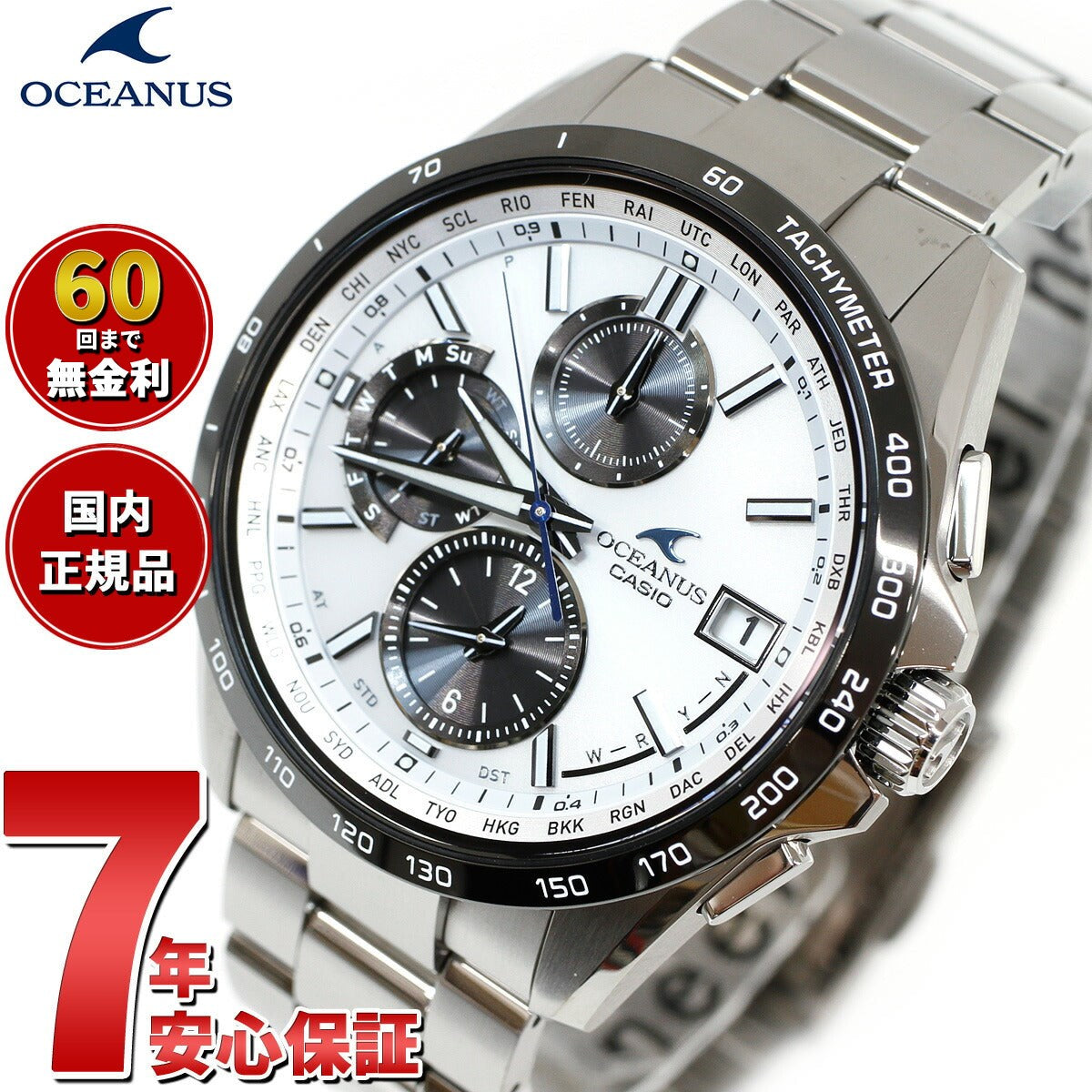 “Elegance、Technology”をブランドコンセプトに、上質と多機能を追求しているOCEANUSのクラシックラインです。ダイアルはクロノグラフの視認性を高める、ブラックとホワイト色を採用しています。タキメーター付きのベゼルがスポーティな印象を与えるだけでなく、DLCを施すことで堅牢性も高めています。両面反射防止コーティングを施したサファイアガラスや、ザラツ研磨、チタンカーバイトにより表面硬化処理を施したケース・バンドなど美しさを追求しています。更にデュアルダイアルワールドタイムを搭載。簡単にワールドタイムの都市変更ができ、サマータイムも自動で設定されます。