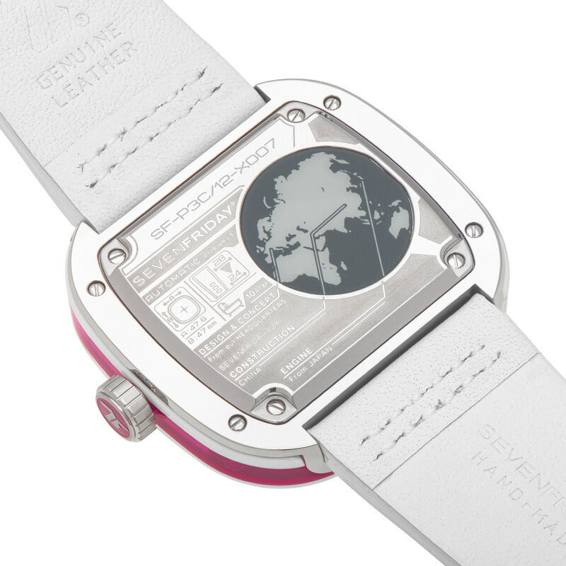P3C/12は人気シリーズBEACH CLUBの2022年モデル。ステンレススチール製のベゼルに、ホワイトのアニメーションリング。そして中央には、SEVENFRIDAYのサングラスにも使われるバイオプラスチック「トランスルーセントアセテート」を採用。ターコイズ&リップスティックピンクのアクセントが、ダイヤルの各所やリューズにちりばめられています。この夏、ターコイズの海へ飛び込むもよし、真っ白なテラスでリップを引き、シャンパン片手に特別な瞬間を楽しむもよし。遊び心溢れるこの2本、ぜひ手に取ってみてください。