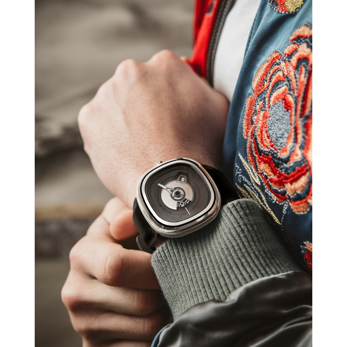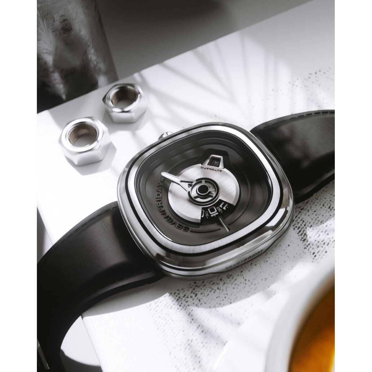 | ベゼル溝ラインにマットブラックBerlacラッカー充填 ポリッシュ&サンレイブラッシュ仕上げケースバック(NFCチップ内蔵、SEVENFRIDAYアプリと連携し認証&登録が可能) 4層構造ダイヤル・ブラックのインナースロープソフトタッチ仕上げプレート(ハイレリーフロゴ&サークルライン) アウターリングはガルバニックガンメタル(ポリッシュ&サンレイブラッシュ仕上げ) 9時位置マーカーはガルバニックブラックオパリンのアウトライン&グロッシーホワイトの塗り ガルバニックブラックのサンドブラスト仕上げベースプレート&ロジウム仕上げのセンタープレート(45°ブラッシュ) 9時位置に65°アングルのオープニング アワーディスク:ガルバニックブラックオパリン(レリーフプリントのグロッシーホワイト数字&トラック) ミニッツハンド:微細サンドブラスト仕上げロジウム(マットブラックディテール&ホワイトルミナス塗装ポインター) セコンドハンド:微細サンドブラスト仕上げロジウム(マットブラックサークル) | |