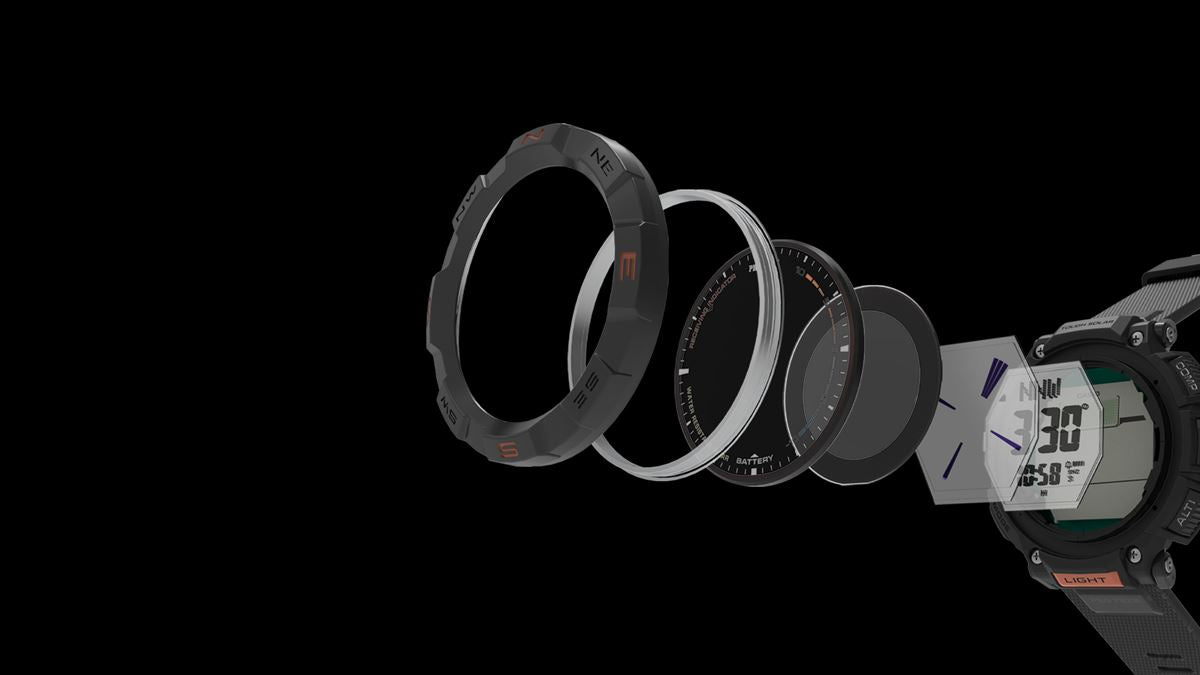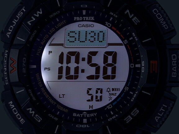 自然を愛する人の本格アウトドアギアPRO TREKから、環境に優しいエコ素材を採用した、ソーラーのPRG-340のご紹介です。腕なじみの良い装着性はそのままに、環境に配慮したバイオマスプラスチックを採用。ケースとウレタンバンド、樹脂製の裏蓋に使用しています。バイオマスプラスチックとは、原料として再生可能な有機資源由来の物質を含み、化学的または生物学的に合成することにより得られる高分子材料で、循環型社会の実現に向け環境負荷低減が期待されている素材です。ケースと裏蓋にはヒマシ油、バンドにはトウモロコシを原料としたバイオマスプラスチックを採用しました。時計液晶部には、デュプレックスLCDを採用しました。方位表示部と時計機能表示部の液晶を別にしたデュプレックスLCDにより、コンパス表示を大型化し、判読性を高め、より方角が分かりやすい機能美あるデザインで表現しています。更に簡易方位メモリーに役立つ回転ベゼルを採用しています。また、圧力センサーをケースの内側に搭載することで、ケースの凹凸を減らしボタンが操作しやすい形状となっています。機能感あるデザインによりアウトドアギアらしい表情を醸し出します。タフソーラーにより、様々なシーンで対応する高い機能性と実用性を詰め込んだモデルとなっています。