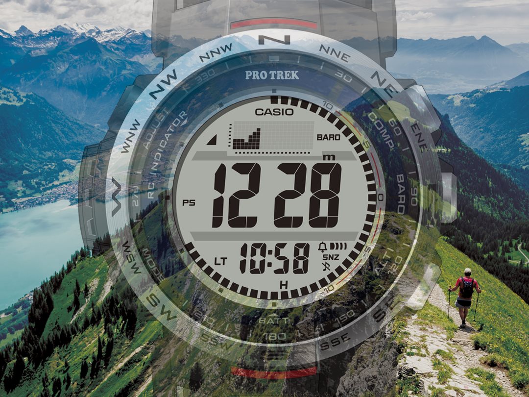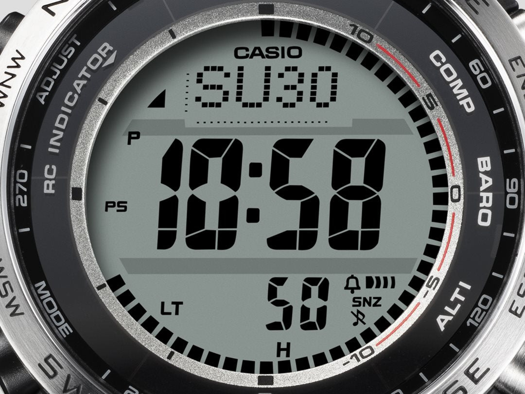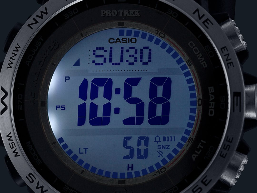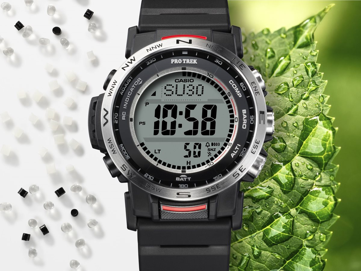 自然を愛する人の本格アウトドアギアPRO TREKクライマーラインから、環境に配慮されたエコ素材を採用し、直感的な操作が可能なデジタルモデルのPRW-35のご紹介です。バンドは、環境に配慮したバイオマスプラスチック素材のソフトウレタンバンドとなっています。ケースと樹脂製の裏蓋にもバイオマスプラスチックを使用し、軽量化を図りました。また、蒸れを防ぐスリット穴を設け腕への装着性を向上しました。時計右側に方位、気圧/温度、高度をワンプッシュで計測できる大型のダイレクトボタンを配し、計測結果を数値でデジタル表示。各ボタンの近くに、瞬時に機能を認識できるよう方位・気圧・高度を示す機能表記を採用し、過酷なアウトドアシーンにおいても、直感的に必要な情報を計測、把握できます。また、STN液晶やボールドフォントを採用し視認性を向上させています。計測機能に加えタフソーラーや電波受信機能、10気圧防水等の基本性能も搭載し、過酷なシーンでも使用できます。