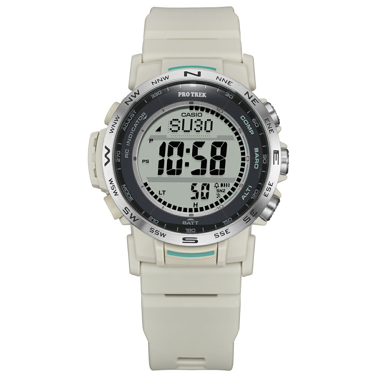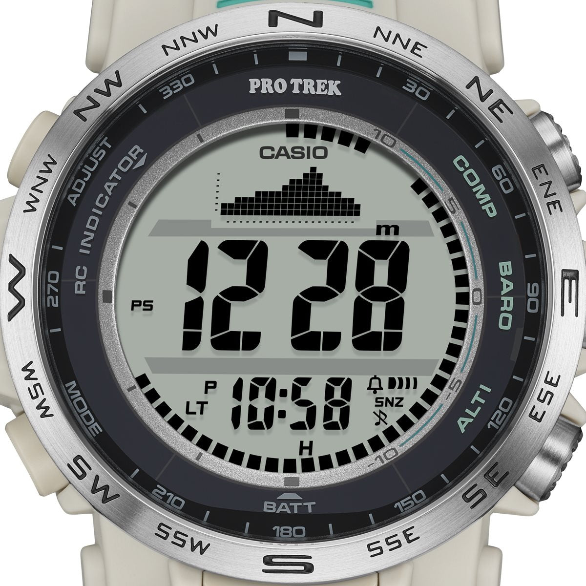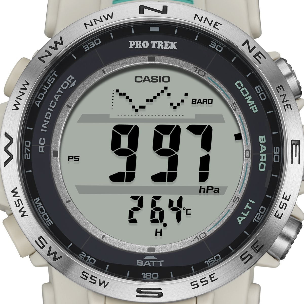 自然を愛する人の本格アウトドアギアPRO TREKクライマーライン。本モデルは環境に配慮されたエコ素材を採用し、直感的な操作が可能なデジタルウオッチです。ソフトウレタンバンドやケース、樹脂製の裏蓋にバイオマスプラスチックを使用。また、蒸れを防ぐスリット穴を設け腕への装着性を向上しました。大型のダイレクトボタンにより、方位、気圧/温度、高度をワンプッシュで直感的に計測、把握できます。また、STN液晶やボールドフォントを採用し、視認性を向上させています。計測機能に加えタフソーラーや電波受信機能、10気圧防水等の基本性能も搭載し、過酷なアウトドアシーンでも使用できます。