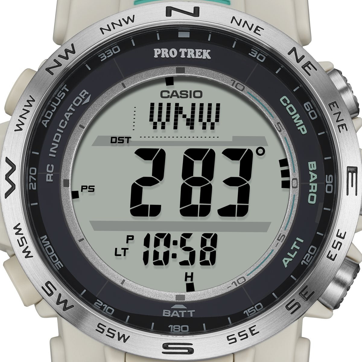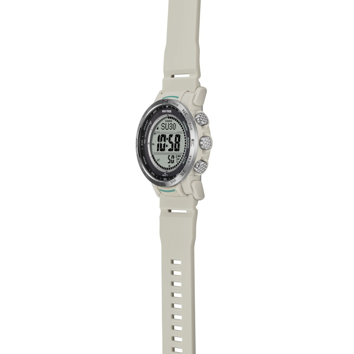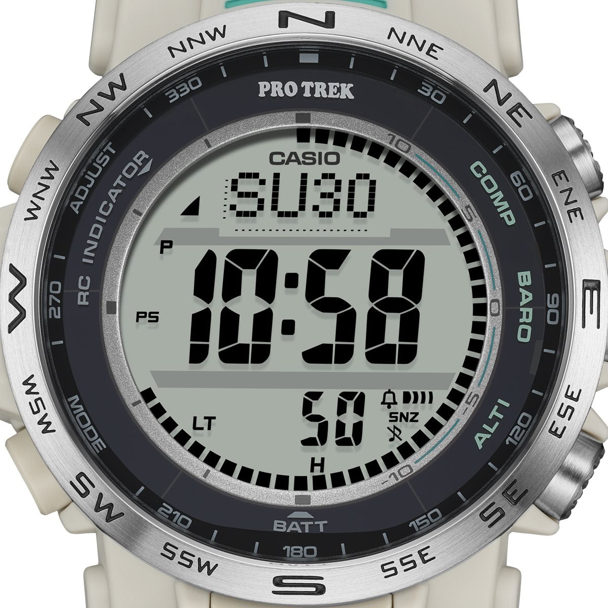 自然を愛する人の本格アウトドアギアPRO TREKクライマーライン。本モデルは環境に配慮されたエコ素材を採用し、直感的な操作が可能なデジタルウオッチです。ソフトウレタンバンドやケース、樹脂製の裏蓋にバイオマスプラスチックを使用。また、蒸れを防ぐスリット穴を設け腕への装着性を向上しました。大型のダイレクトボタンにより、方位、気圧/温度、高度をワンプッシュで直感的に計測、把握できます。また、STN液晶やボールドフォントを採用し、視認性を向上させています。計測機能に加えタフソーラーや電波受信機能、10気圧防水等の基本性能も搭載し、過酷なアウトドアシーンでも使用できます。